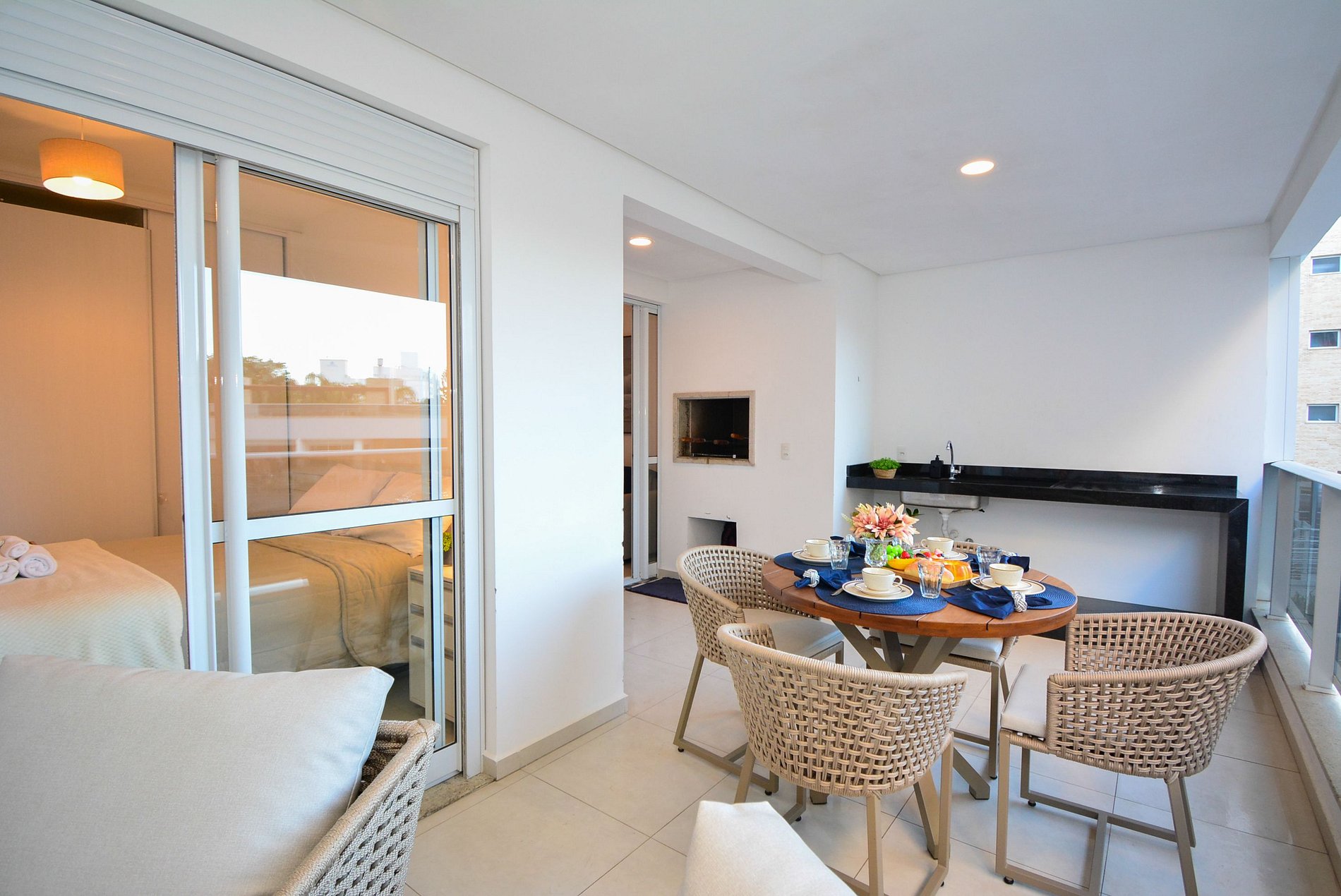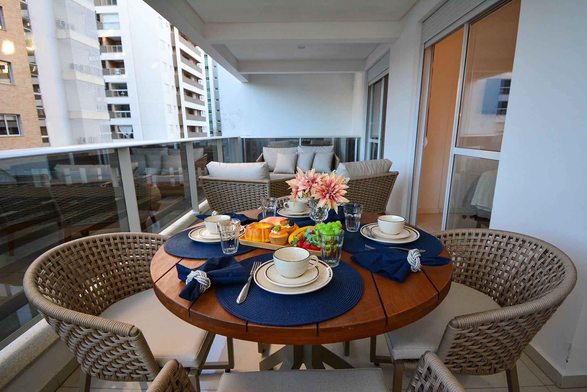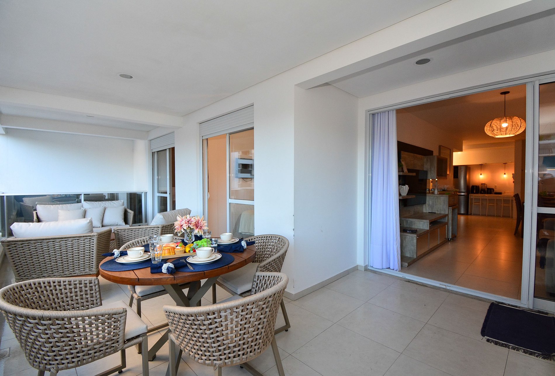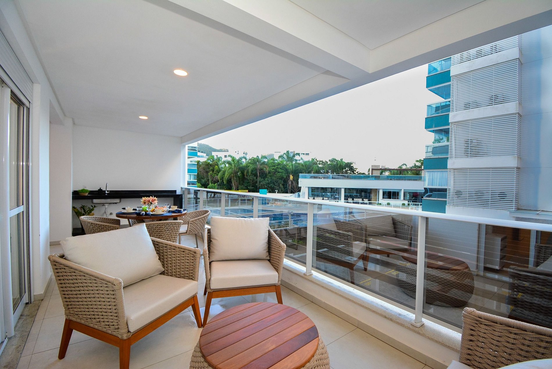 A estrela do apartamento é a sacada gourmet, ampla e convidativa, equipada com churrasqueira, mesa para compartilhar bons momentos e sofás para descansar após um dia de sol e mar. A vista para a piscina e o pátio interno do condomínio traz uma atmosfera relaxante e acolhedora.