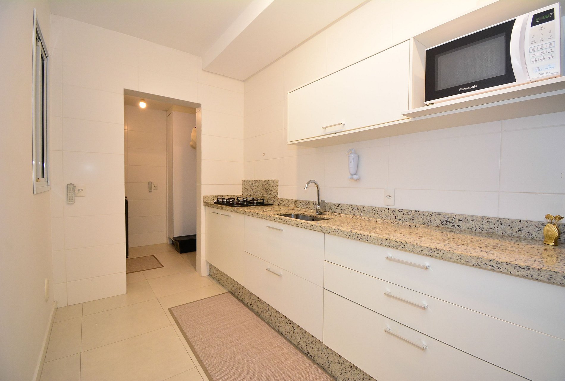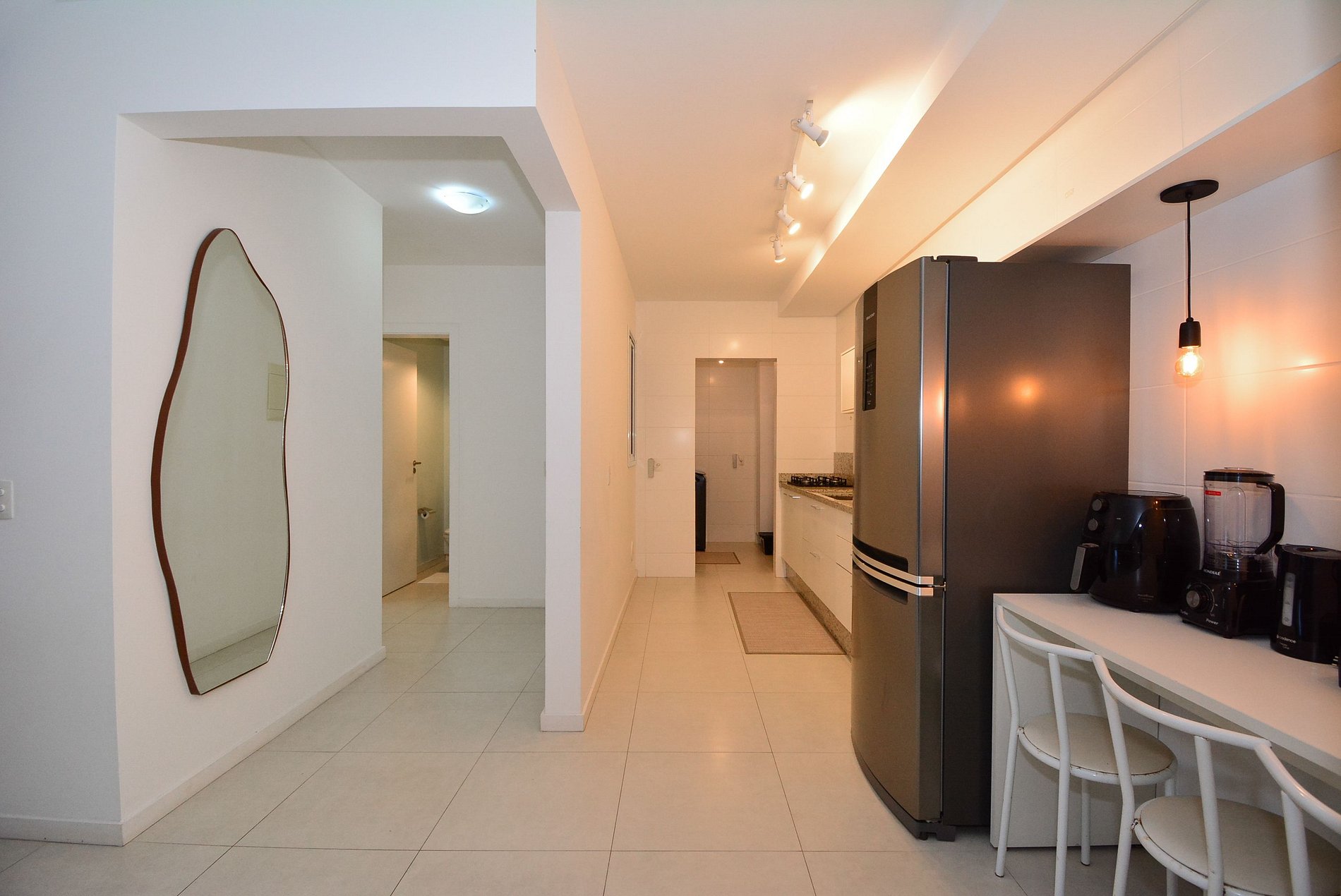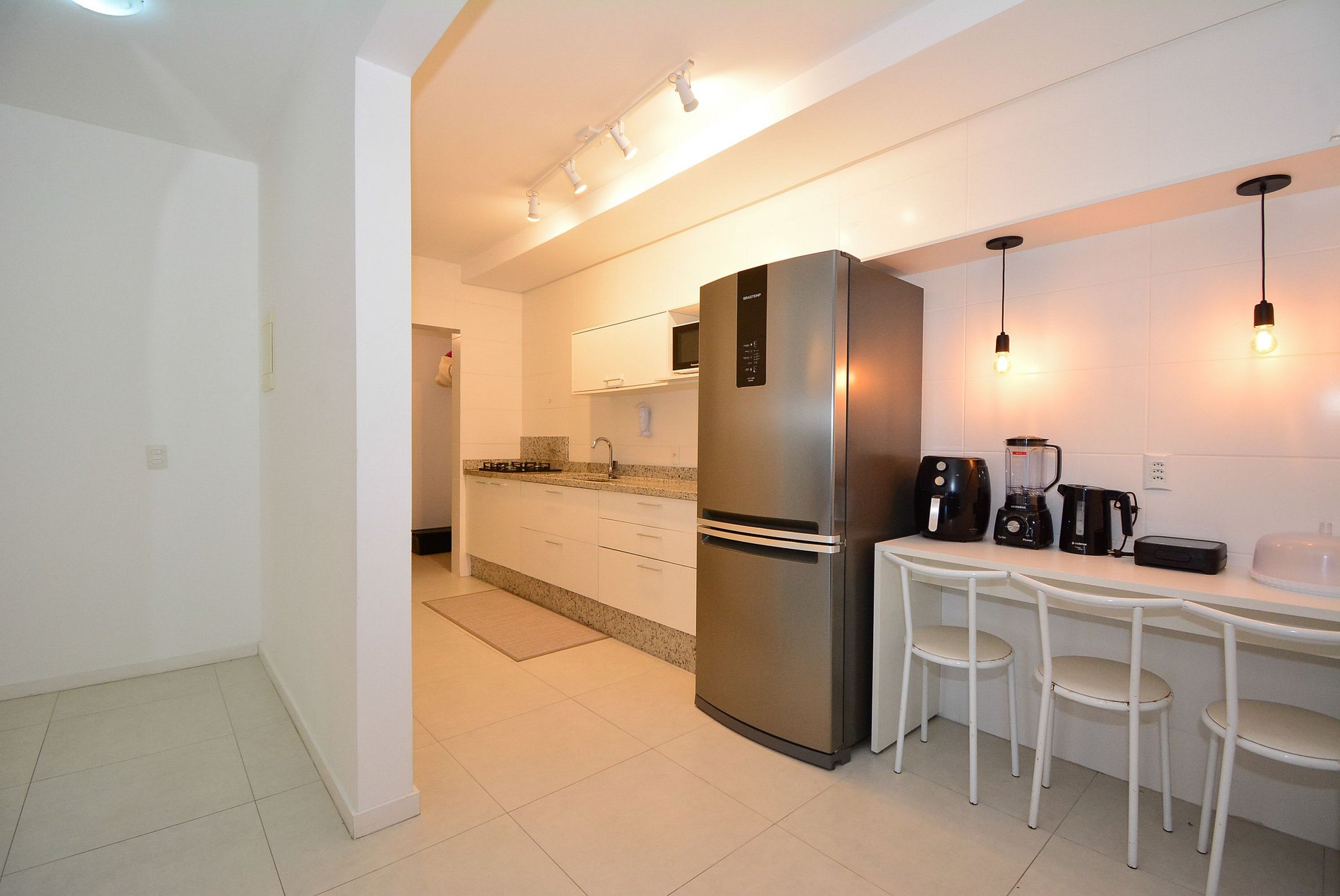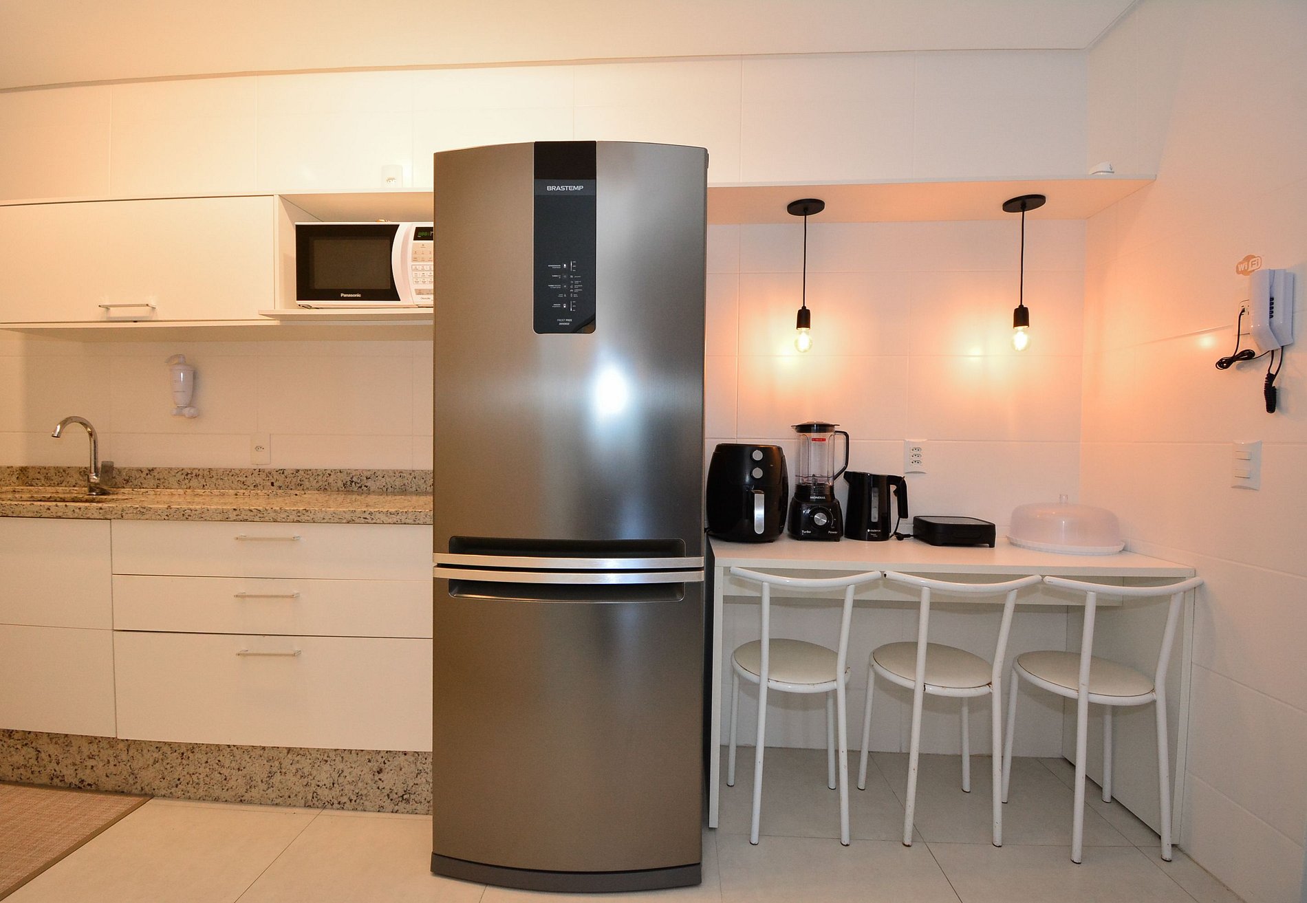 • Geladeira, fogão, micro-ondas, chaleira elétrica, liquidificador, sanduicheira, filtro de água, panelas variadas