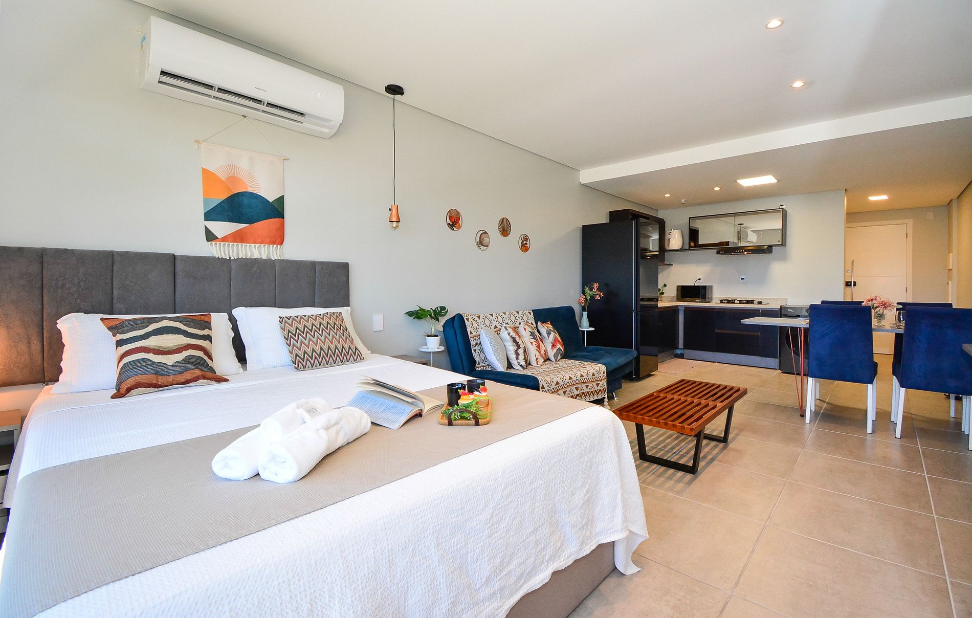 Este studio combina conforto e estilo, criando um ambiente acolhedor perfeito.