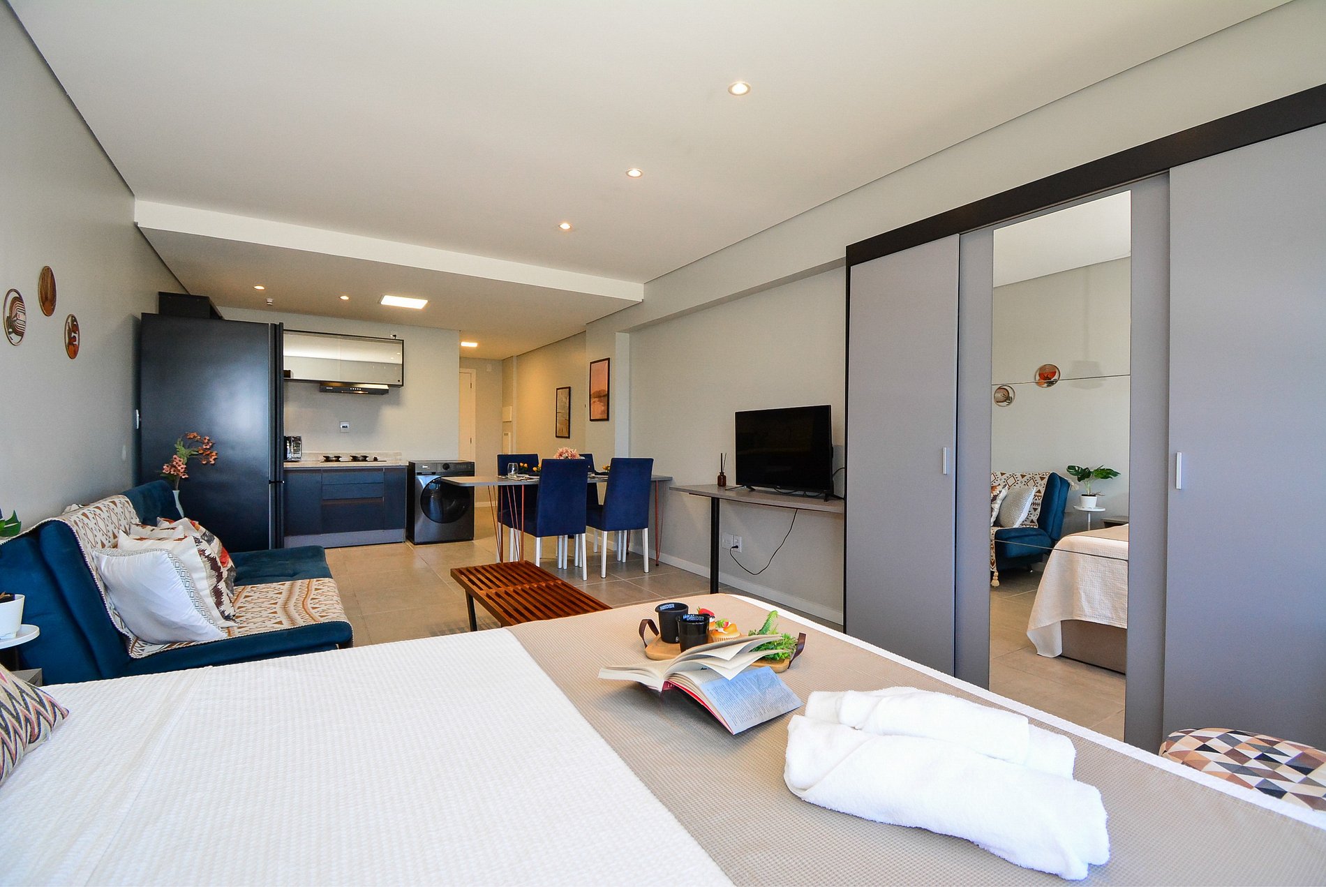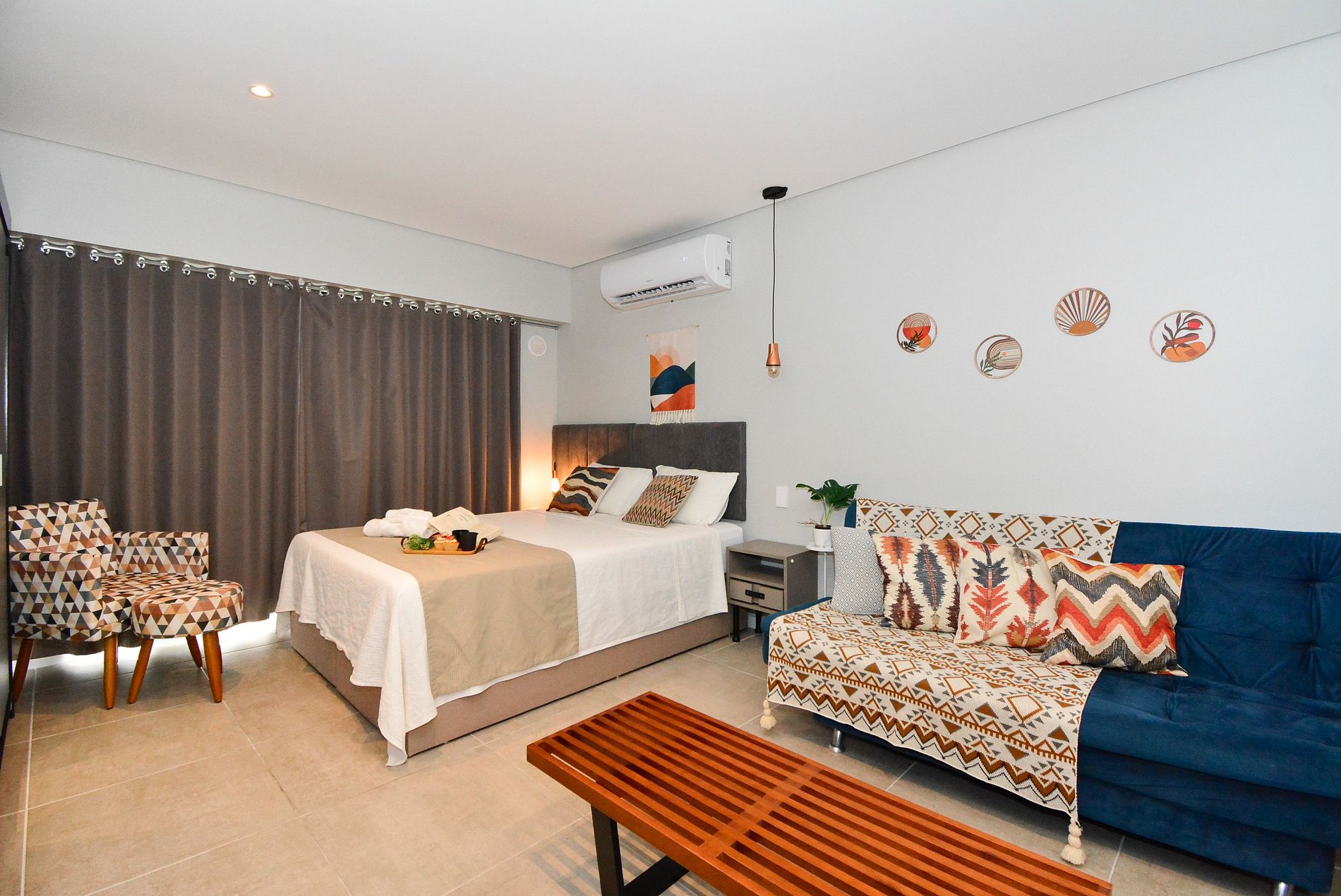 Este studio combina conforto e estilo, criando um ambiente acolhedor perfeito.