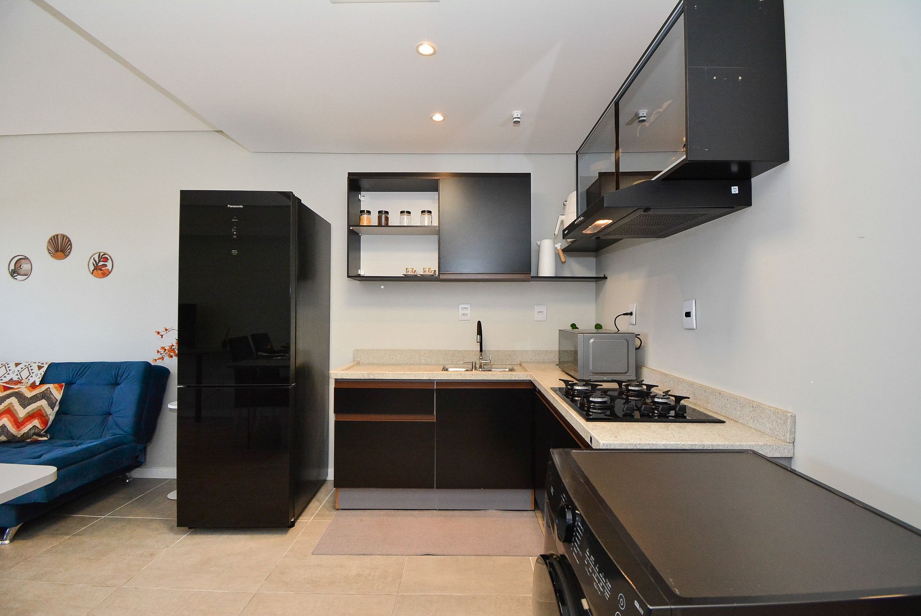 • Geladeira, fogão, chaleira elétrica, sanduicheira, cafeteira, airfryer, utensílios de cozinha, pratos, copos e xícaras