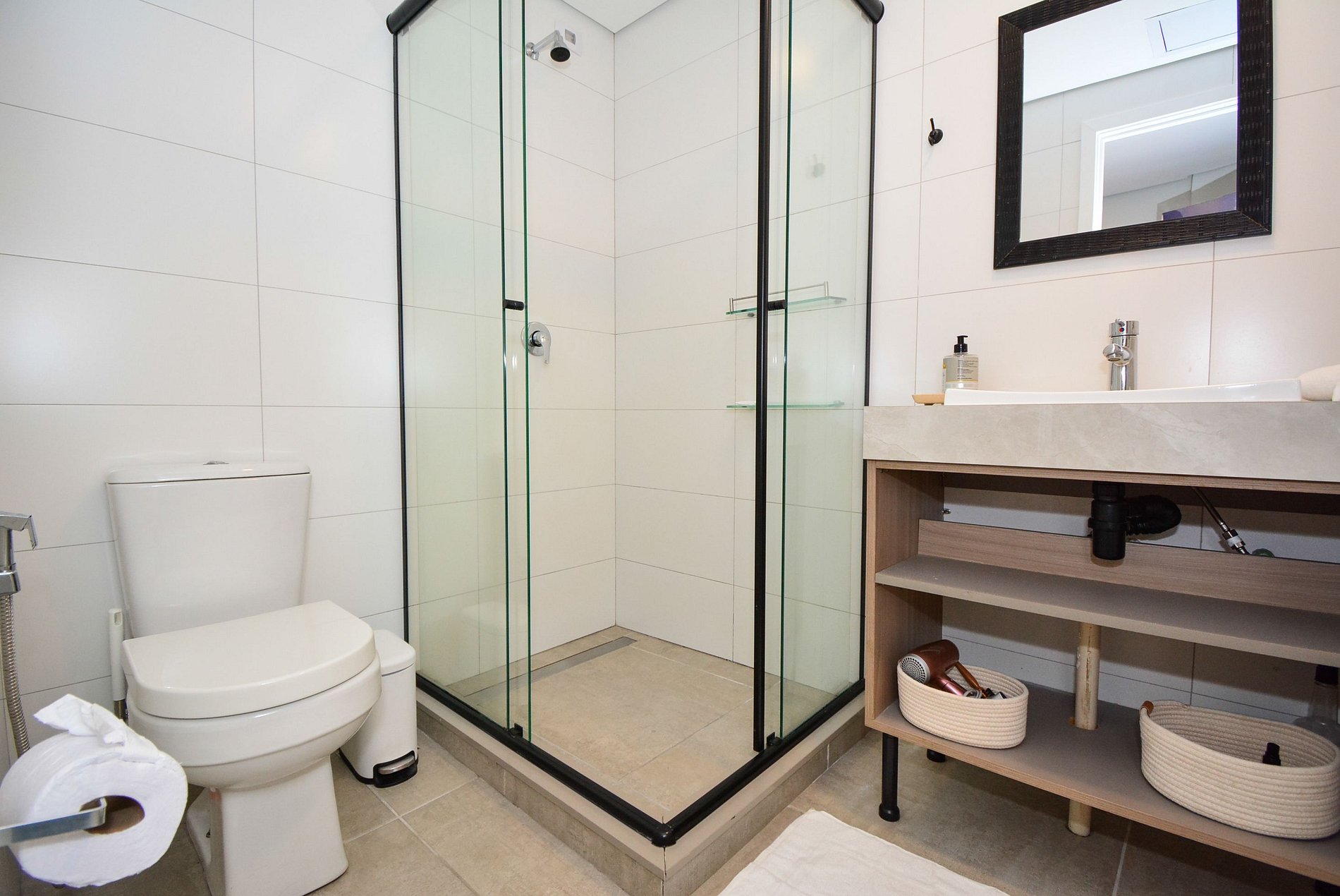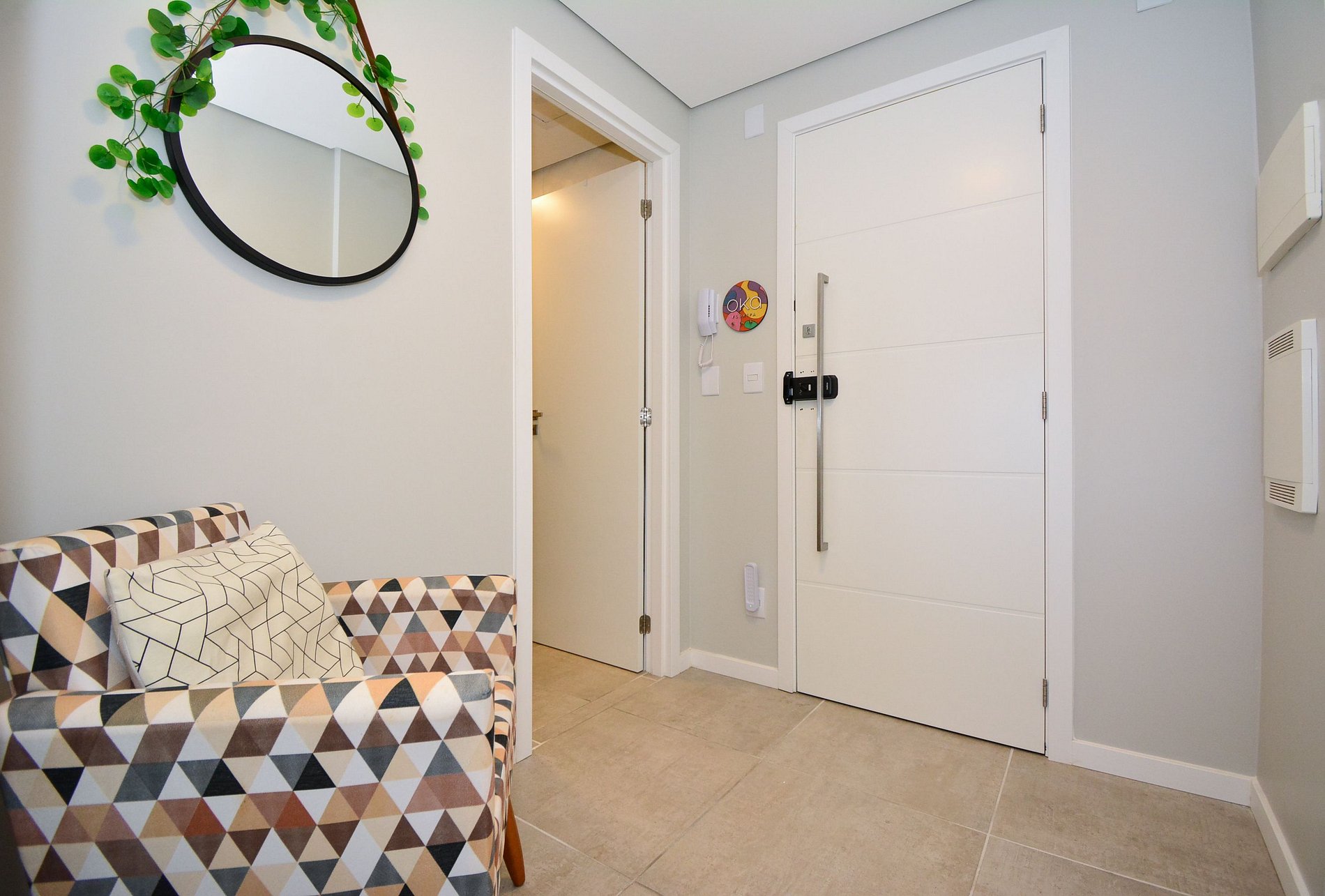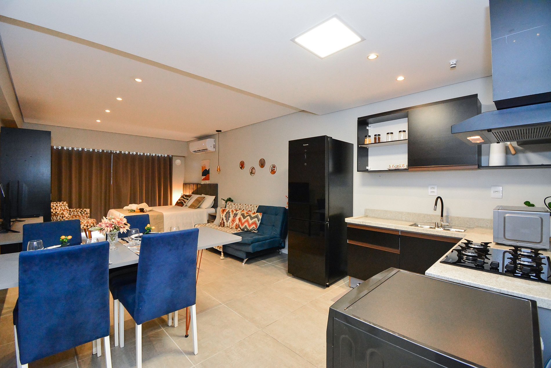 O acesso ao studio é feito por meio de fechadura eletrônica com senha personalizada, enviada antes da chegada, dispensando o uso de chaves físicas e oferecendo ainda mais praticidade.