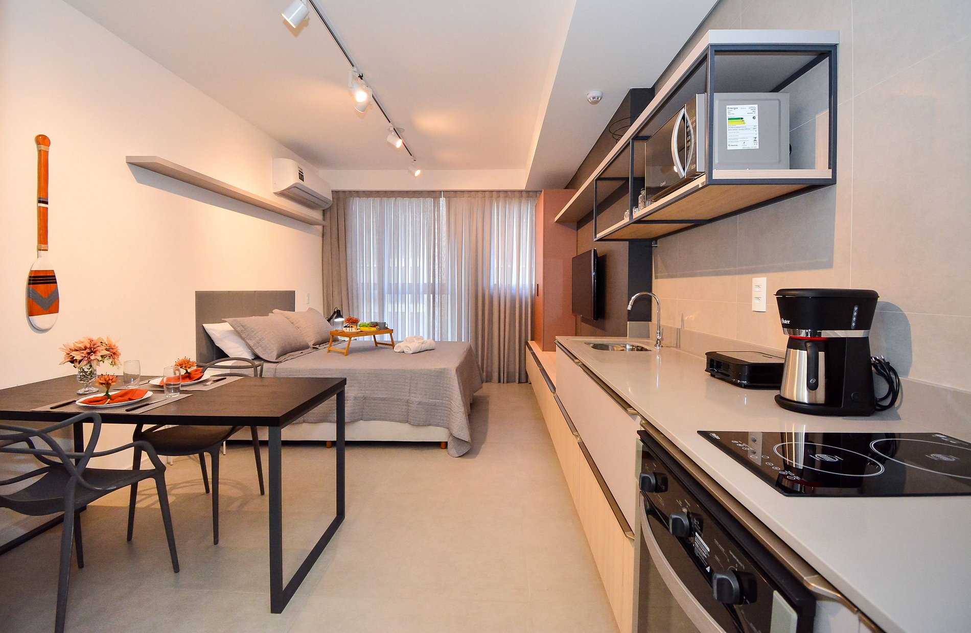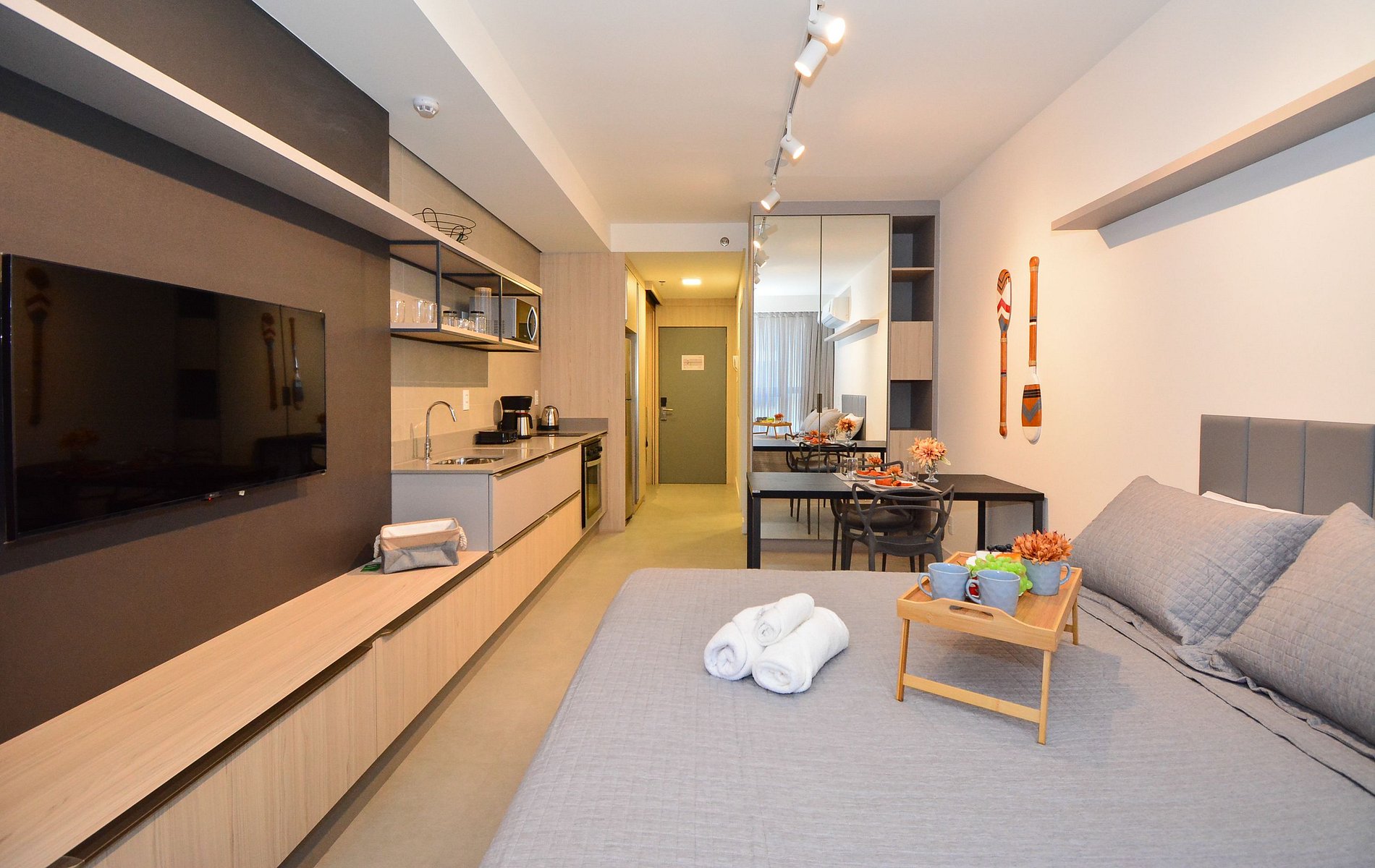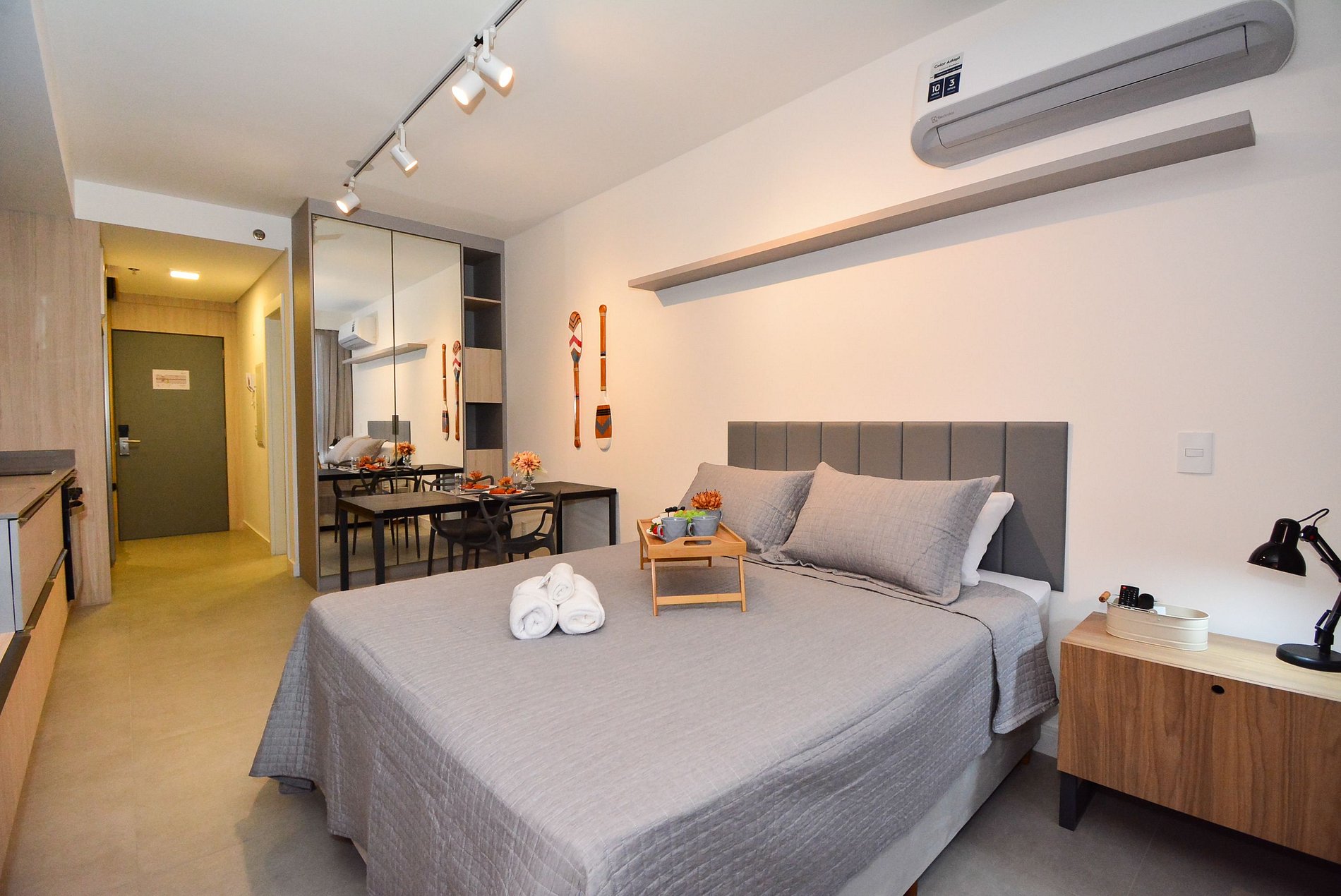 O acesso ao studio é feito por meio de fechadura eletrônica com senha personalizada, enviada antes da chegada, dispensando o uso de chaves físicas e oferecendo ainda mais praticidade.