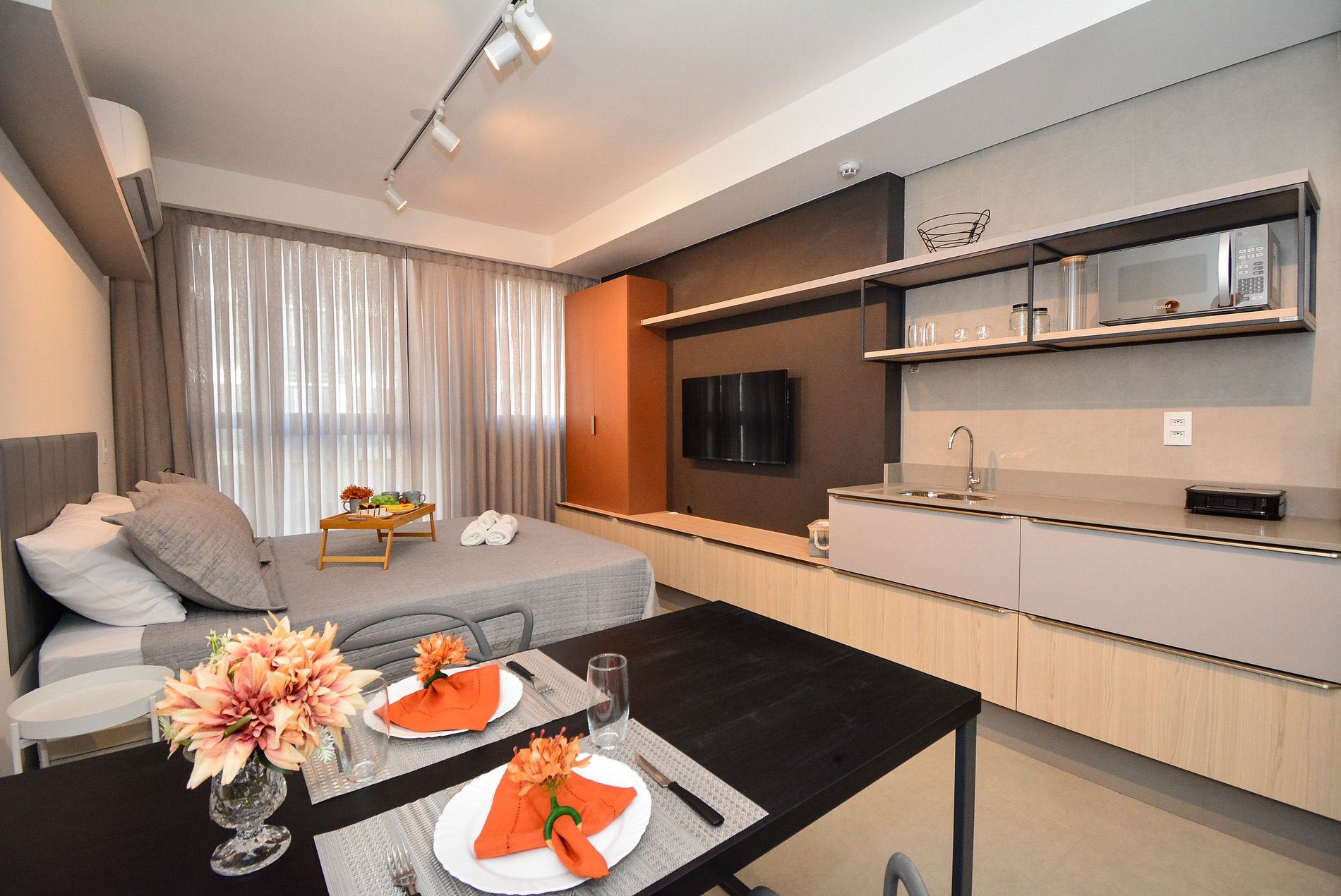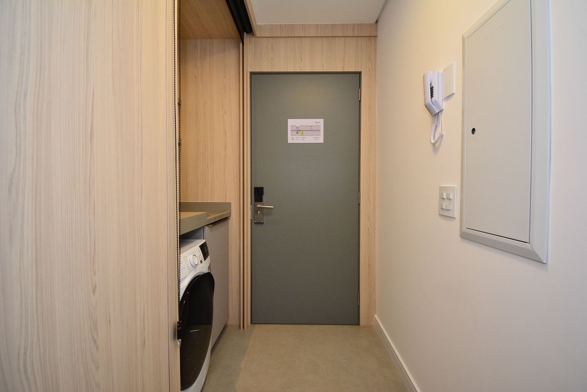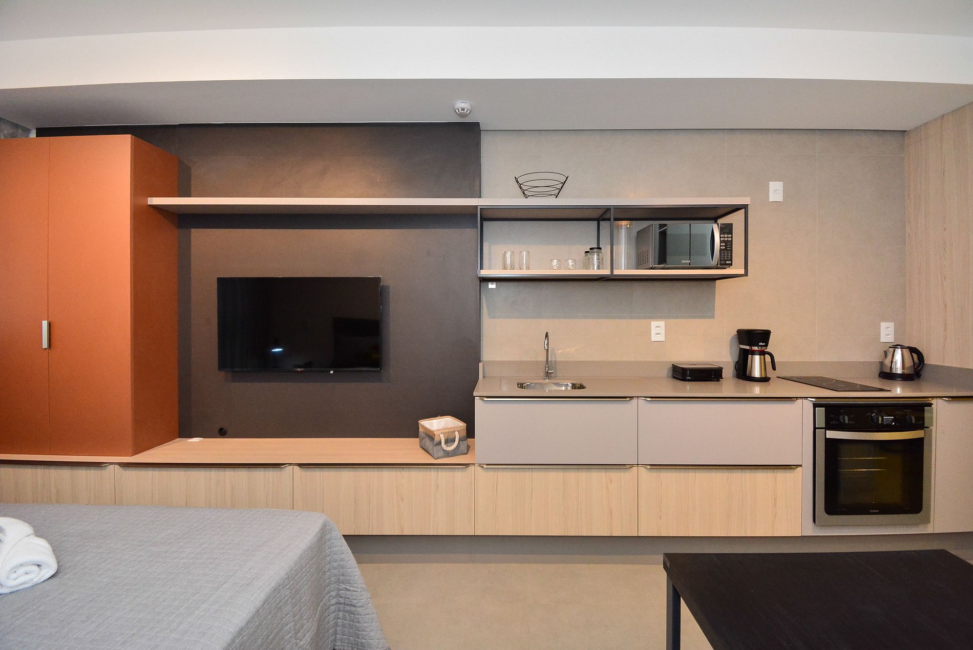 O acesso ao studio é feito por meio de fechadura eletrônica com senha personalizada, enviada antes da chegada, dispensando o uso de chaves físicas e oferecendo ainda mais praticidade.