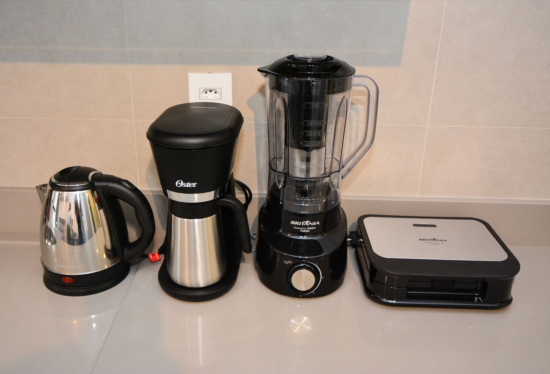 • Cooktop, micro-ondas, geladeira, chaleira elétrica, sanduicheira, liquidificador, panelas variadas.