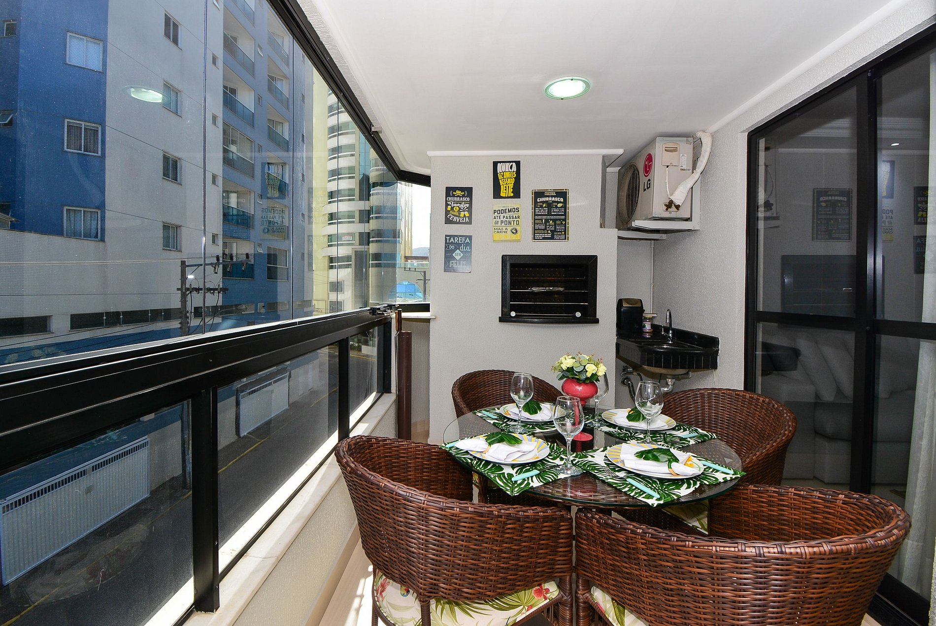 A área social é ideal para momentos de convivência, com sala de estar aconchegante, sacada com churrasqueira e vista parcial do mar, além de sala de jantar integrada com mesa para 6 pessoas.