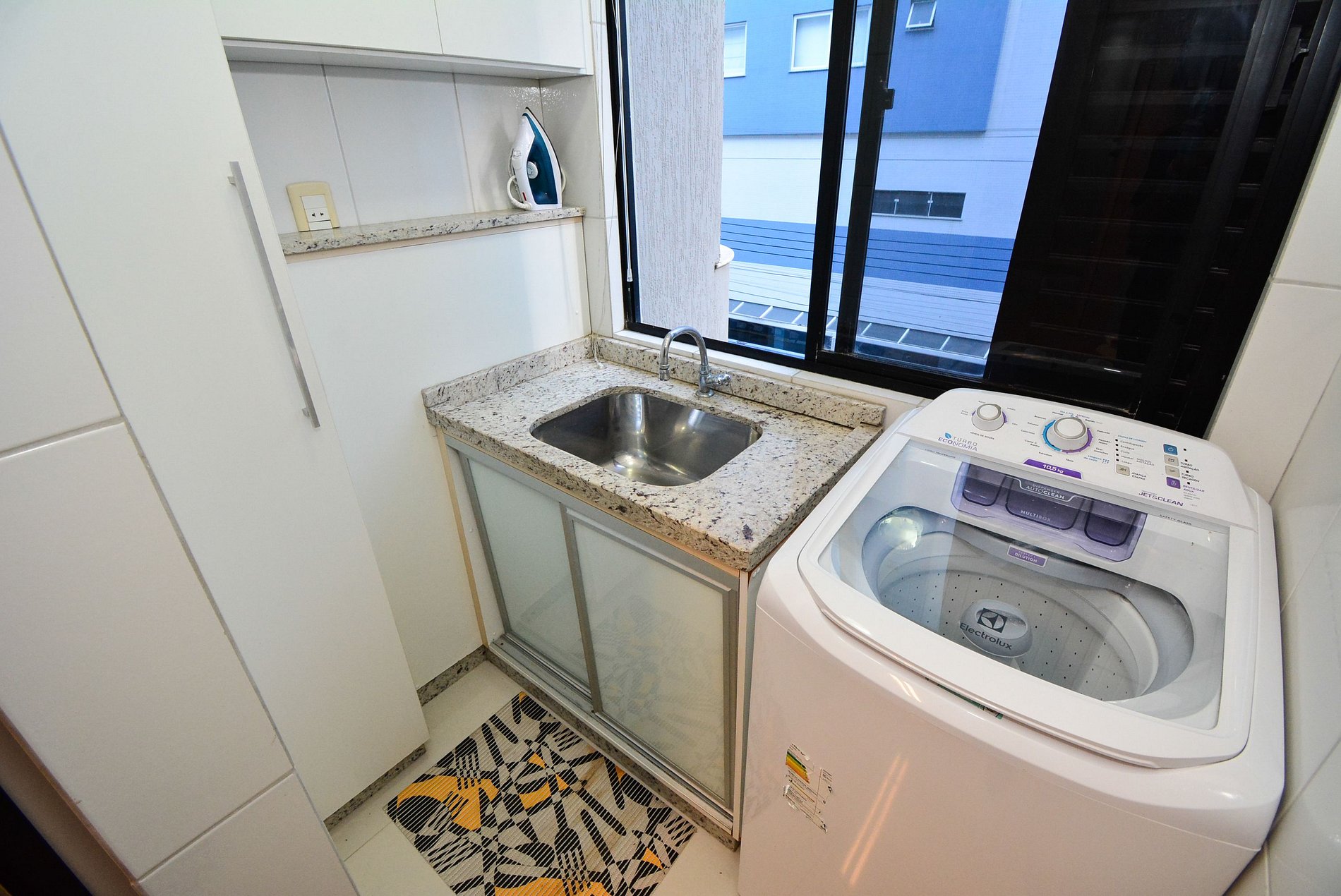 A cozinha é completa e equipada para o preparo de refeições, e a lavanderia com máquina de lavar traz ainda mais comodidade.