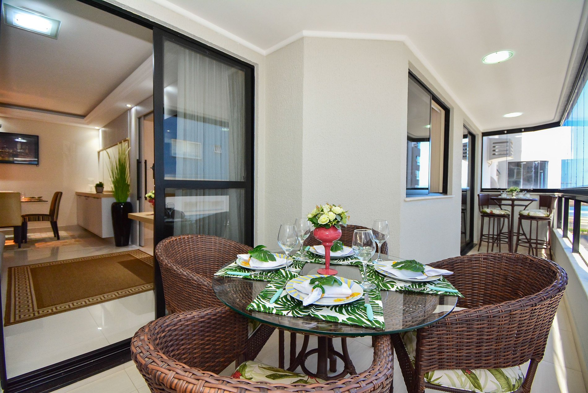 A área social é ideal para momentos de convivência, com sala de estar aconchegante, sacada com churrasqueira e vista parcial do mar, além de sala de jantar integrada com mesa para 6 pessoas.