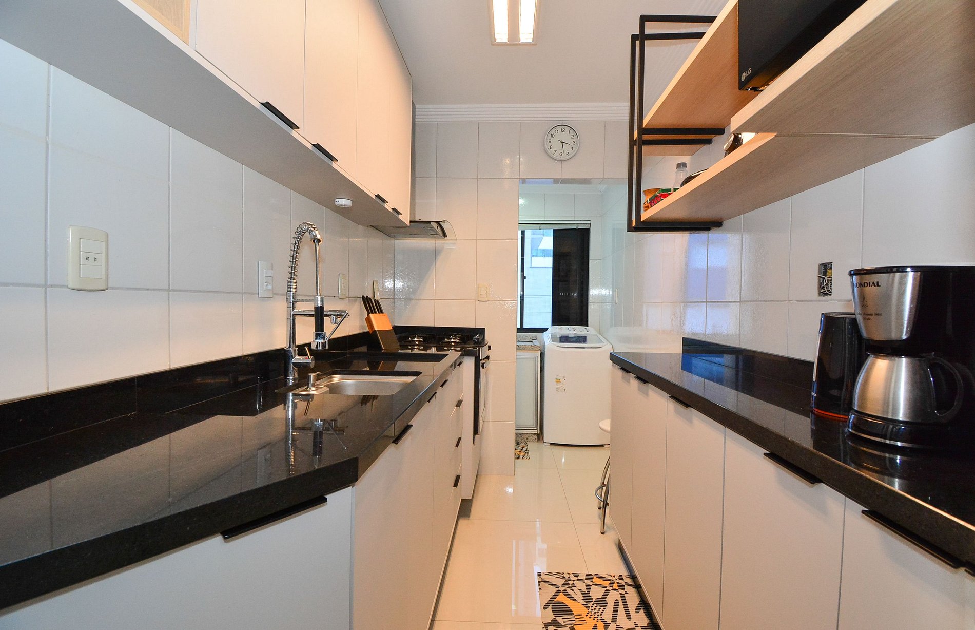 A cozinha é completa e equipada para o preparo de refeições, e a lavanderia com máquina de lavar traz ainda mais comodidade.