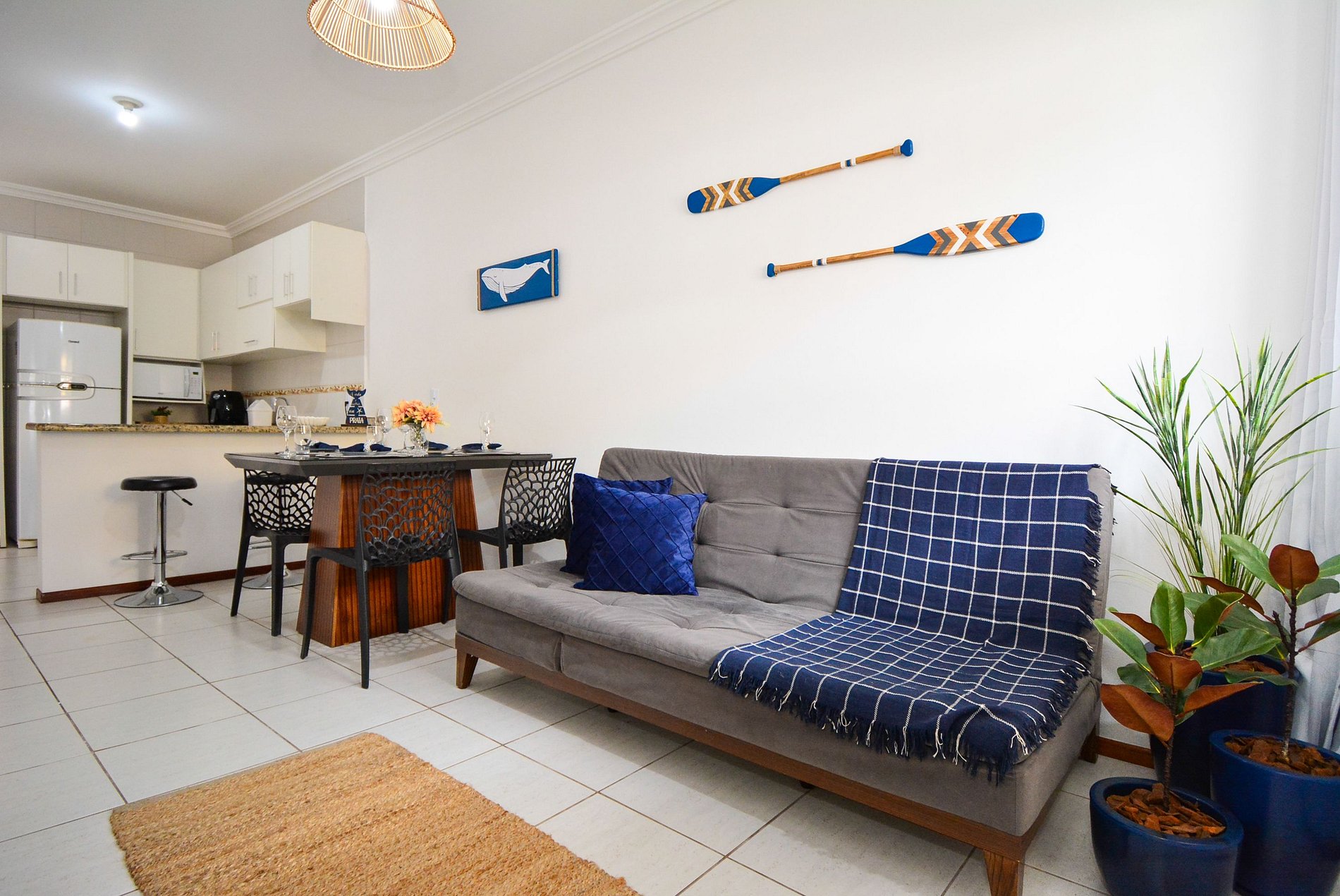 Apartamento aconchegante com decoração marítima, varanda com churrasqueira e acesso 100% remoto.