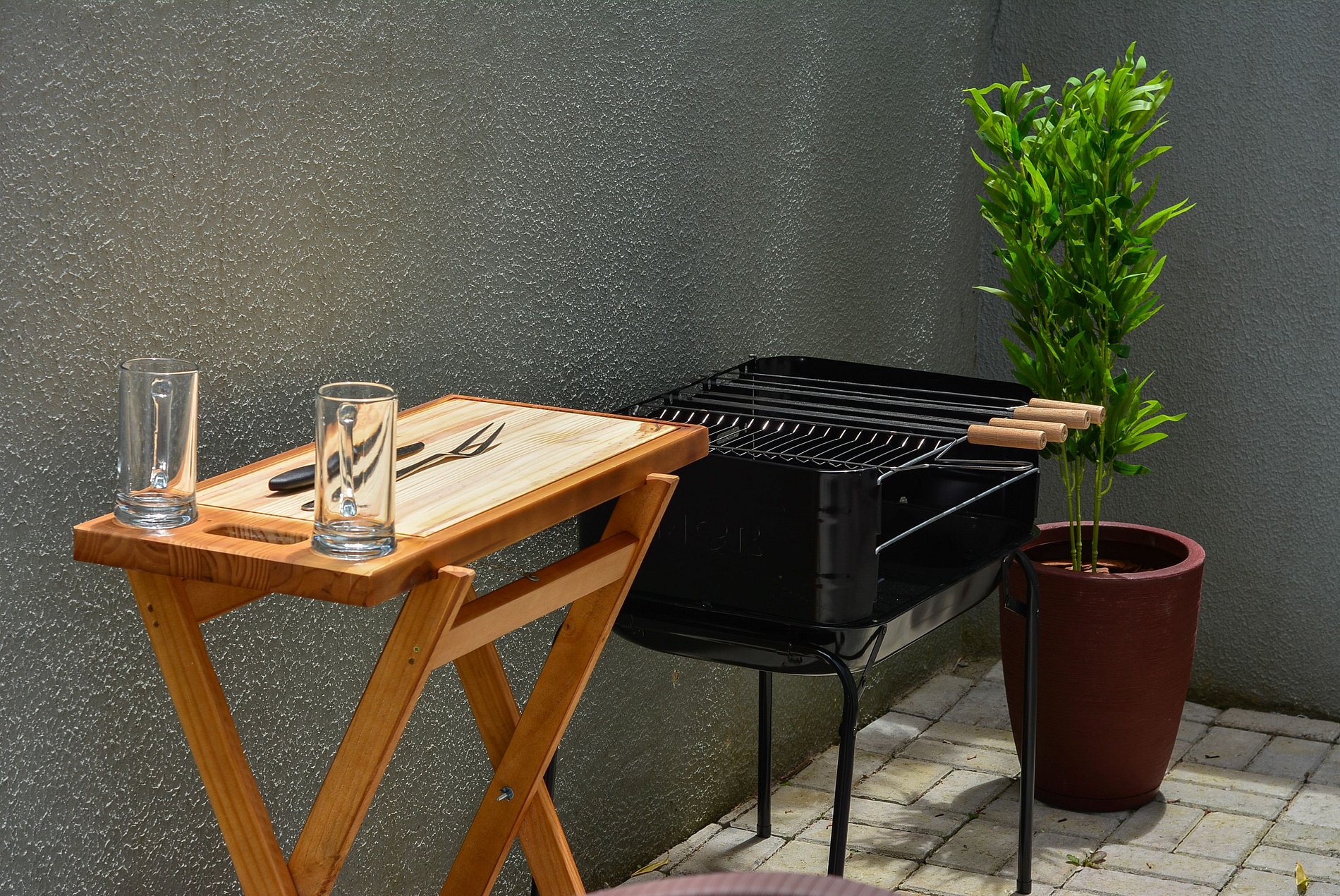 A acomodação possui uma charmosa varanda com mesa e churrasqueira, perfeita para momentos de descontração após um dia de praia.