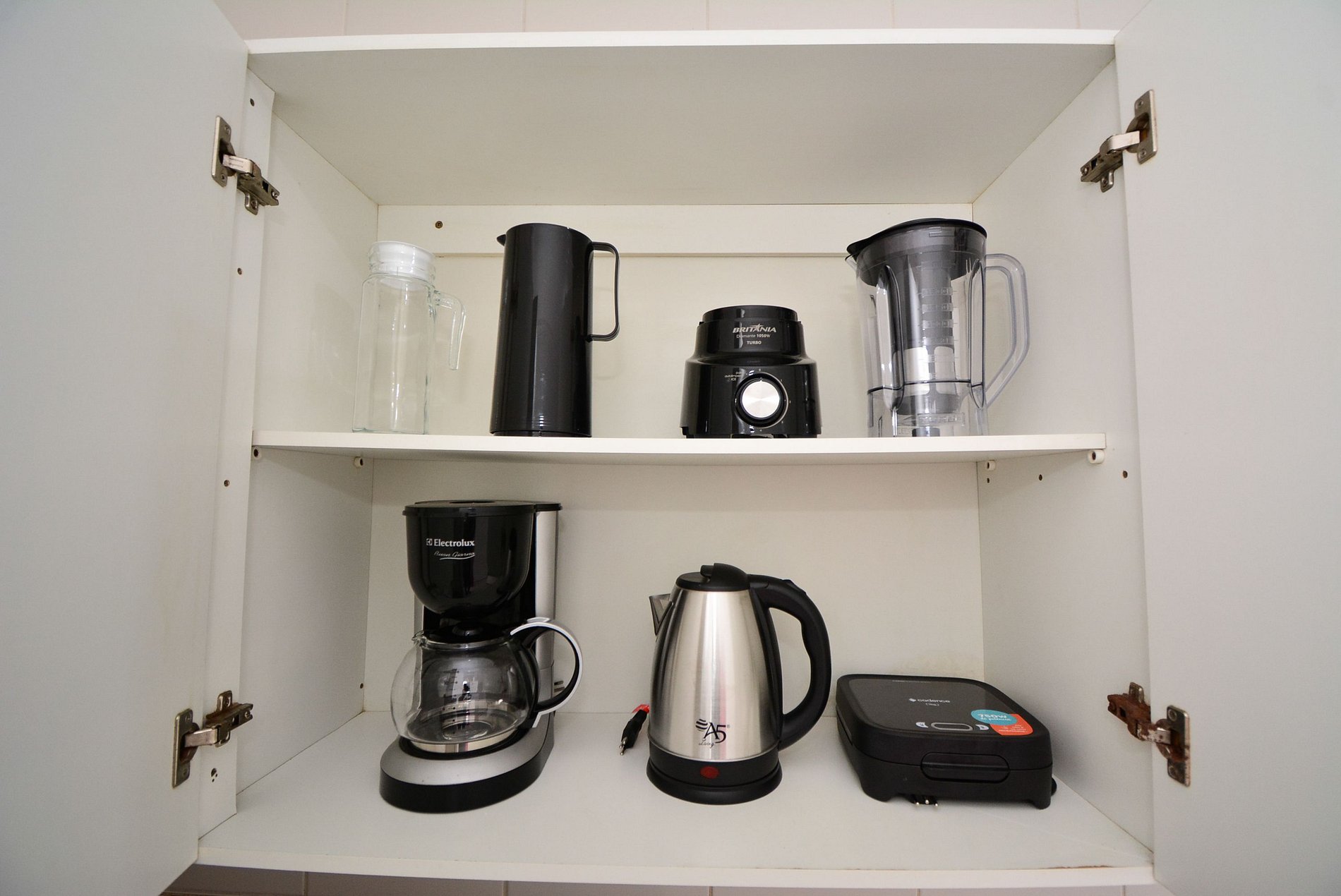 • Cozinha completa: geladeira, fogão, forno, micro-ondas, air fryer, cafeteira, chaleira elétrica, sanduicheira, panelas e utensílios