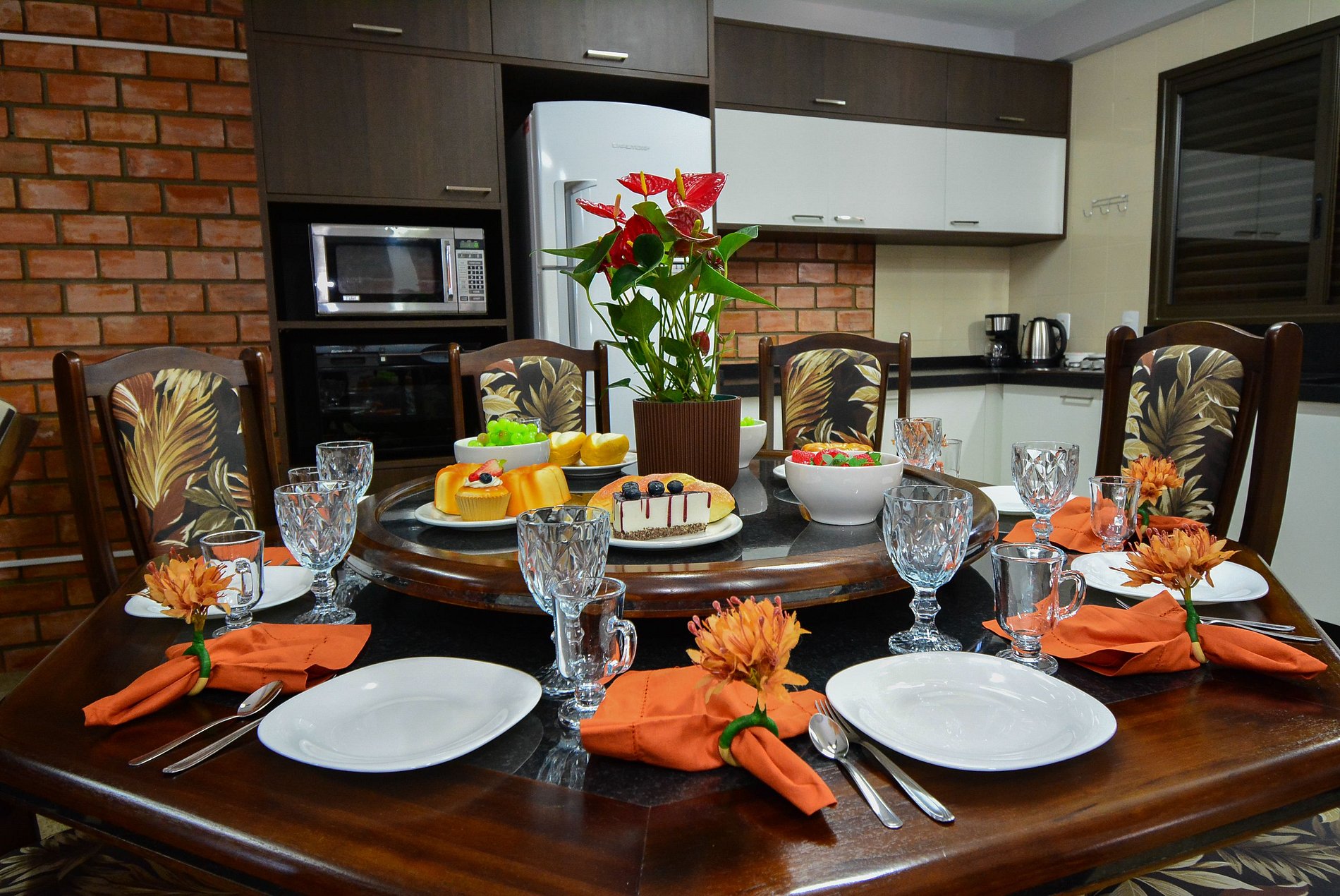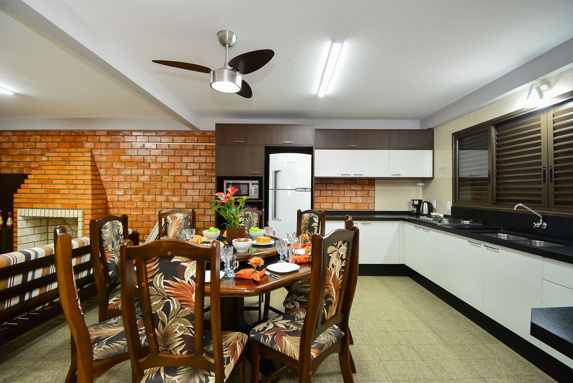 • Geladeira, fogão, forno, micro-ondas, air fryer, cafeteira, liquidificador, sanduicheira, espemedor de frutas, mixer, panelas e utensílios completos