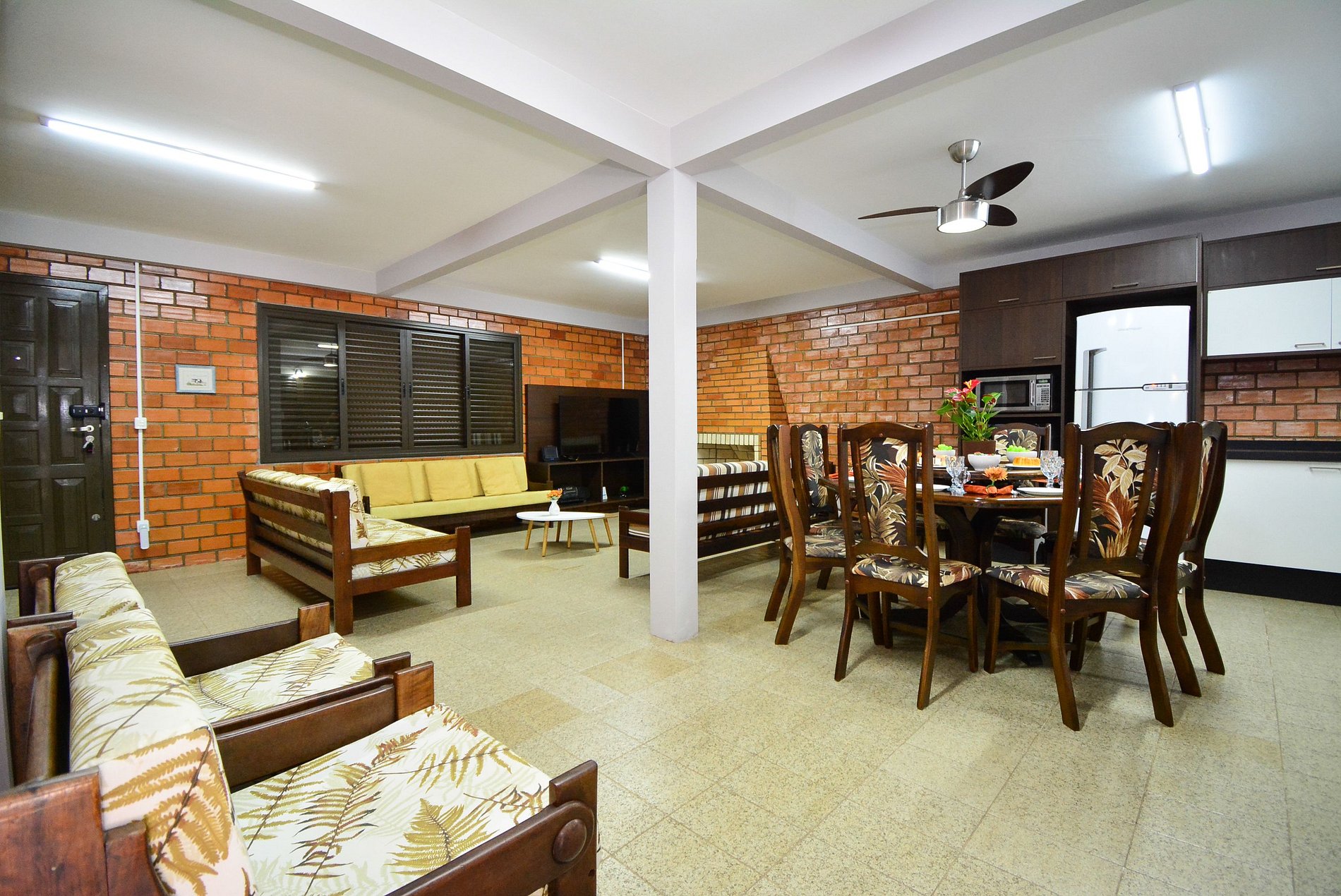 No interior, a casa conta com uma ampla sala de estar com dois sofás e TV, integrada à sala de jantar com mesa para 8 pessoas, além de uma cozinha completamente equipada com utensílios e eletrodomésticos, ideal para preparar refeições completas.