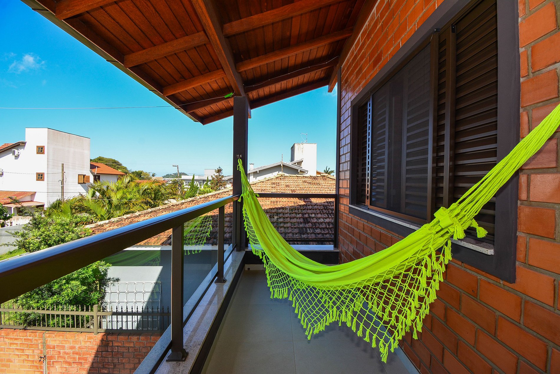 Tanto a varanda no piso inferior e superior conta com uma rede, perfeita para relaxar e aproveitar a vista.