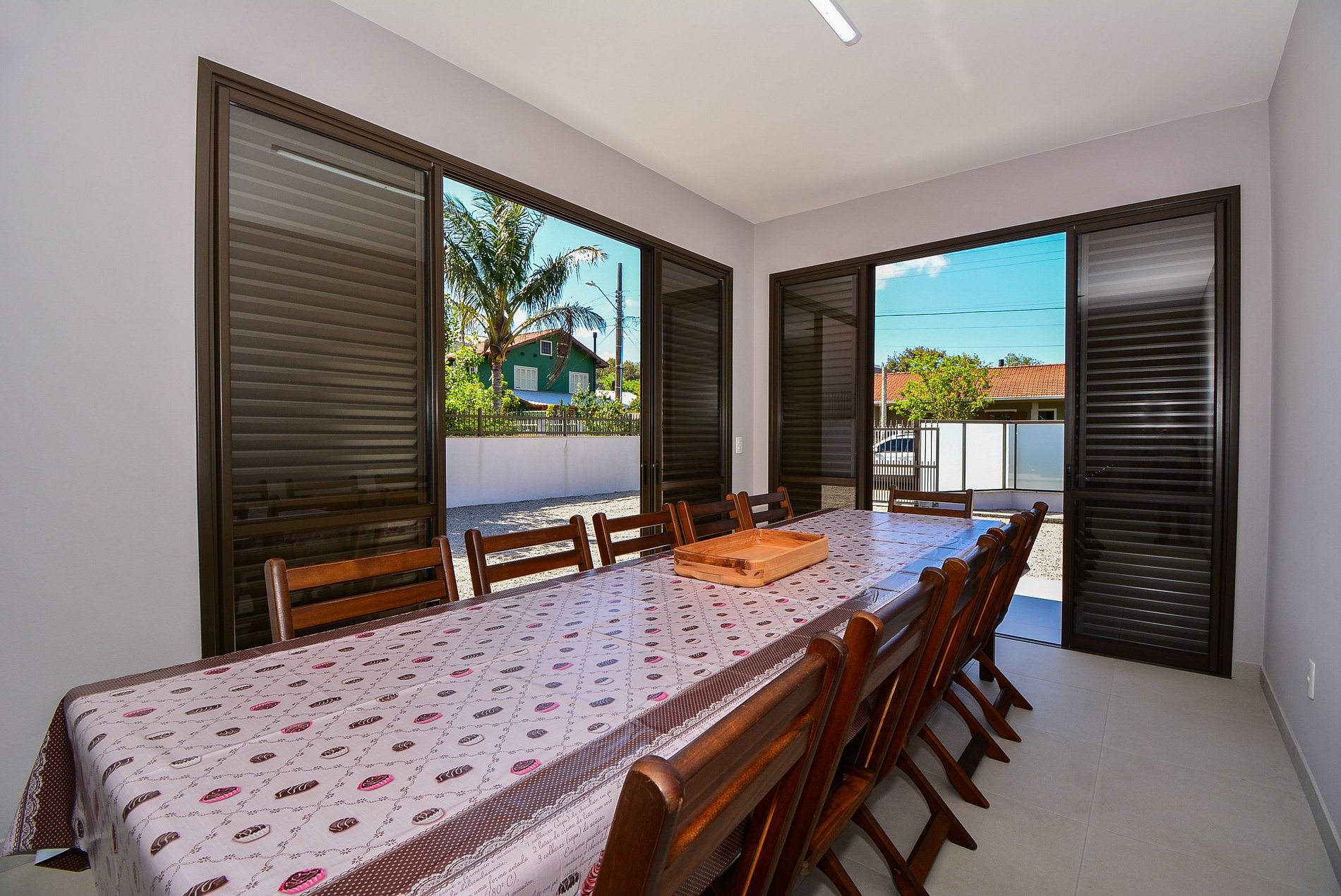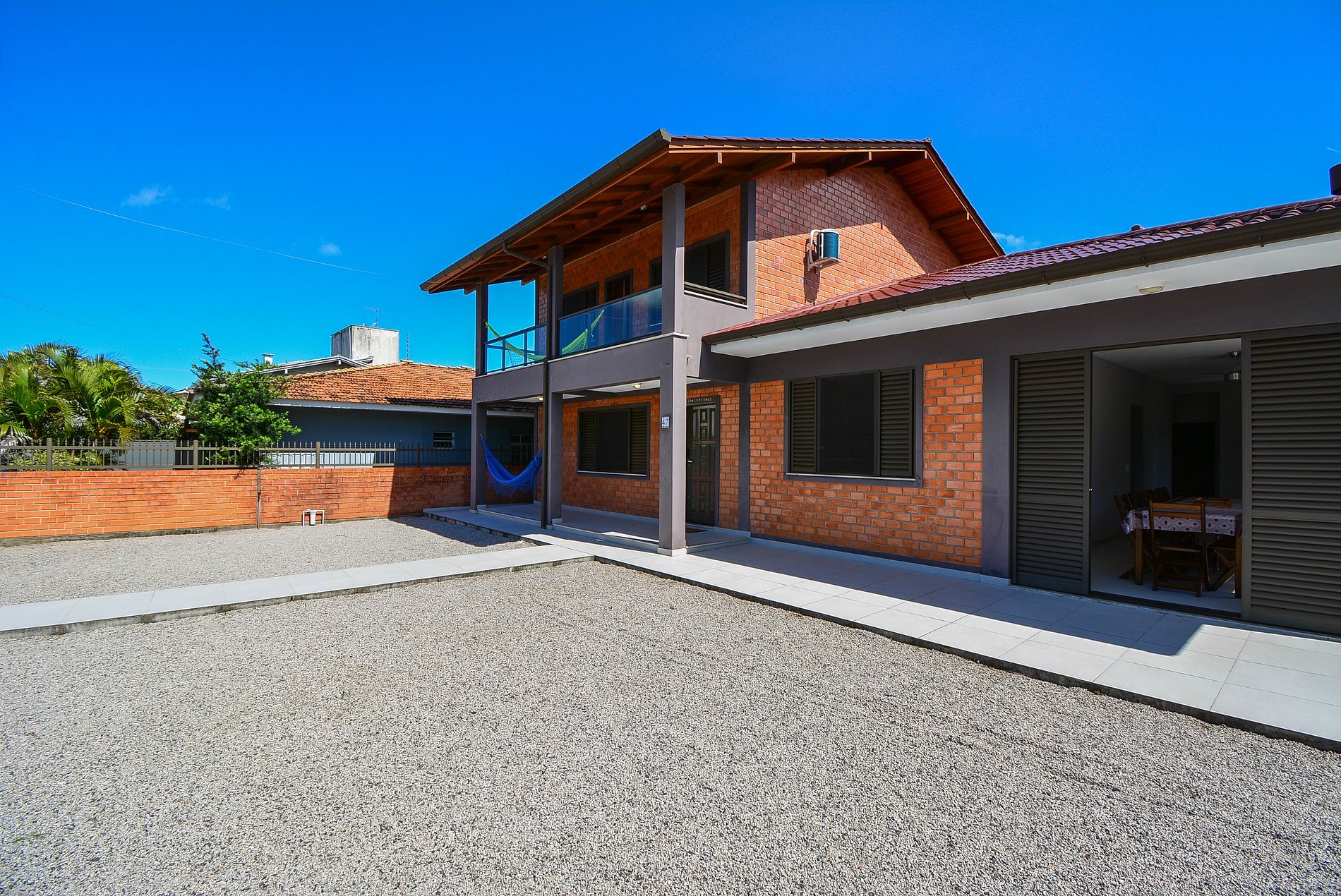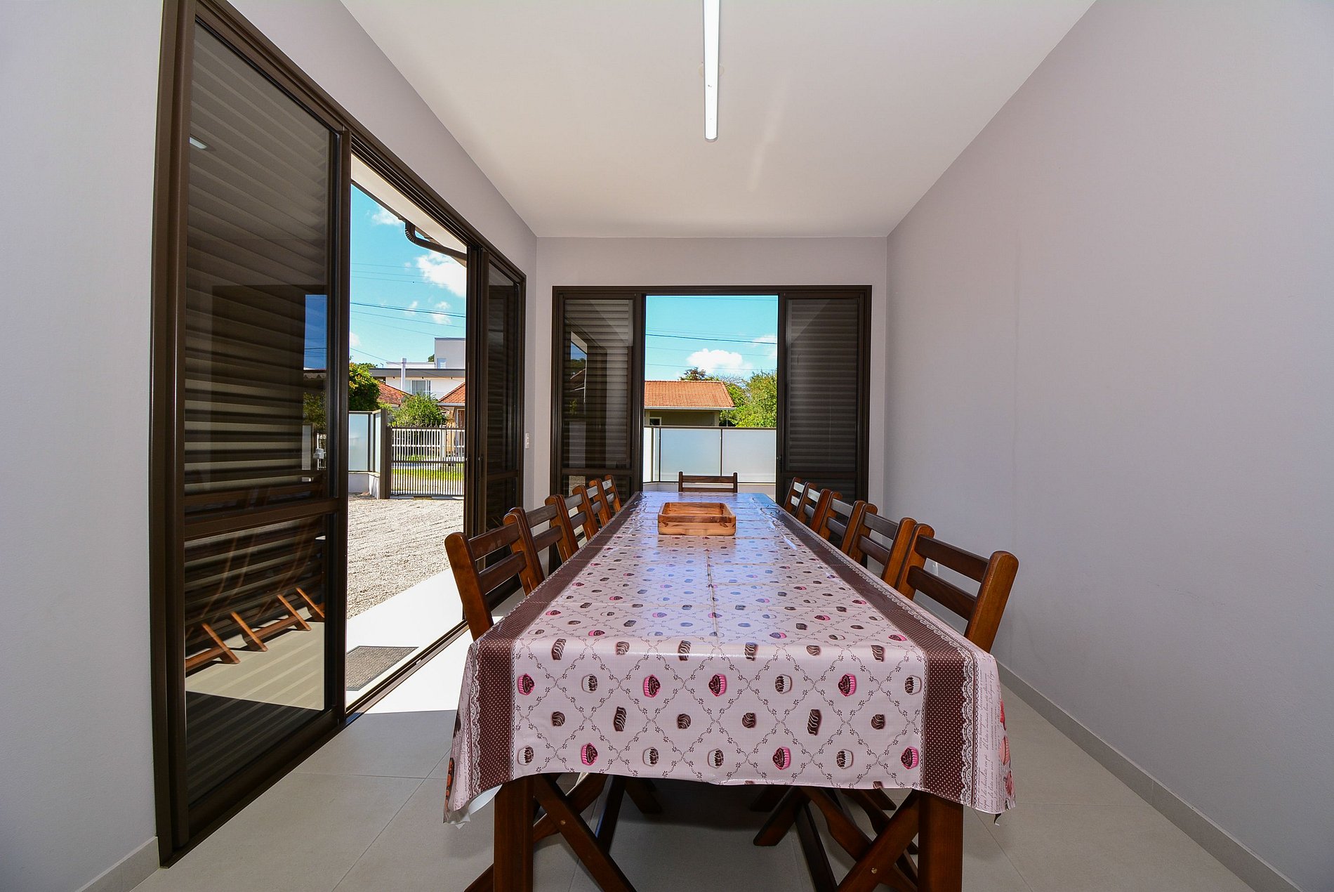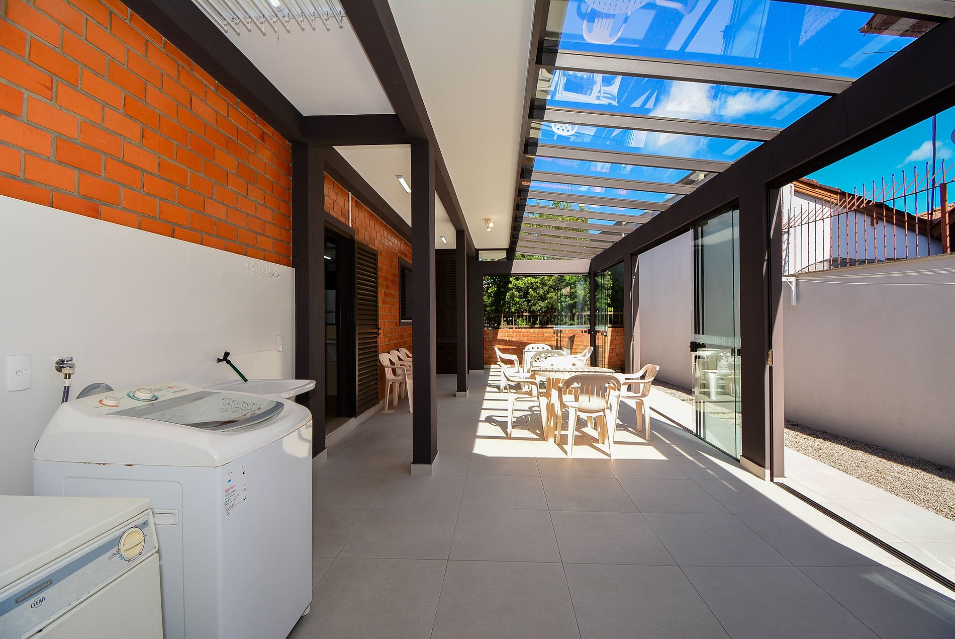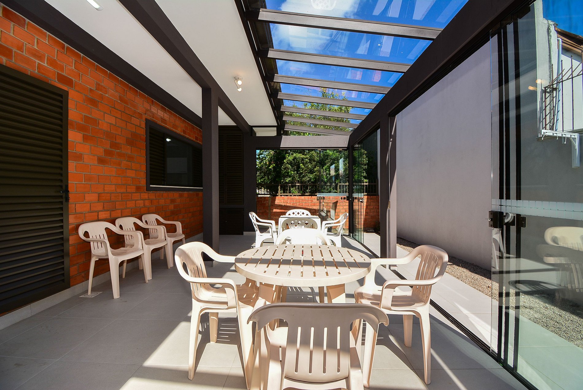 Com um amplo terreno, a propriedade oferece duas áreas externas de convivência: uma área gourmet com churrasqueira e mesa grande para reunir todos, e outra área com mesas e cadeiras para momentos de relaxamento ou refeições.