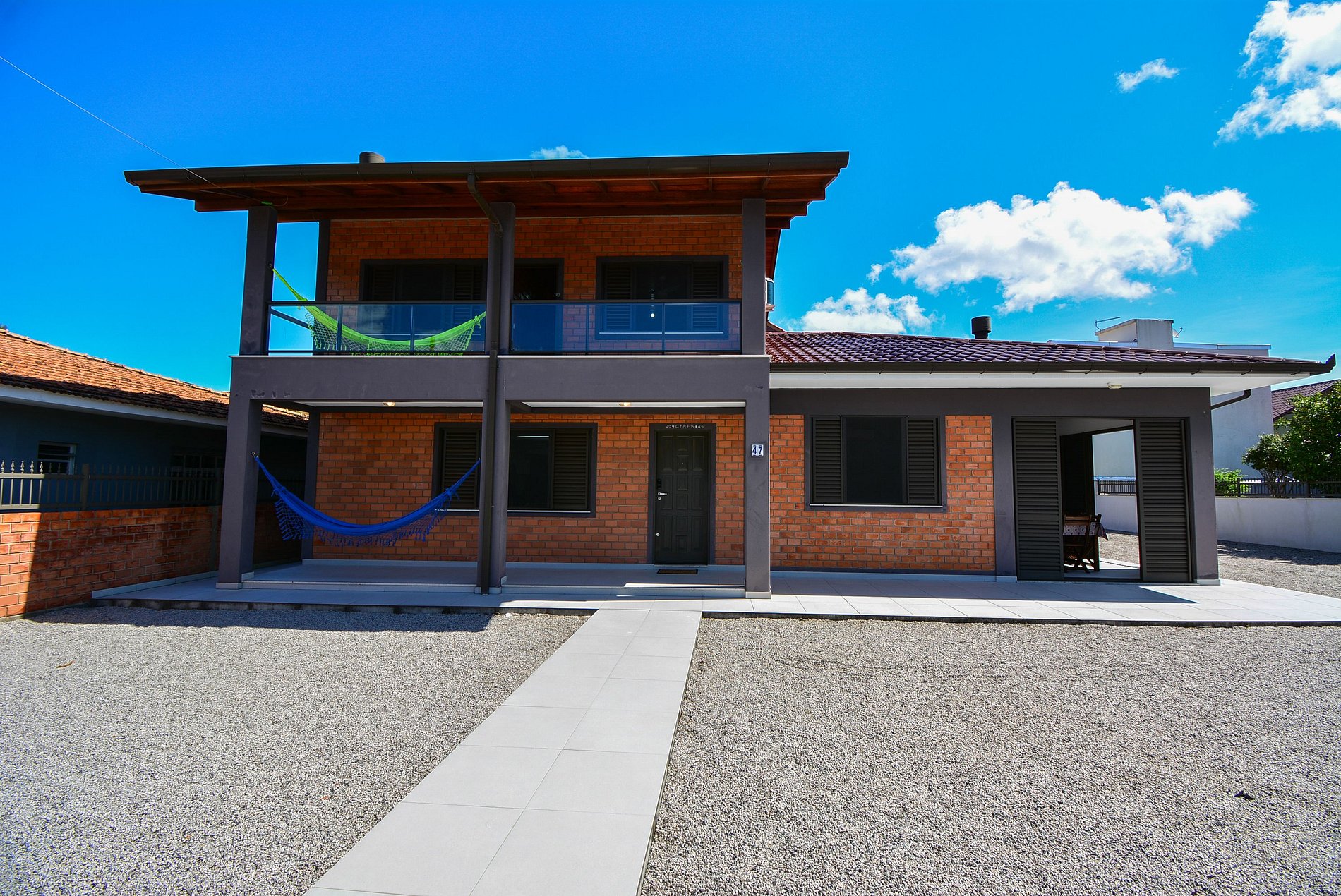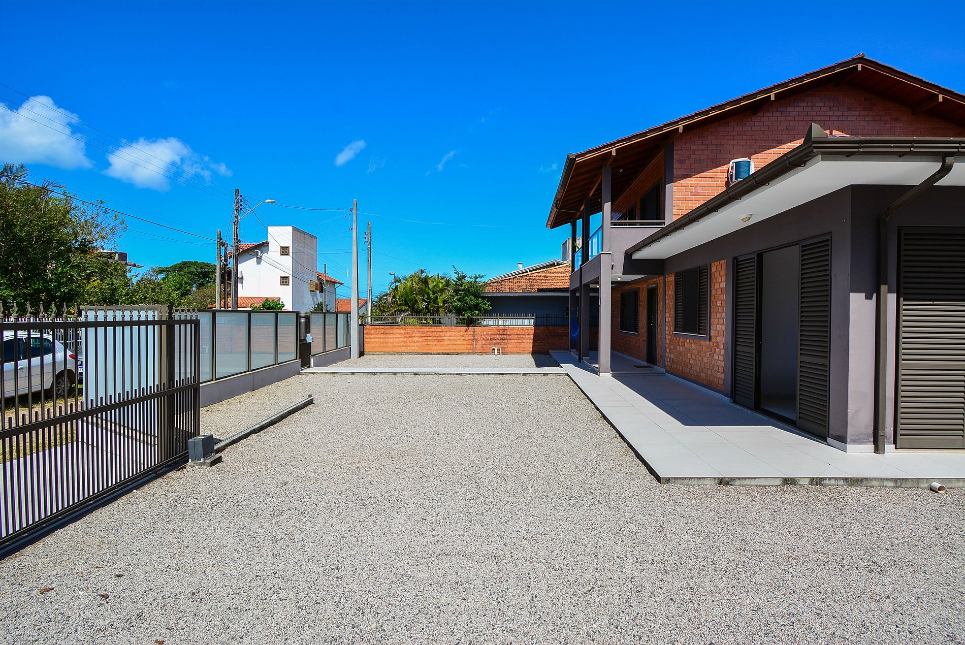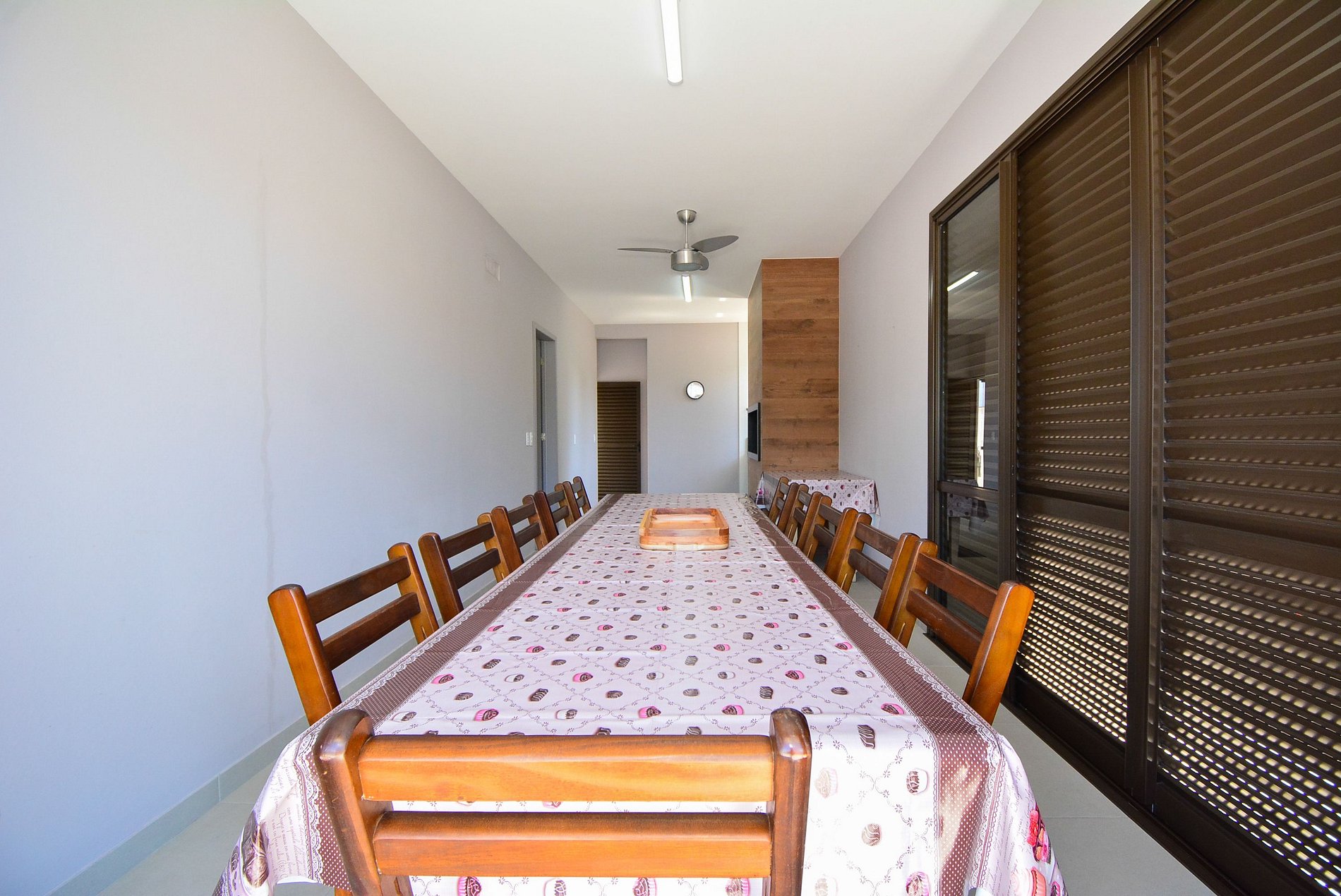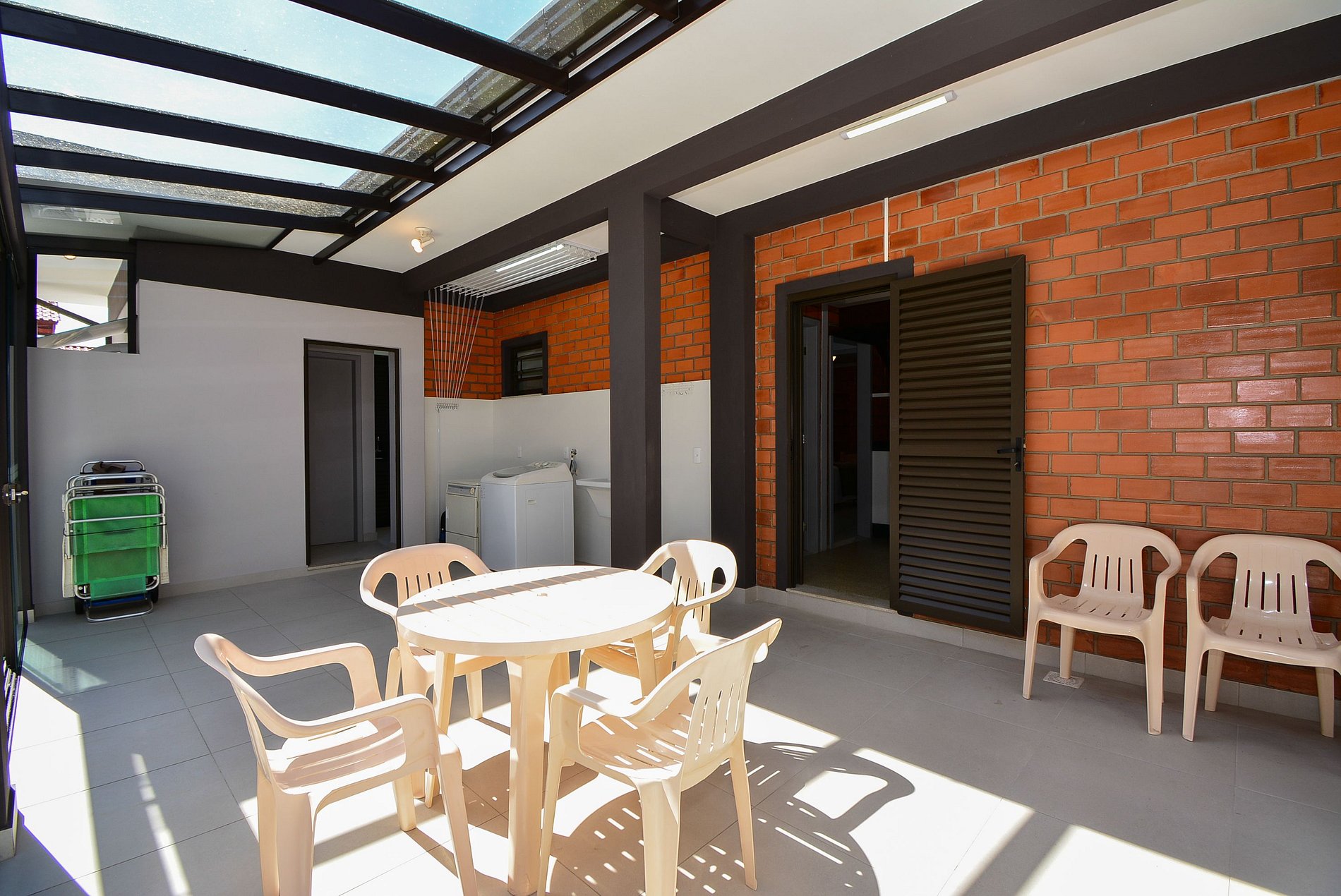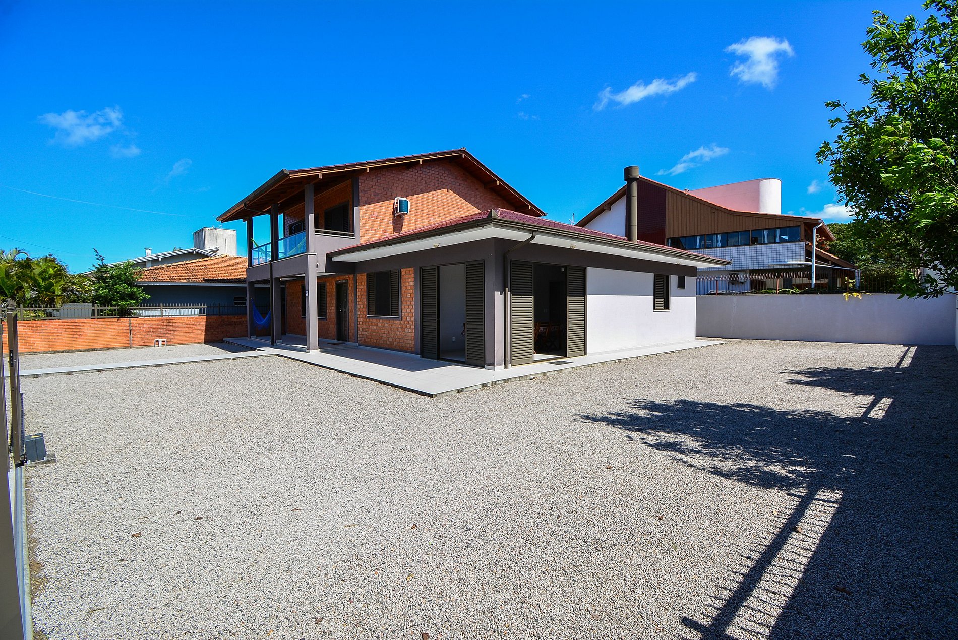 Com um amplo terreno, a propriedade oferece duas áreas externas de convivência: uma área gourmet com churrasqueira e mesa grande para reunir todos, e outra área com mesas e cadeiras para momentos de relaxamento ou refeições.