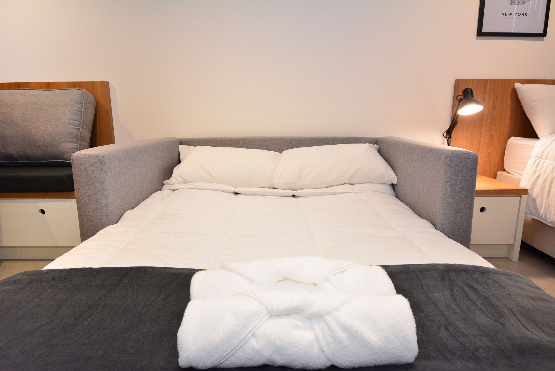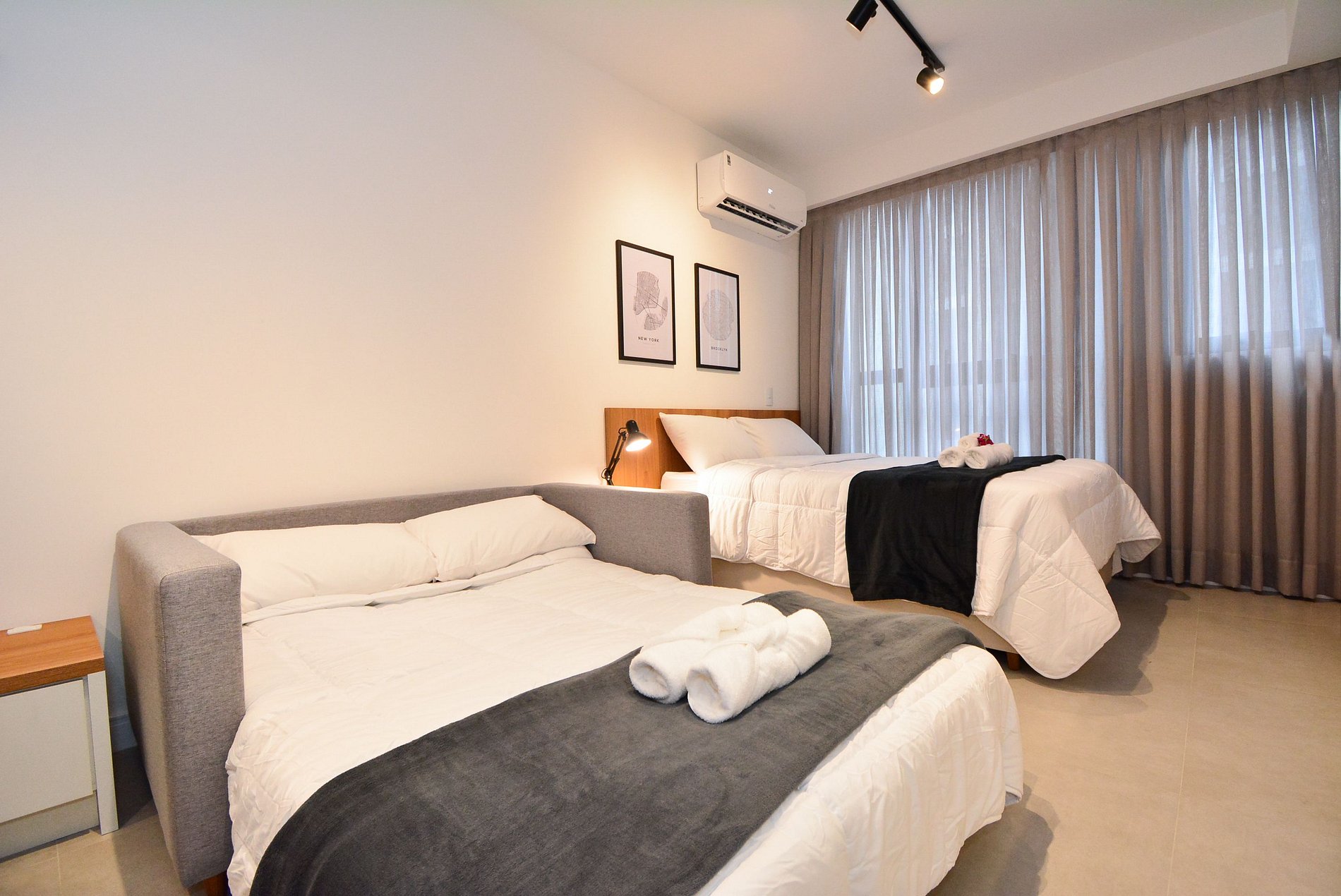 • Uma Cama queen, um sofá-cama de casal, 4 travesseiros, roupas de cama e mantas.