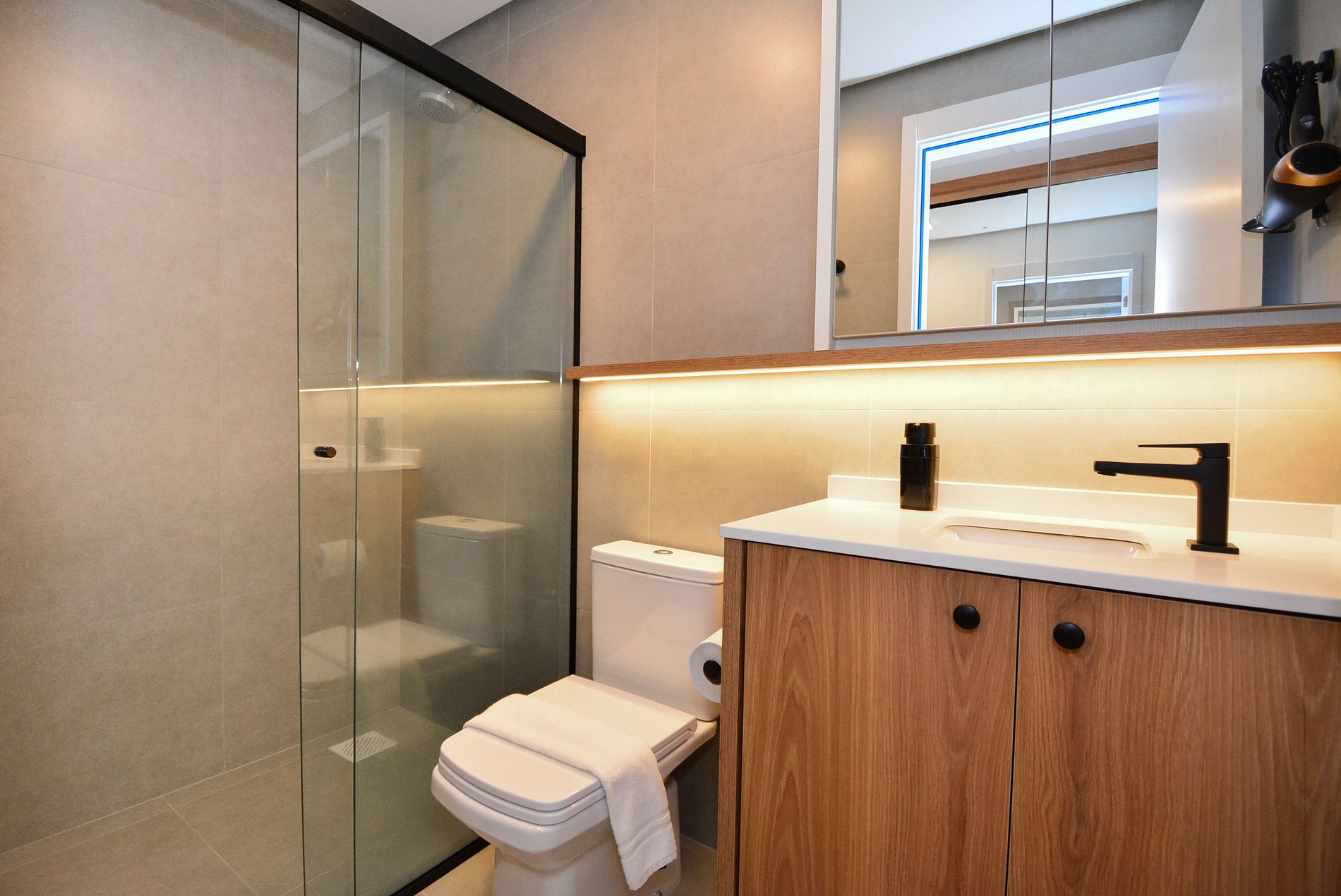 • Banheiro privativo com box de vidro, chuveiro a gás, toalhas de banho e rosto disponíveis, secador de cabelo.