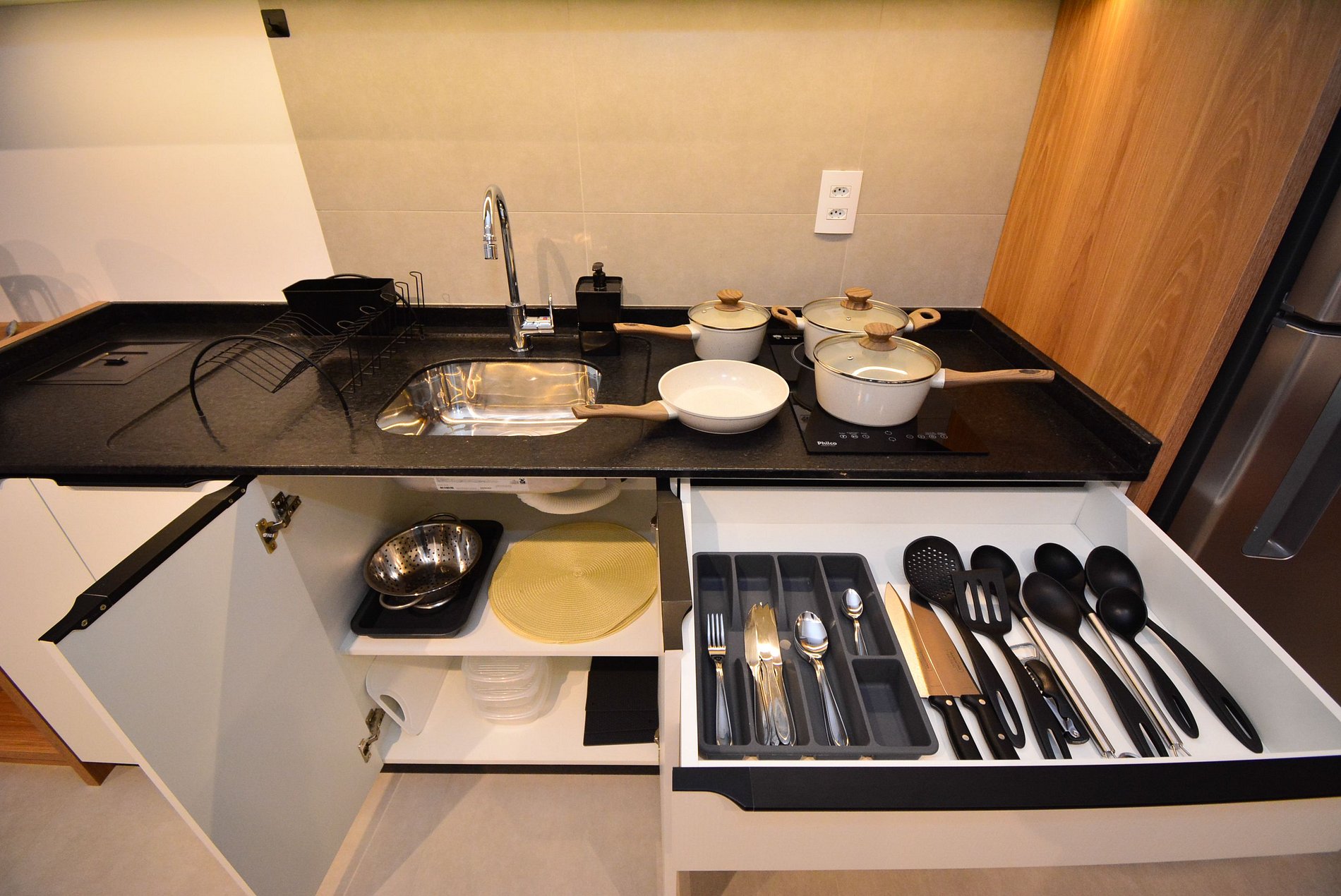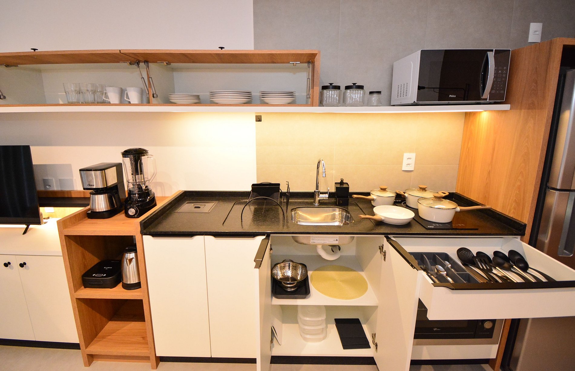 • Cooktop, forno, micro-ondas, geladeira, cafeteira, chaleira elétrica, sanduicheira, liquidificador, panelas variadas.