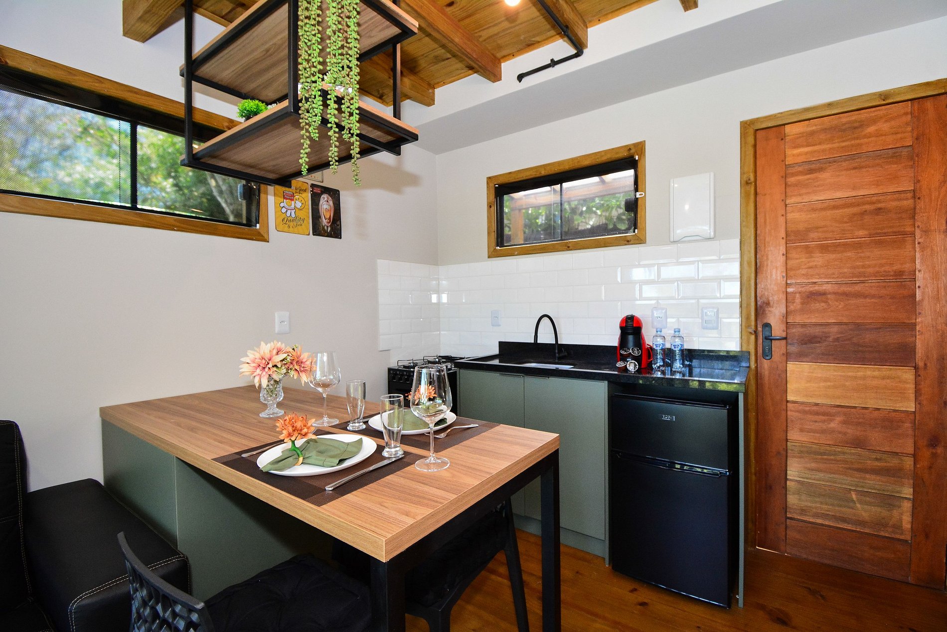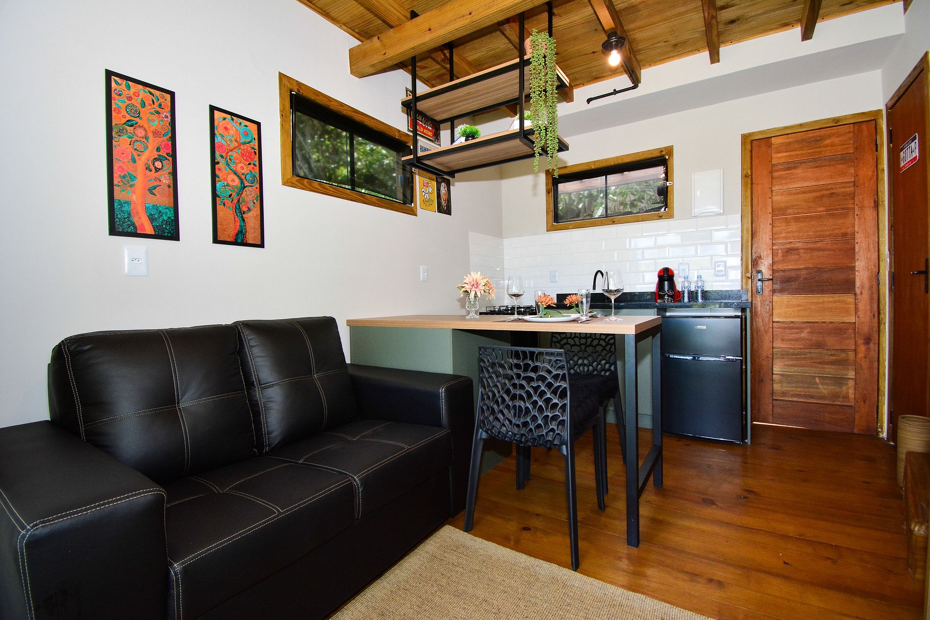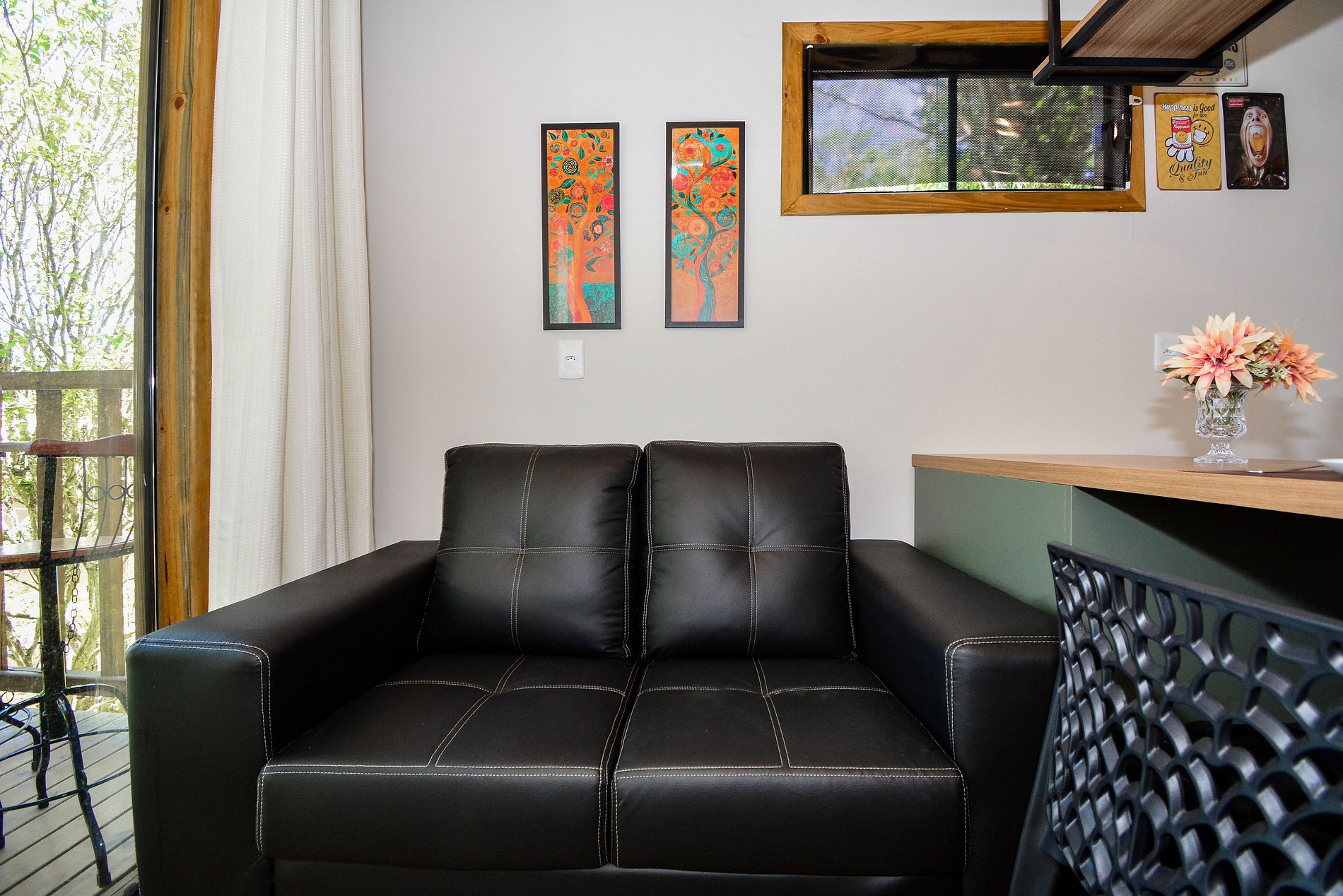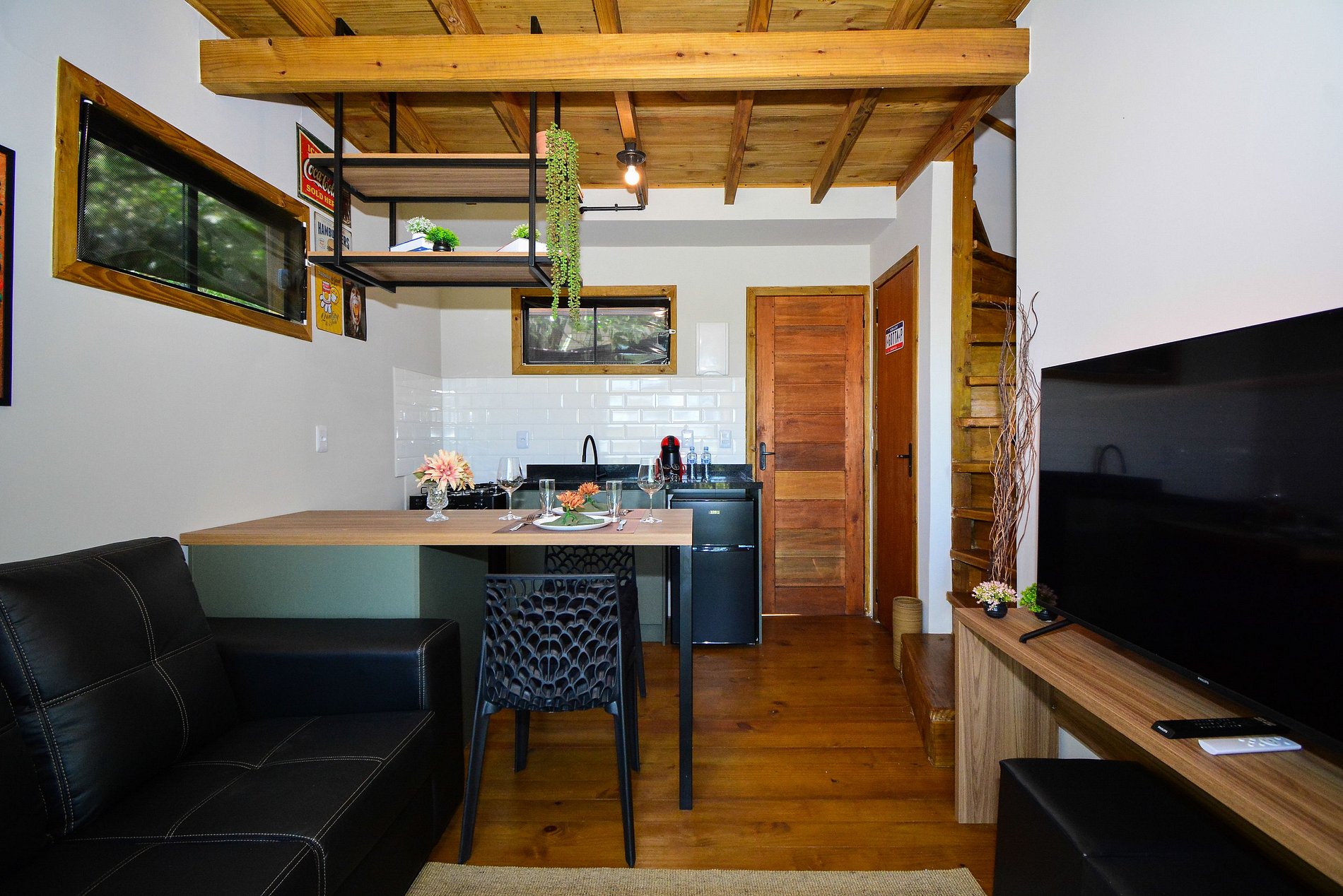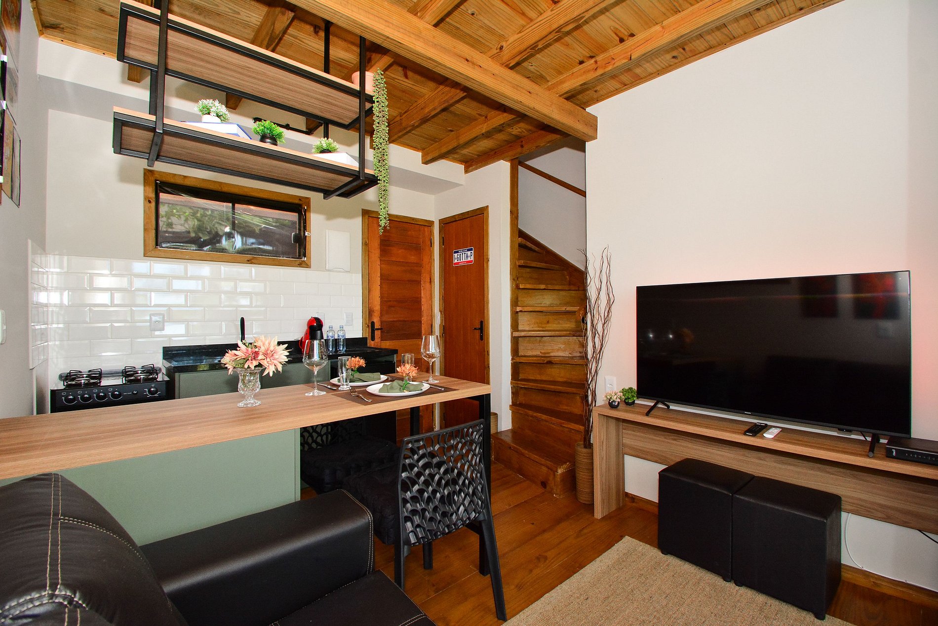No piso inferior, dispõe de uma cozinha completa, sala com sofá e smart TV, além de uma sacada com mesinha, perfeita para refeições ao ar livre. Há também um lavabo para maior comodidade.