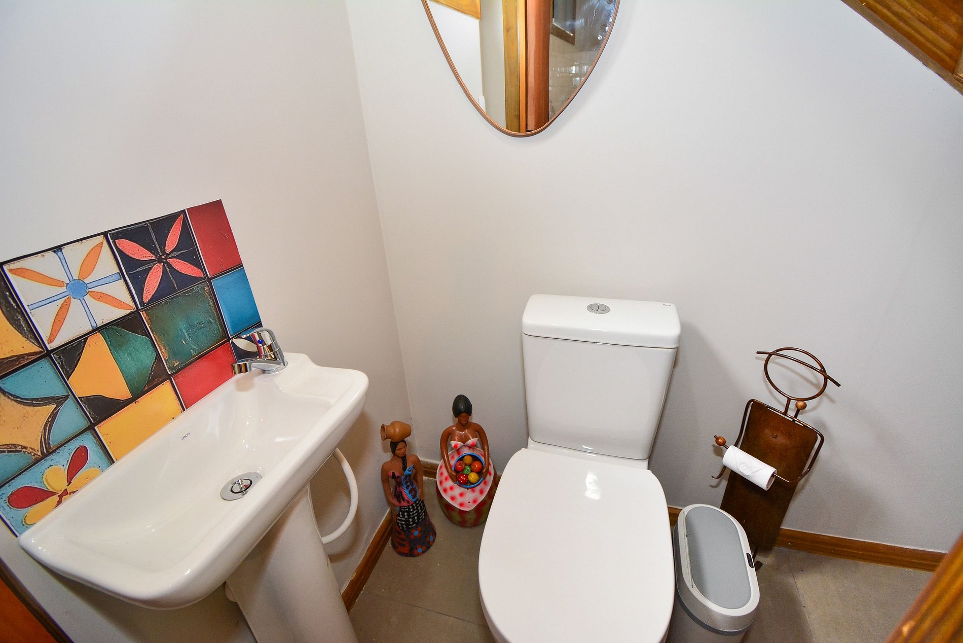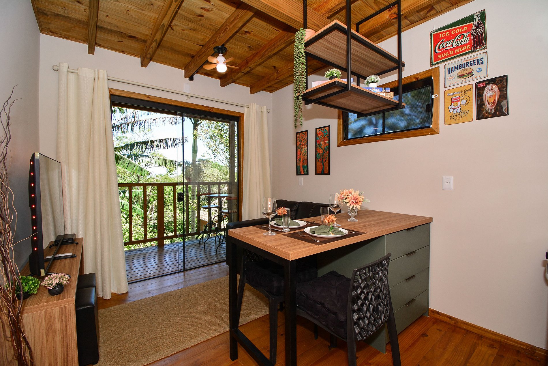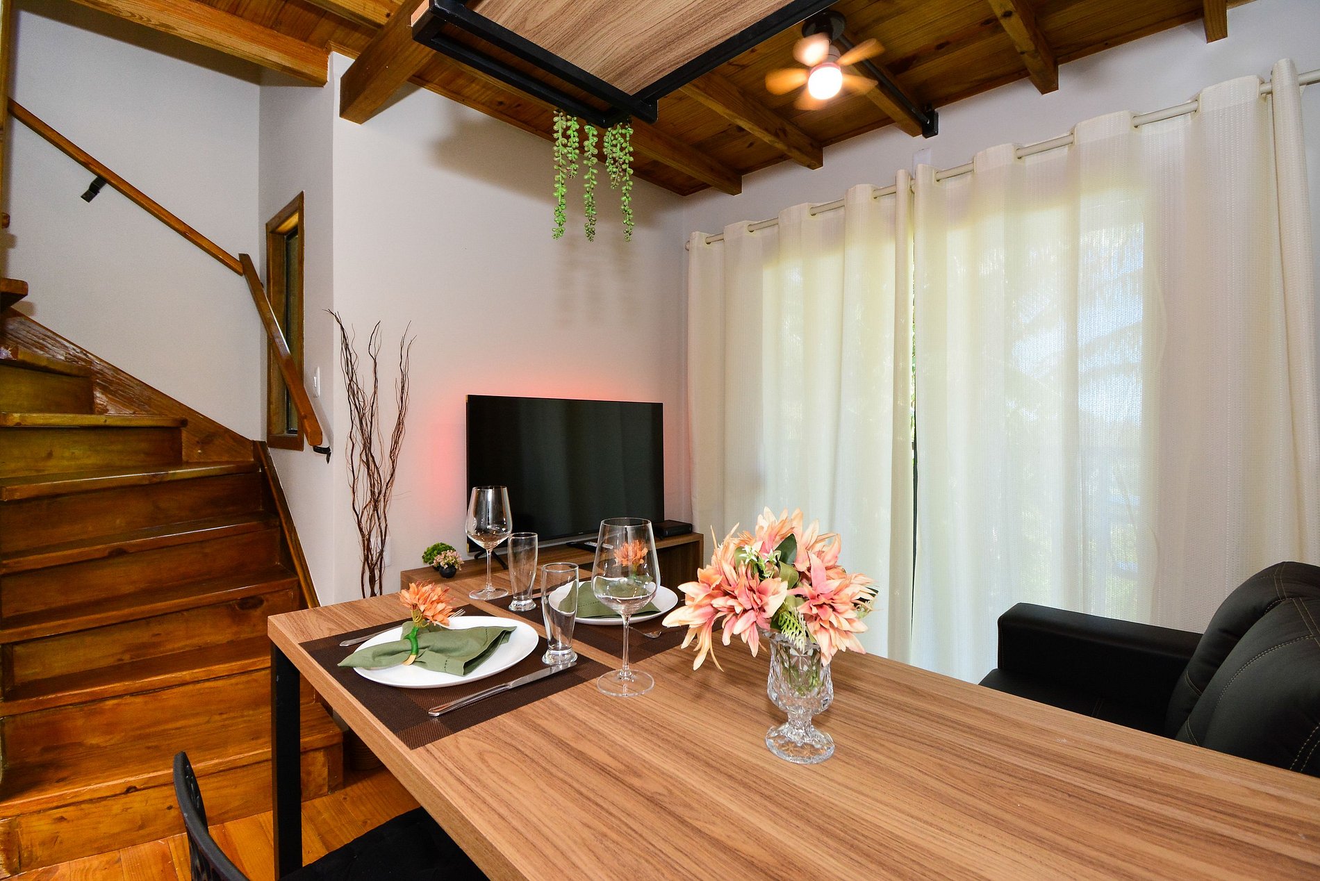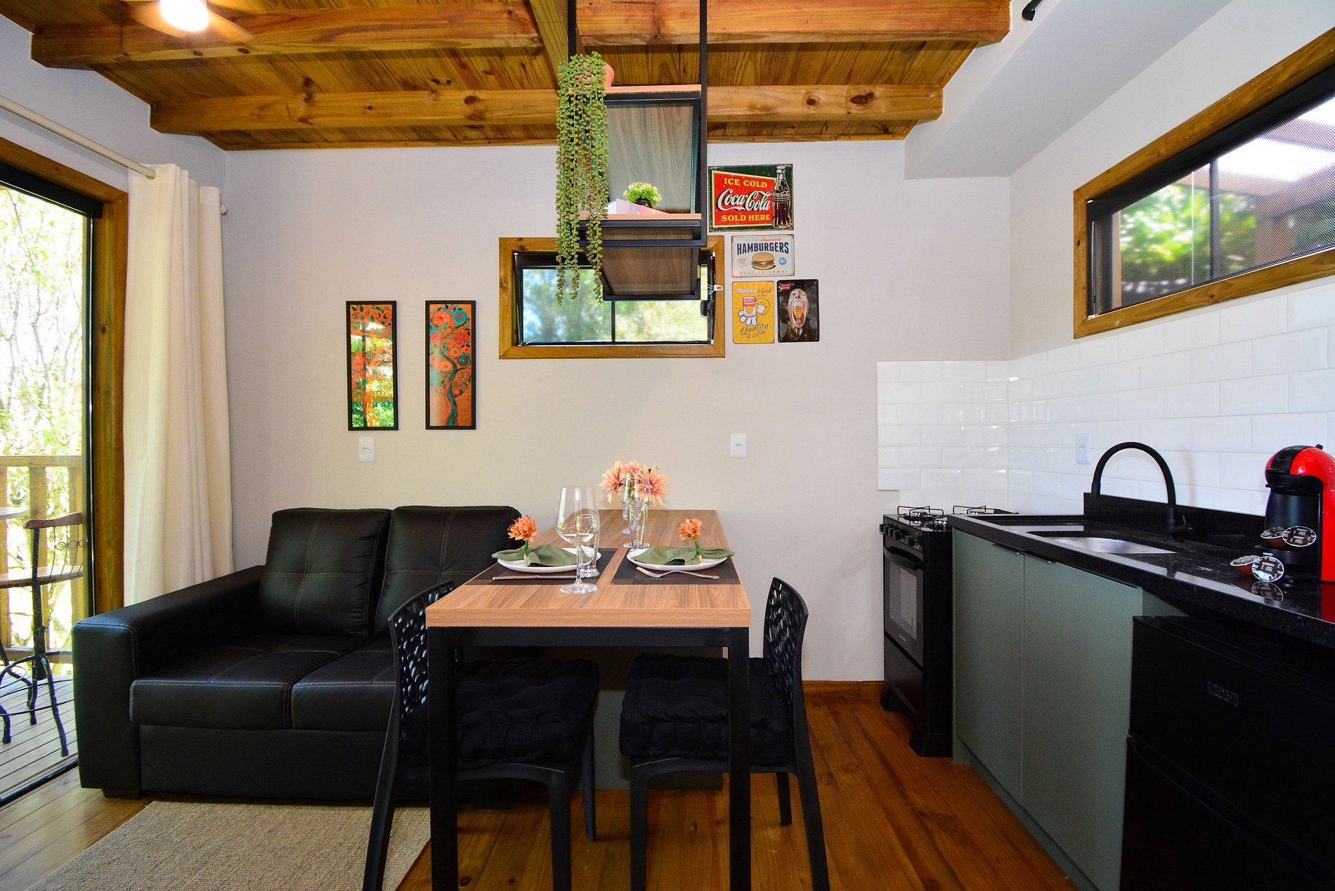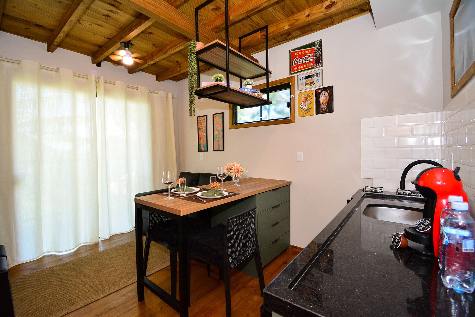 No piso inferior, dispõe de uma cozinha completa, sala com sofá e smart TV, além de uma sacada com mesinha, perfeita para refeições ao ar livre. Há também um lavabo para maior comodidade.
