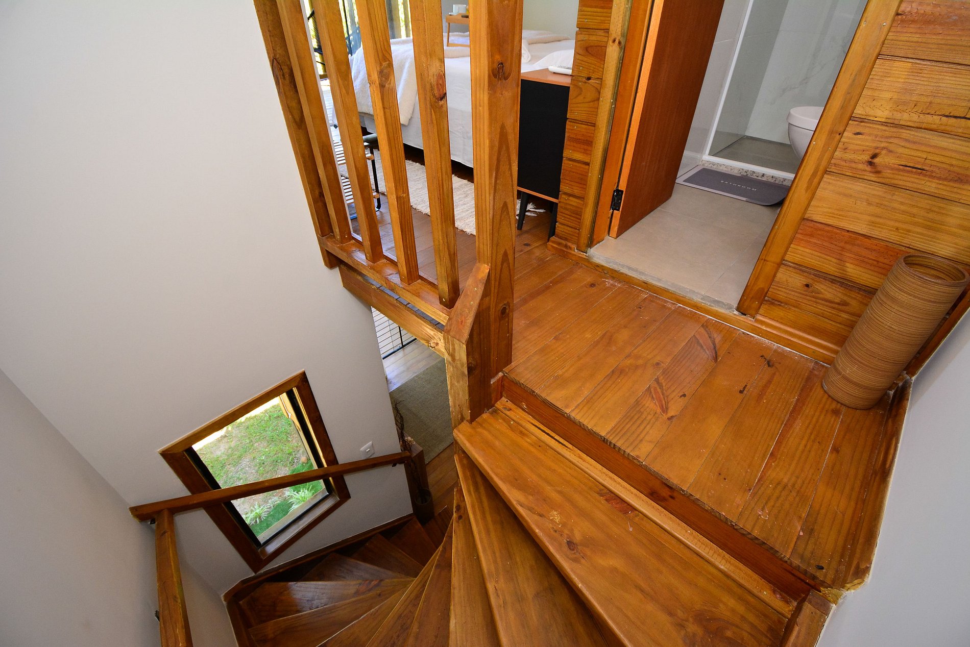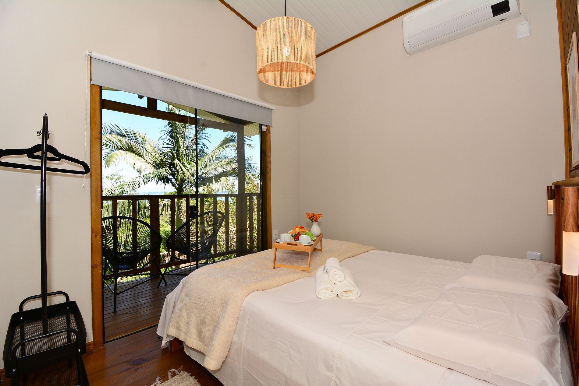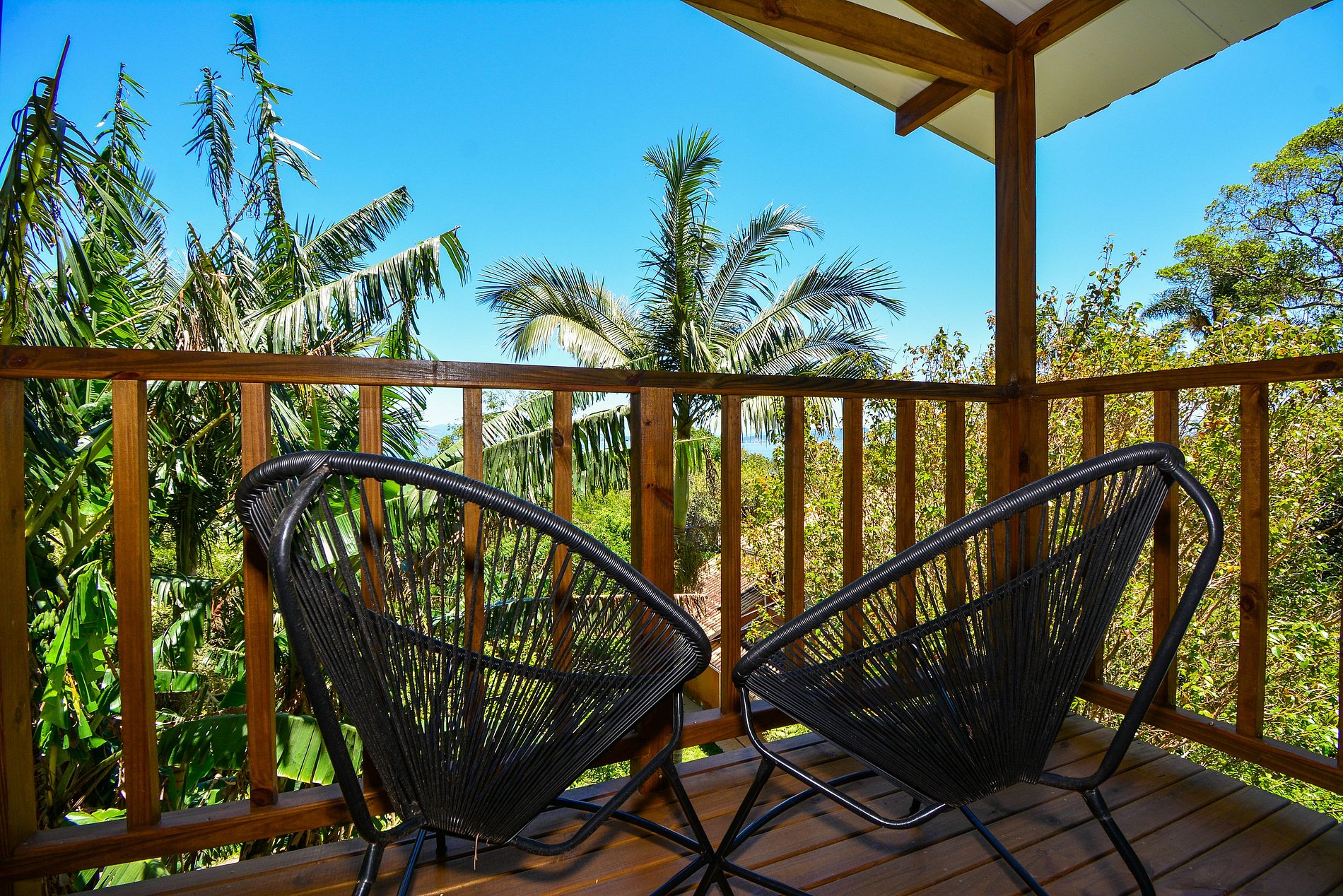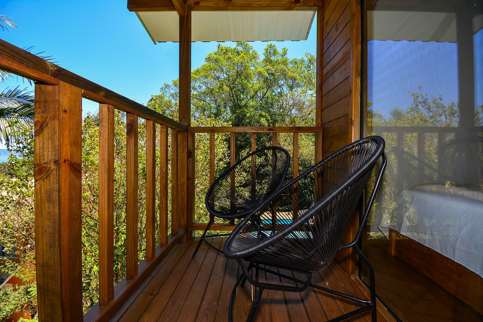 No piso superior está a suíte, com cama queen, banheiro privativo e uma sacada com cadeiras, onde é possível apreciar uma linda vista para o mar e para o verde.