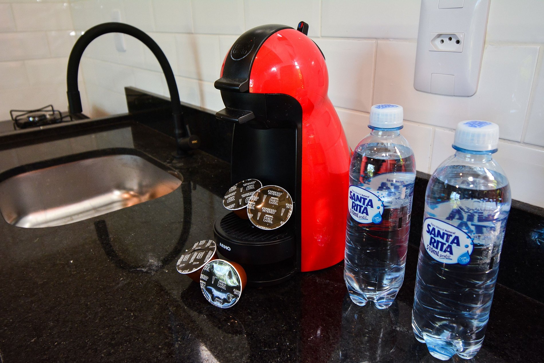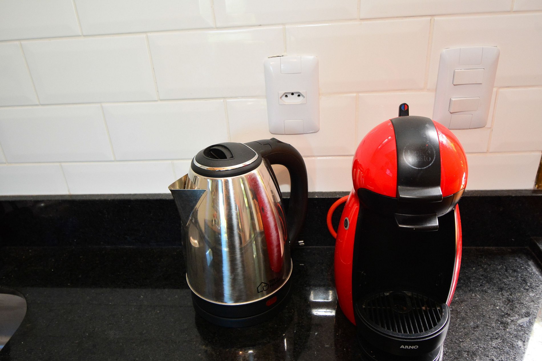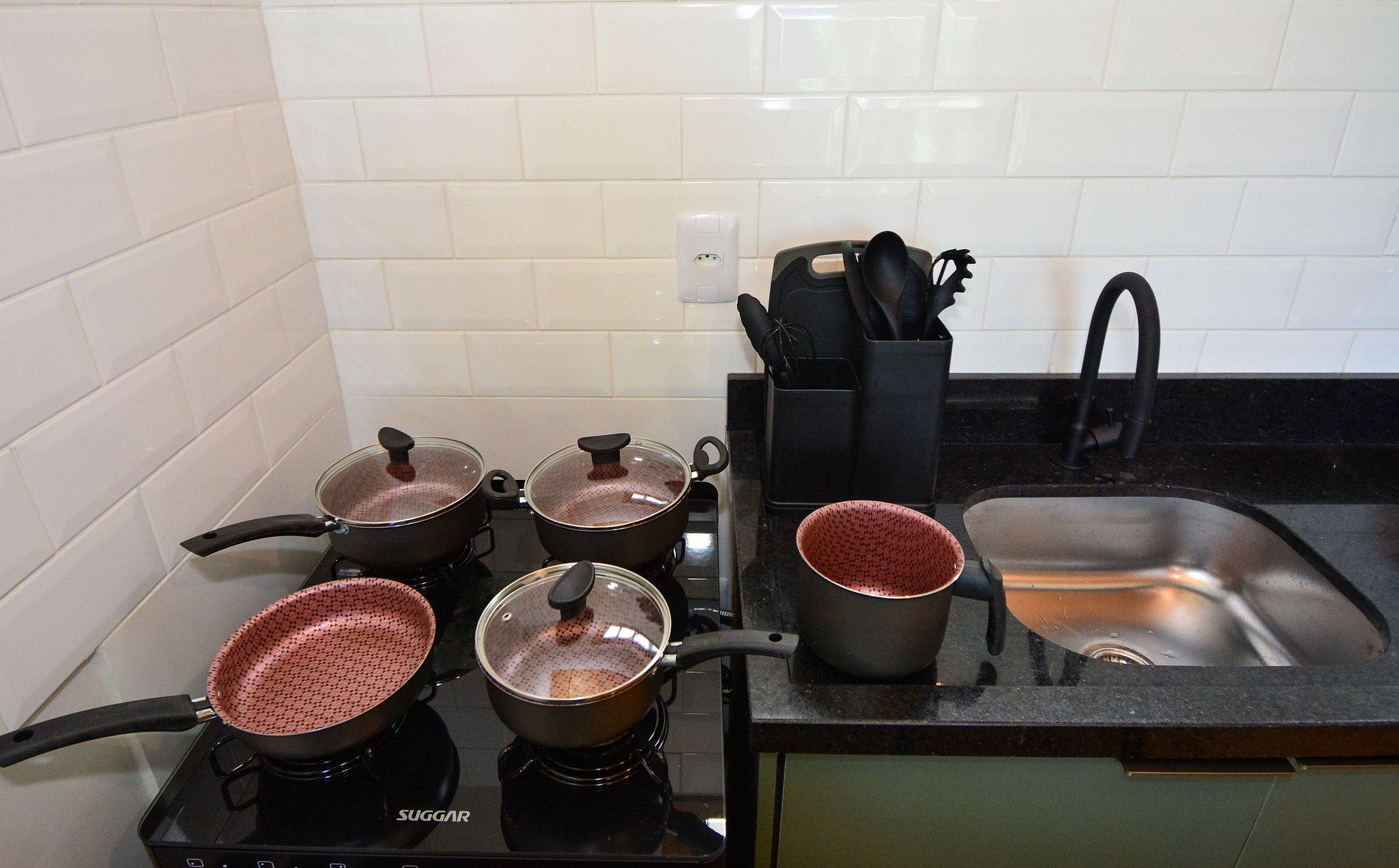 • Geladeira, fogão, forno, chaleira elétrica, máquina de café, panelas e utensílios de cozinha