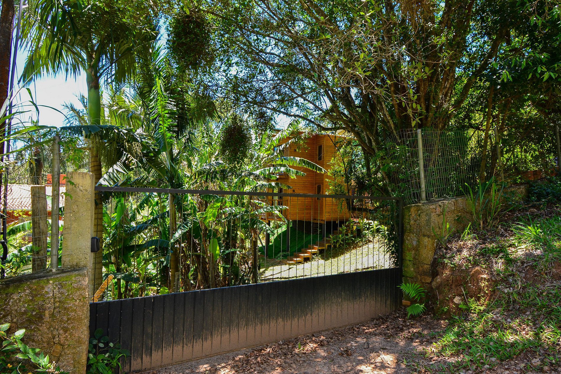 A cabana está situada em um terreno familiar particular, proporcionando um ambiente seguro e estacionamento exclusivo para sua comodidade.