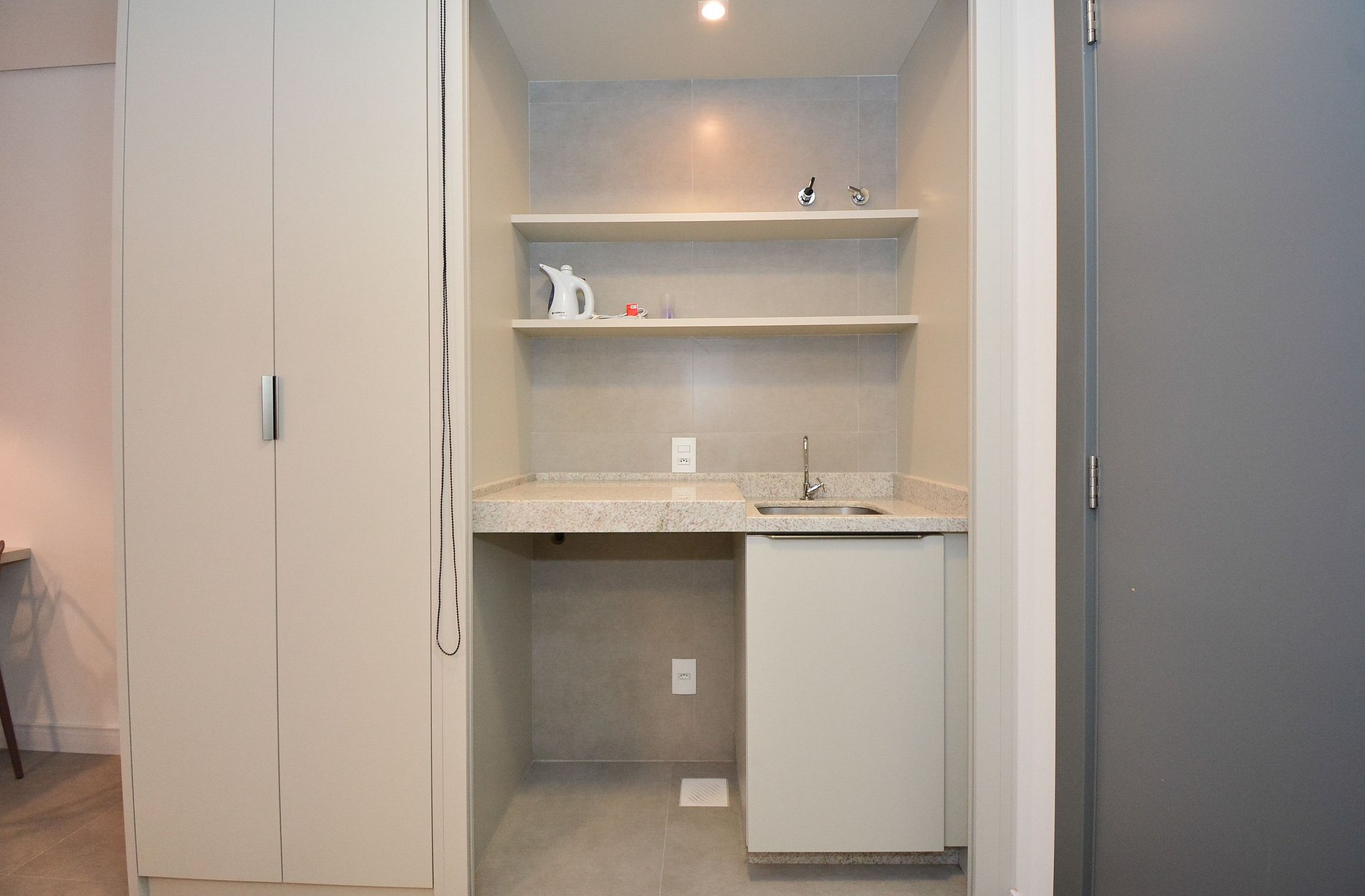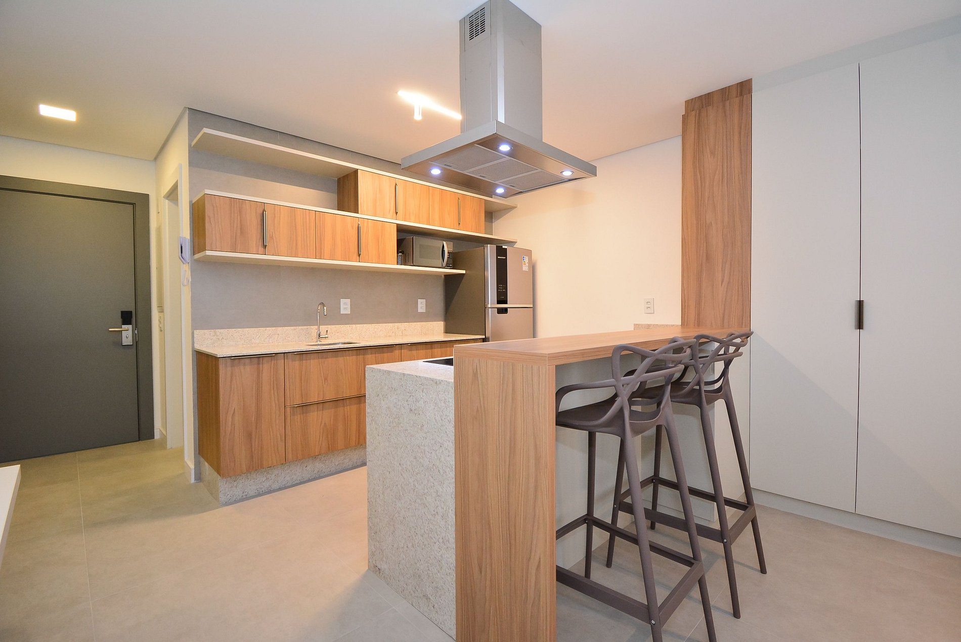 O acesso ao studio é feito por meio de fechadura eletrônica com senha personalizada, enviada antes da chegada, dispensando o uso de chaves físicas e oferecendo ainda mais praticidade.