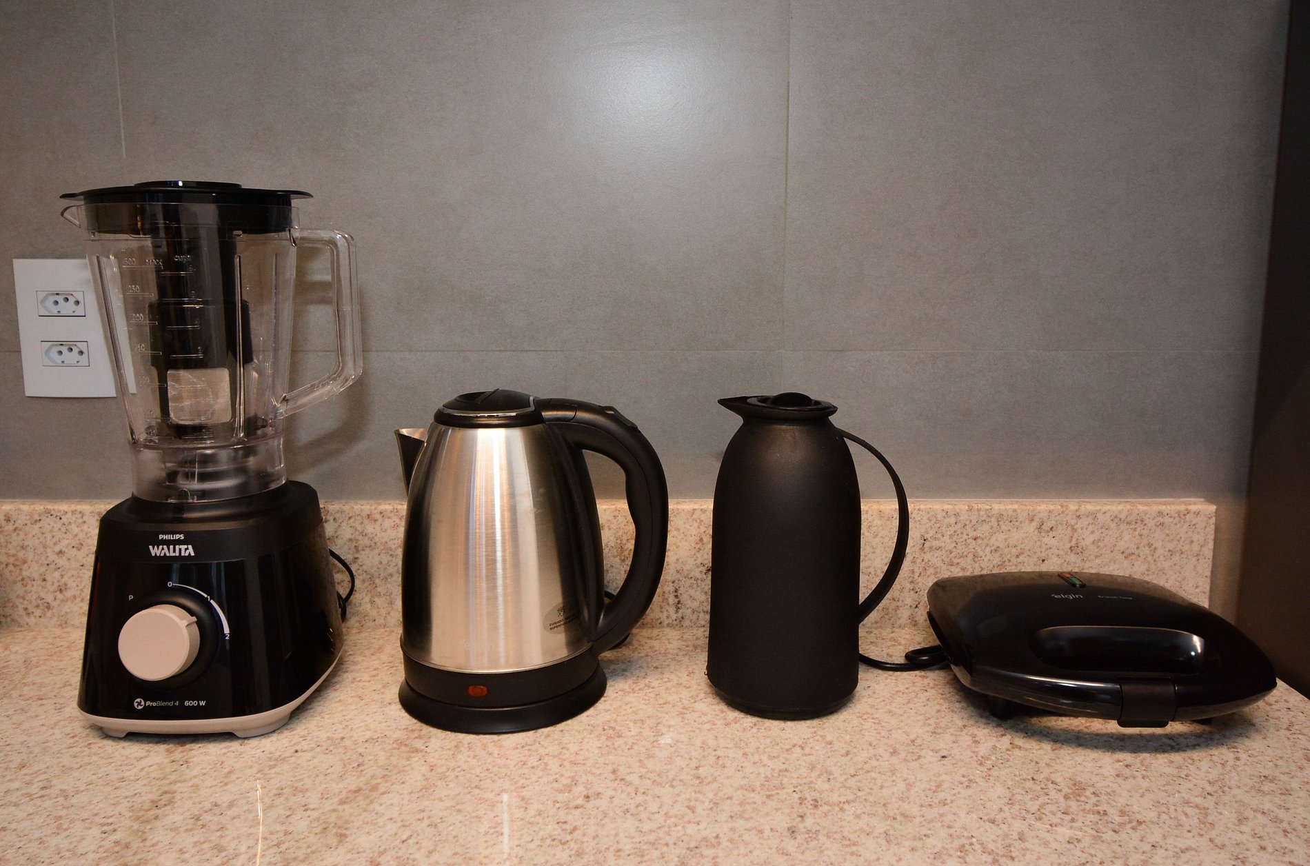 • Cooktop, forno, micro-ondas, geladeira, chaleira elétrica, sanduicheira, liquidificador, panelas variadas.