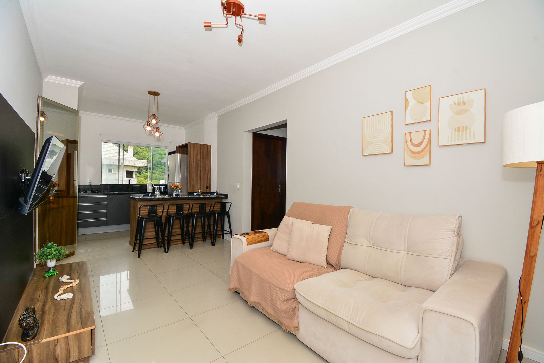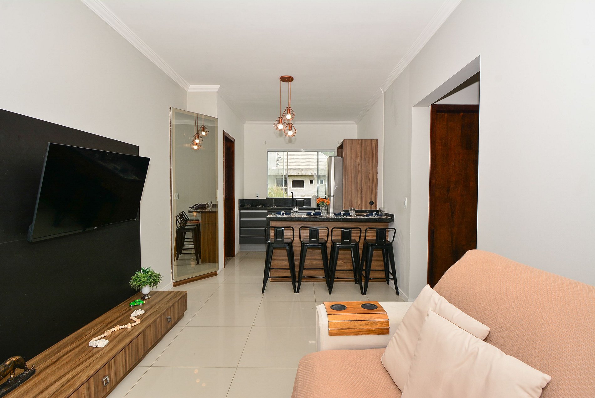 A sala é acolhedora, equipada com sofá e TV, integrada à cozinha completa, criando um ambiente prático para o dia a dia.