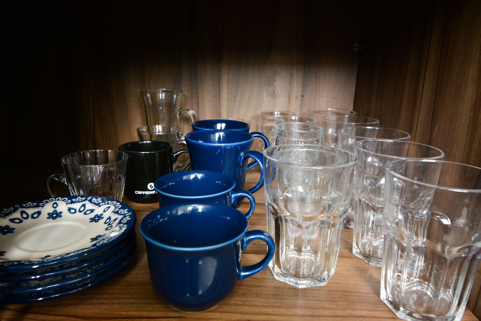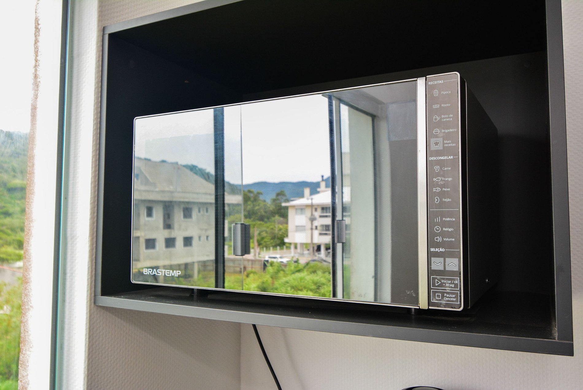 • Cozinha completa equipada com geladeira, fogão, micro-ondas, chaleira elétrica, sanduicheira, liquidificador, panelas, louças e utensílios variados para o preparo de refeições