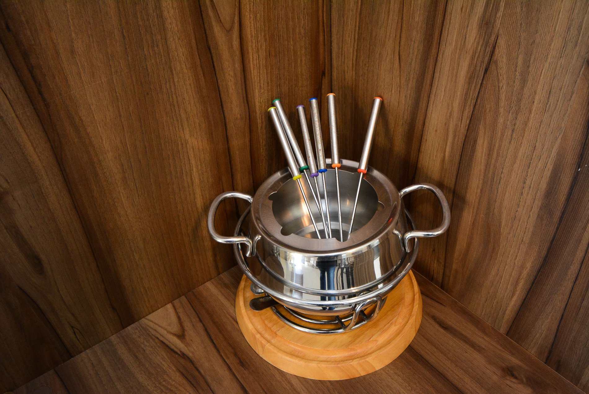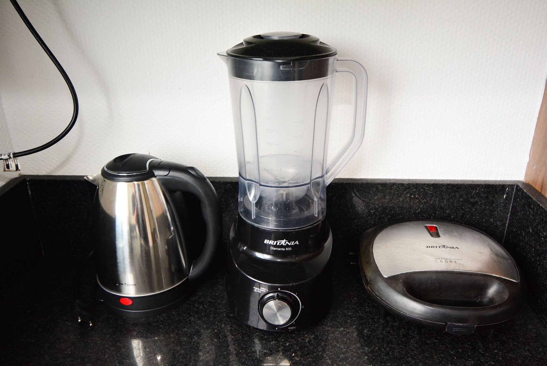 • Cozinha completa equipada com geladeira, fogão, micro-ondas, chaleira elétrica, sanduicheira, liquidificador, panelas, louças e utensílios variados para o preparo de refeições
