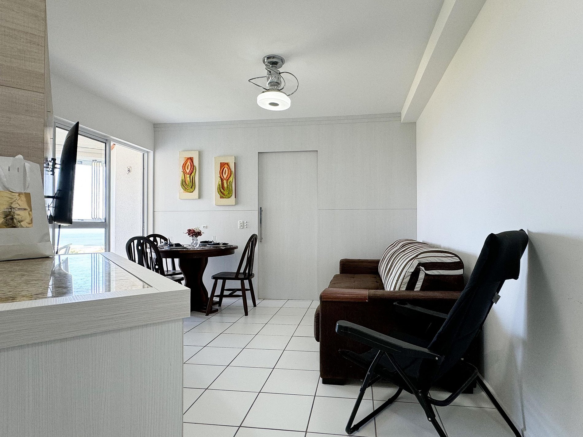 Apartamento com 2 quartos aconchegantes, com ar condicionado em um deles. Ampla sala, cozinha completa. Destaque para a sacada com churrasqueira e uma vista incrível para o mar. Perfeita para momentos de confraternização.