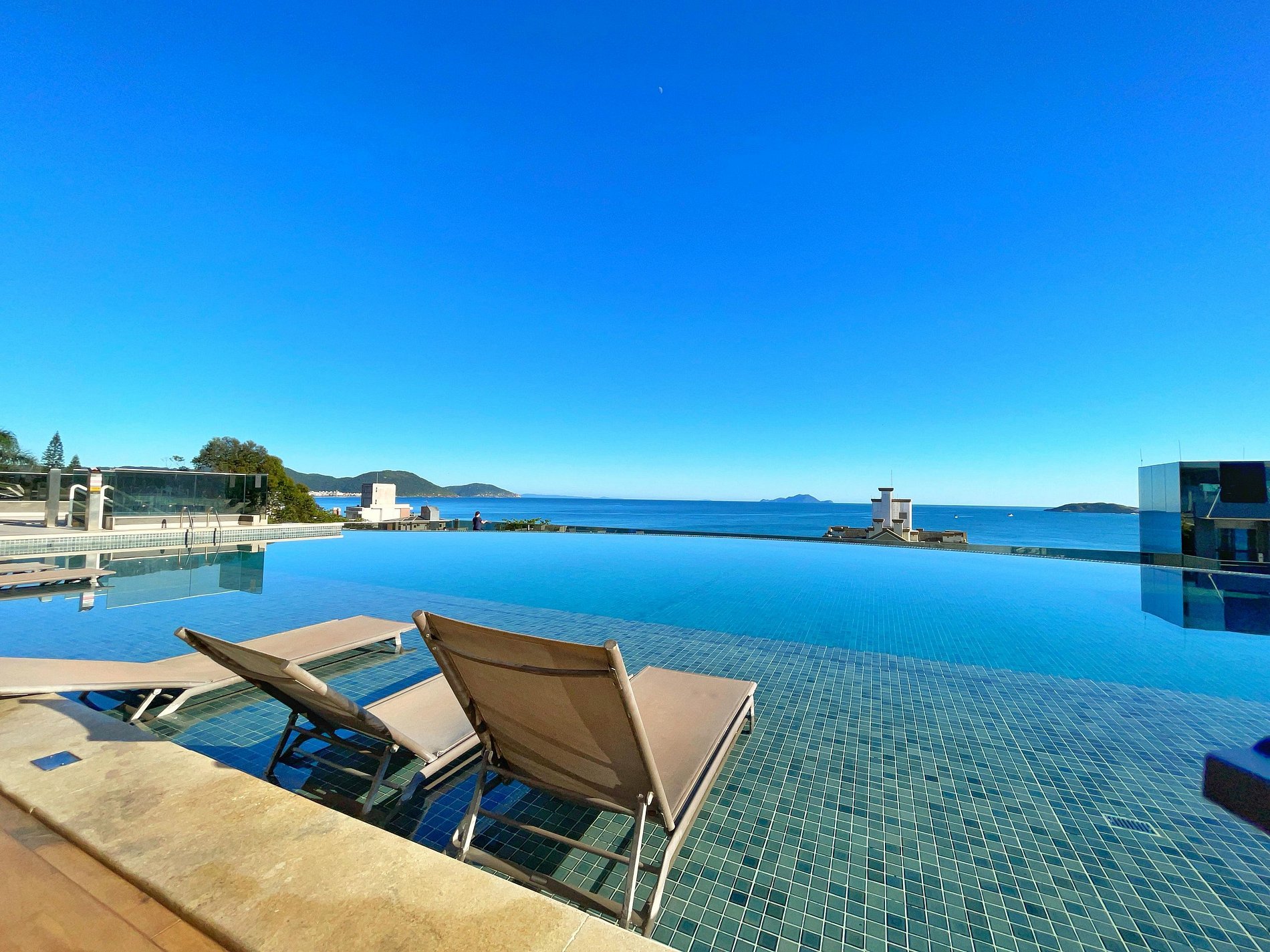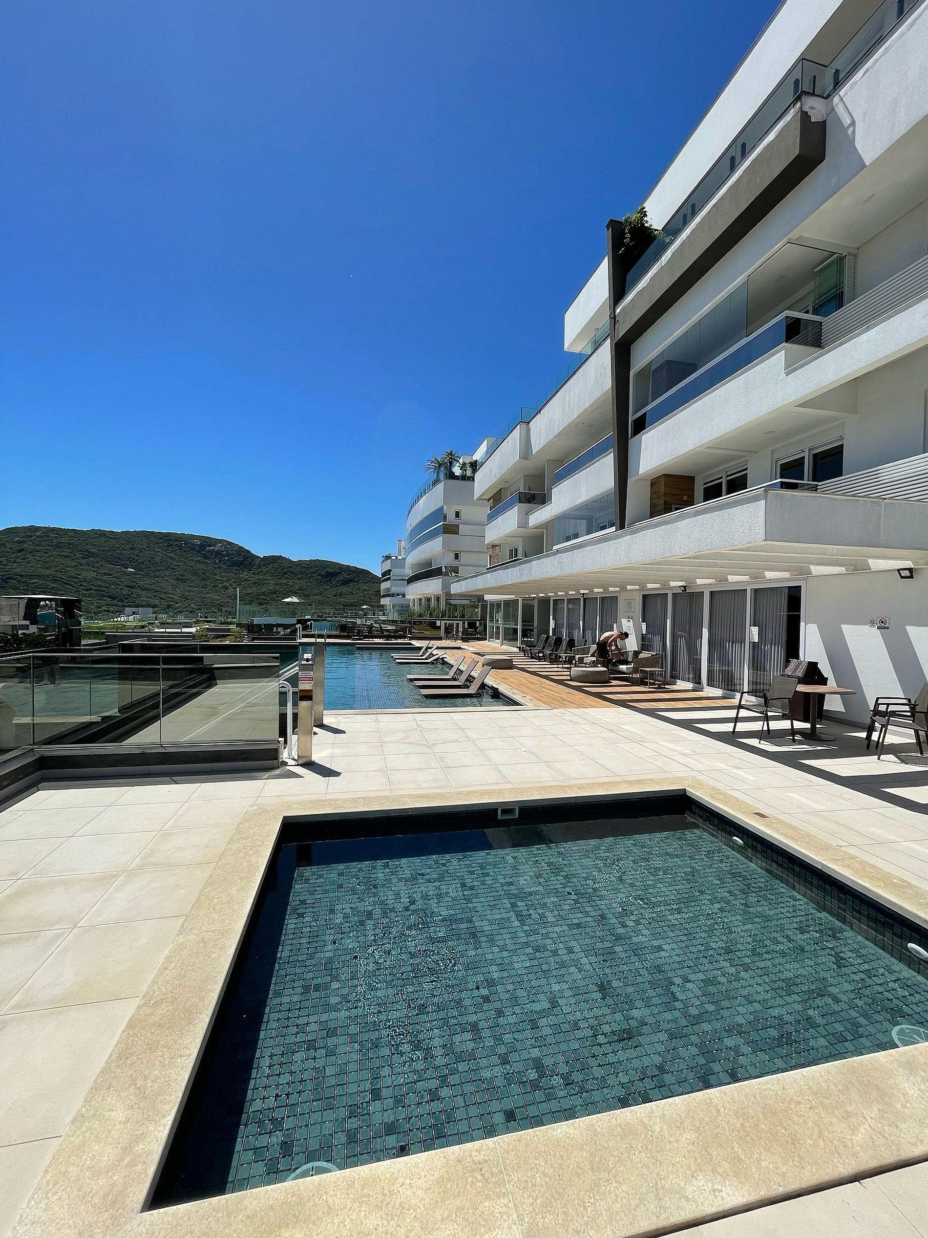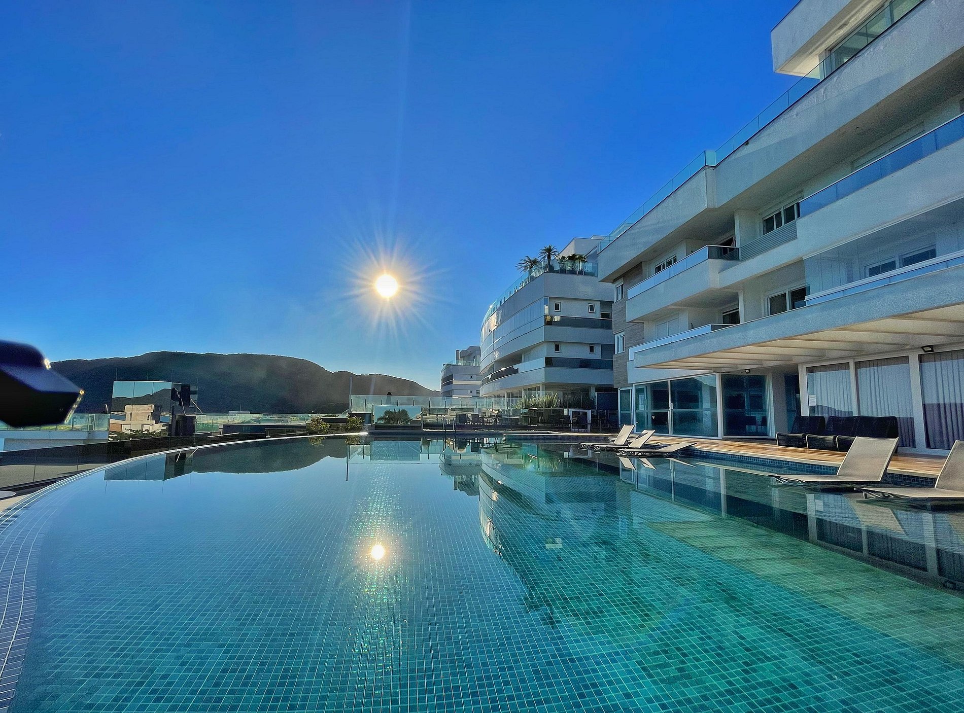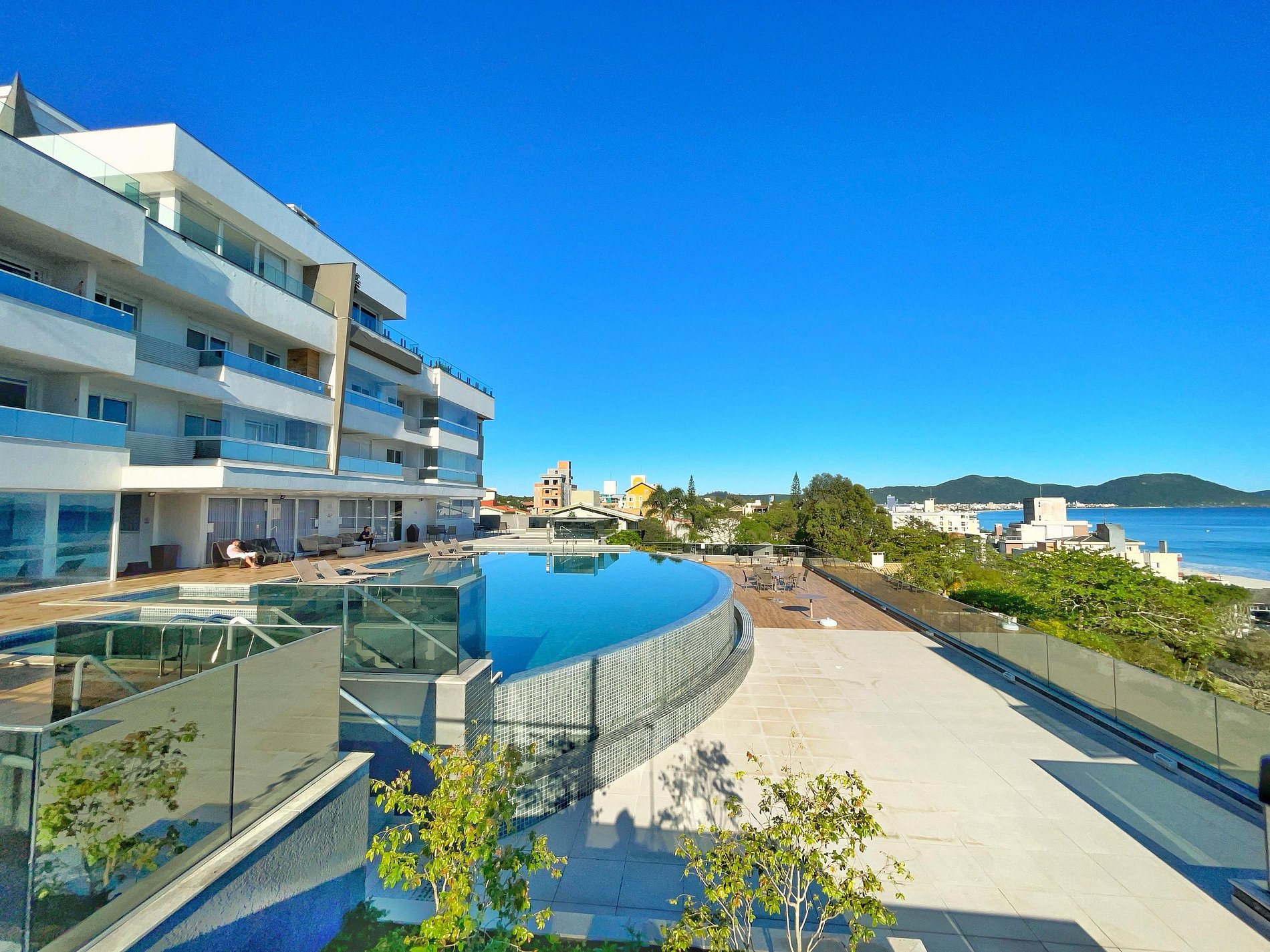 Com piscina de borda infinita e vista deslumbrante, o condomínio conta também uma lavanderia compartilhada e uma loja de conveniência 24h.