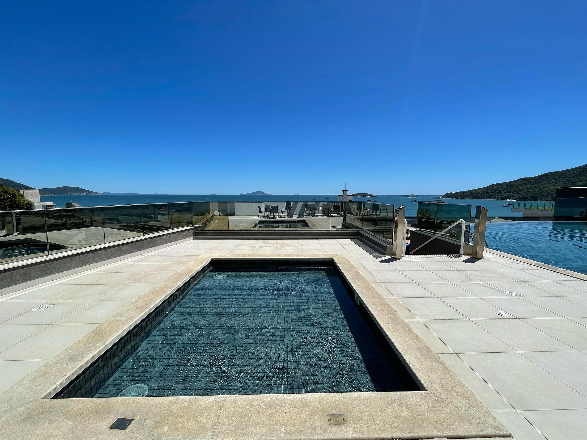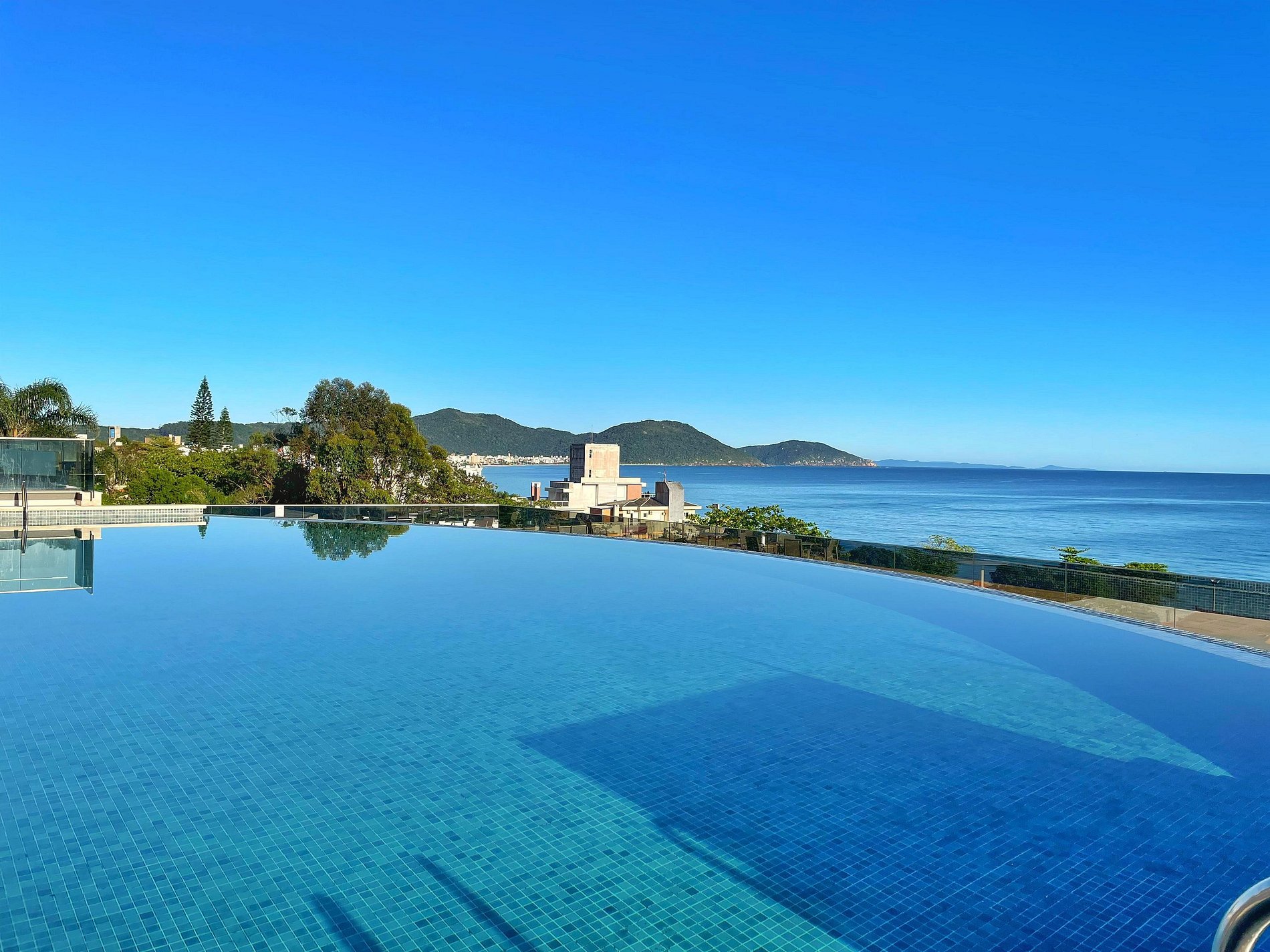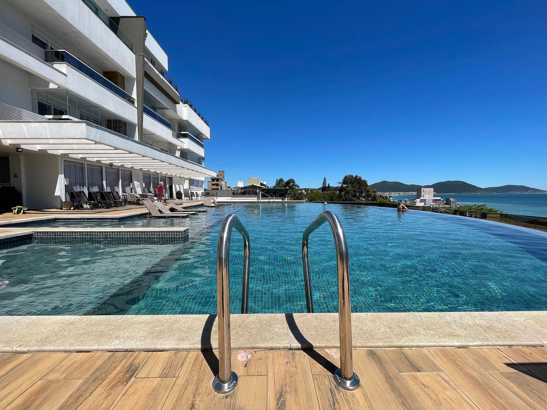 Com piscina de borda infinita e vista deslumbrante, o condomínio conta também uma lavanderia compartilhada e uma loja de conveniência 24h.