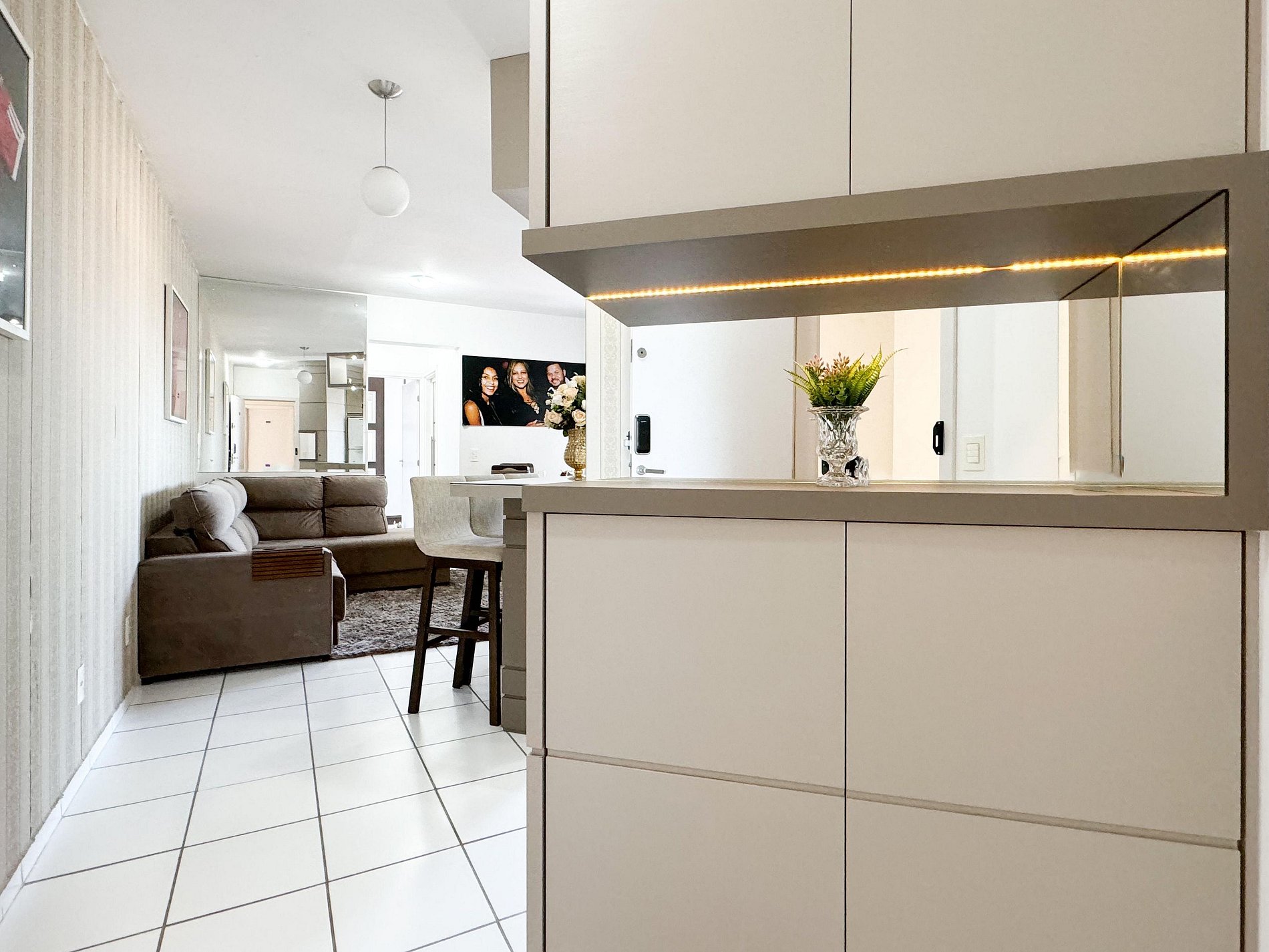 Apartamento com 2 quartos aconchegantes, com ar condicionado na suíte, ampla sala, cozinha completa. Destaque para a sacada com churrasqueira, perfeita para momentos de confraternização.