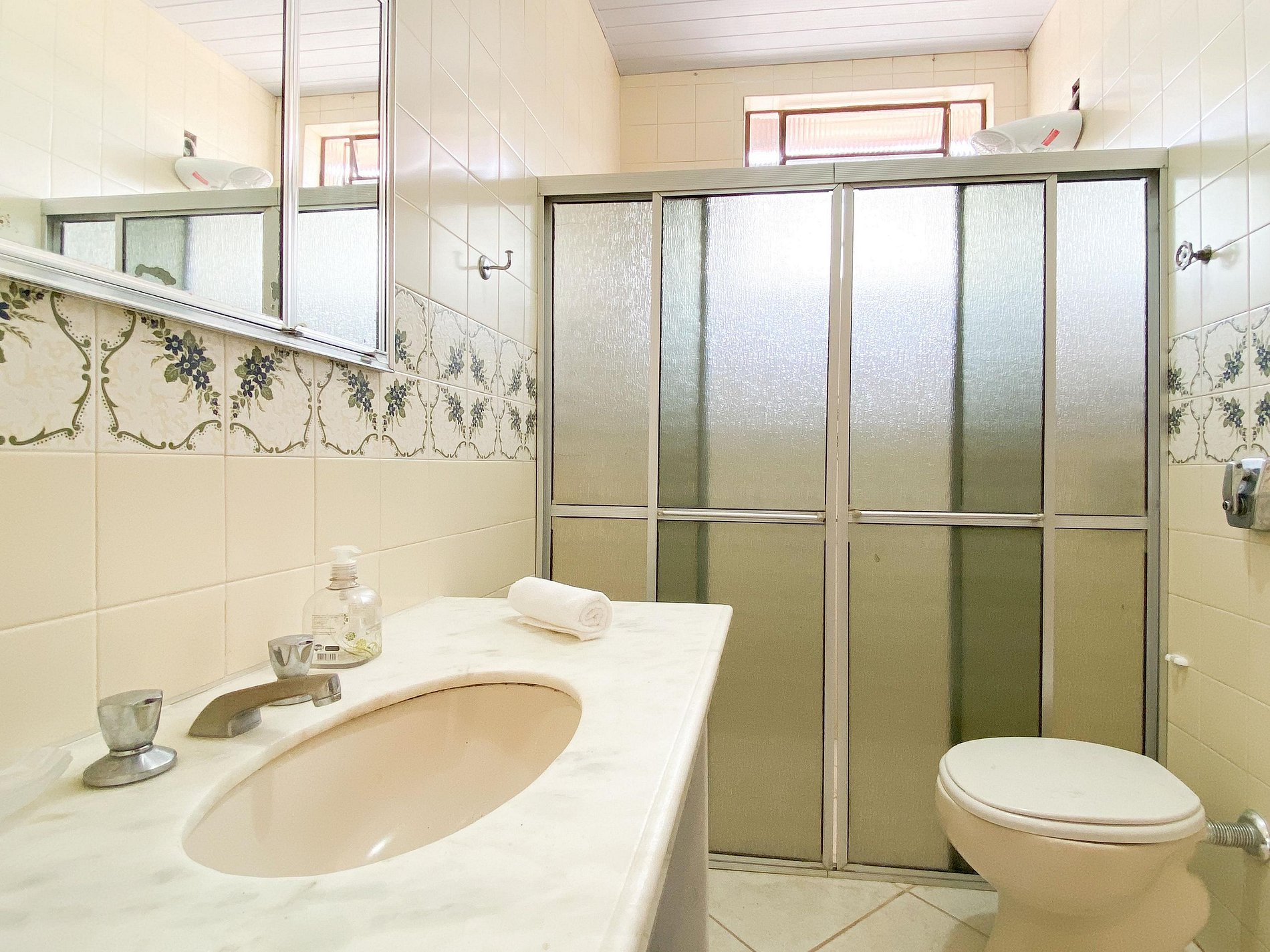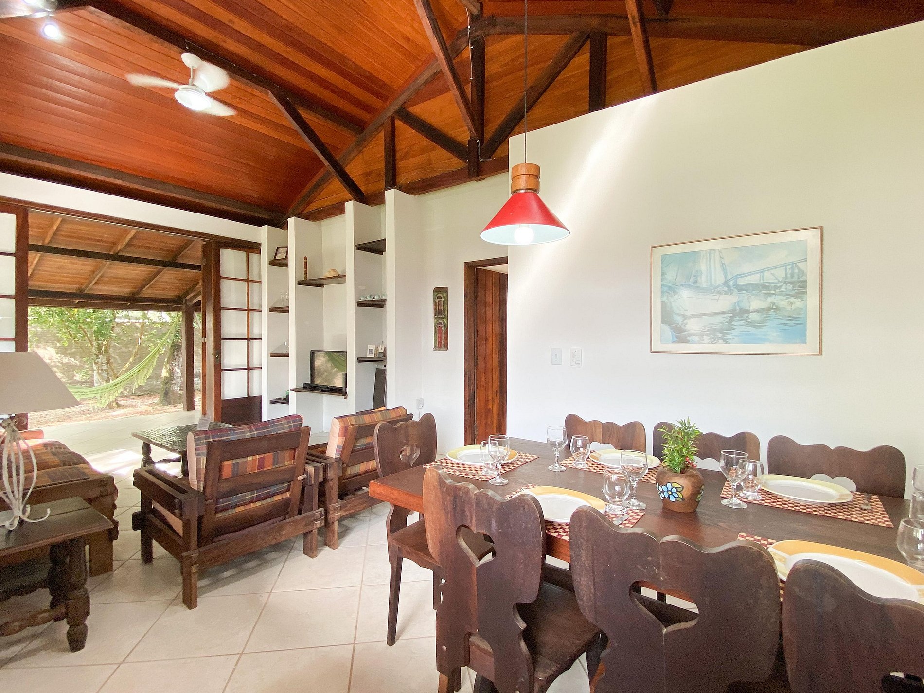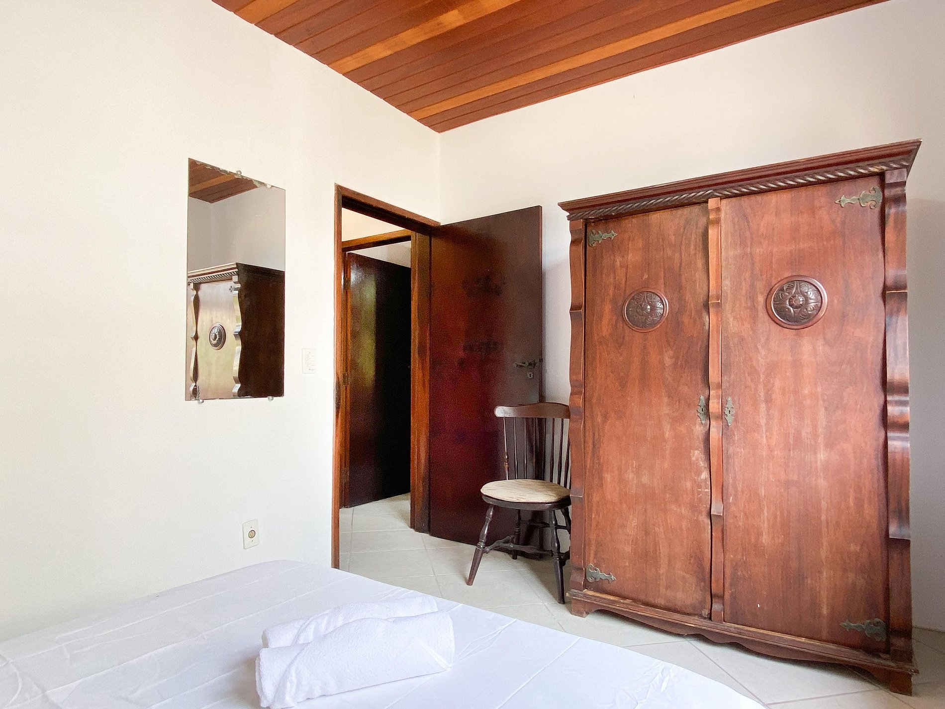A casa principal dispõe de três quartos, sendo dois com cama de casal e um com duas camas de solteiro, além de dois colchões extras de solteiro. Conta com um banheiro social. Nos fundos do terreno há uma suíte auxiliar independente, equipada com cama de casal e banheiro privativo, garantindo mais privacidade.A área externa se destaca pela churrasqueira, ampla varanda com redes de descanso e mesas e cadeiras para relaxar, além de um grande com árvores, ideal para momentos de confraternização e tranquilidade.