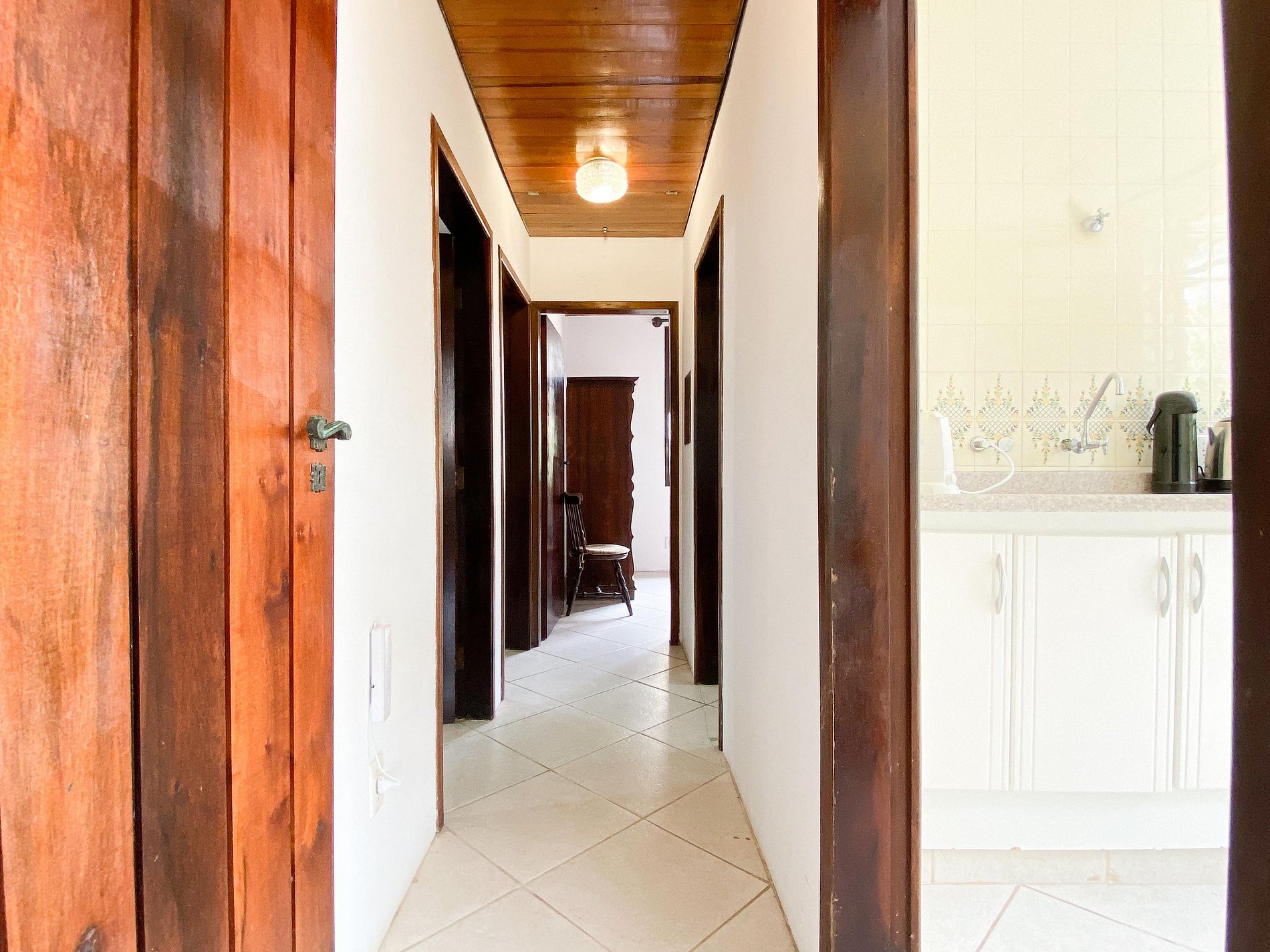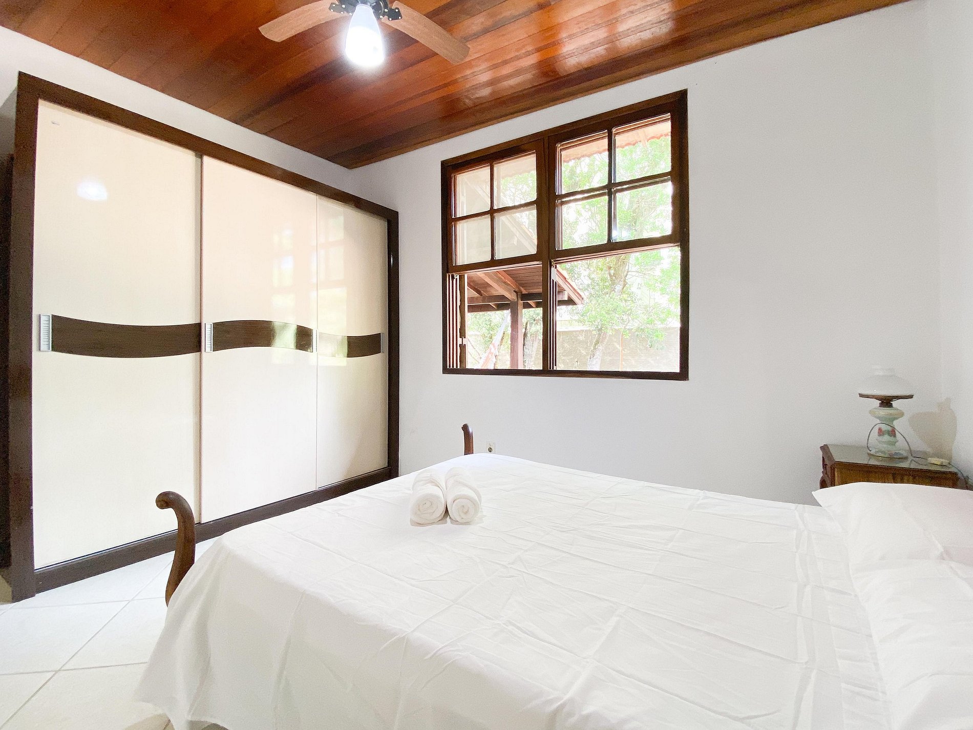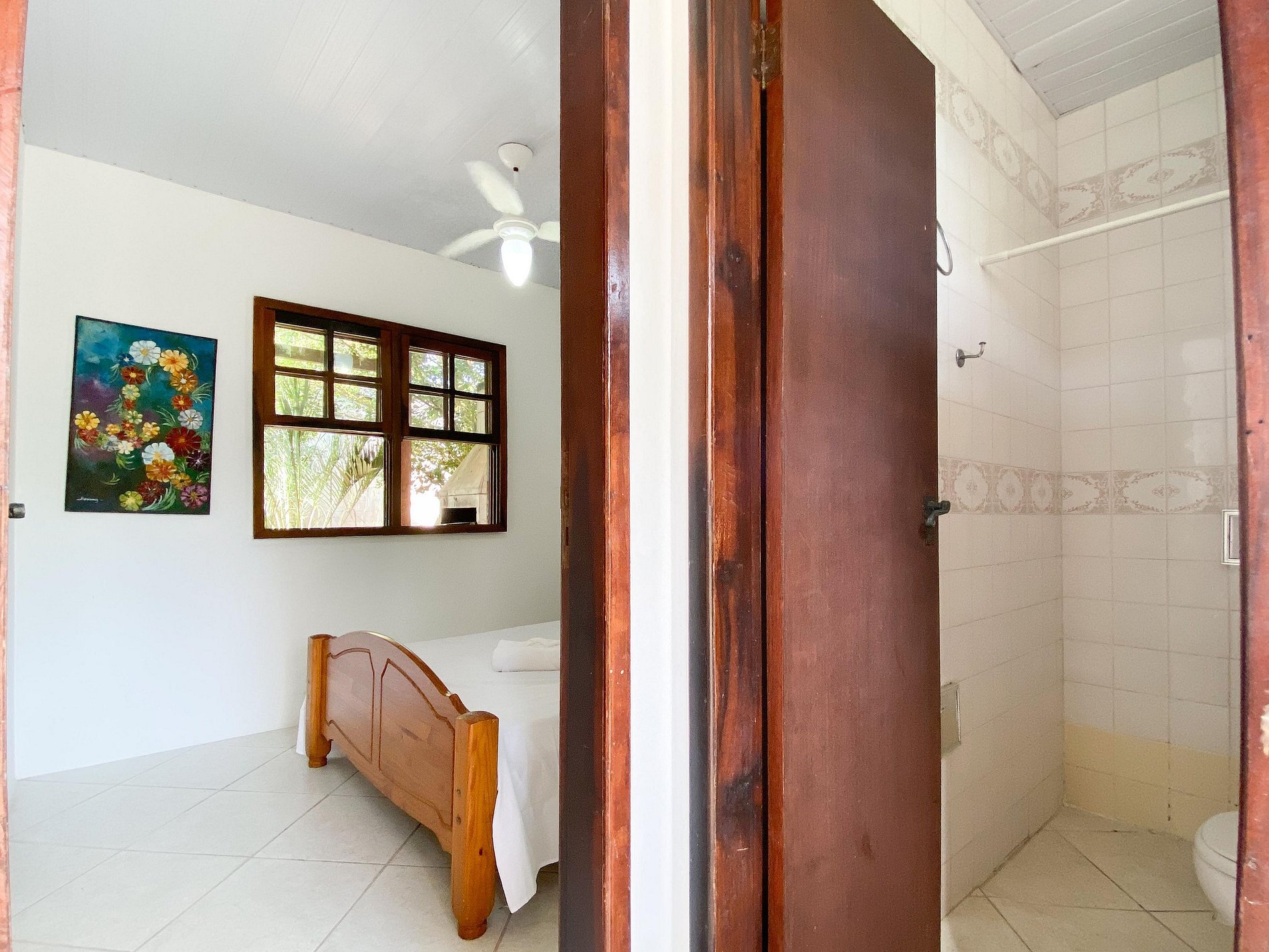 A casa principal dispõe de três quartos, sendo dois com cama de casal e um com duas camas de solteiro, além de dois colchões extras de solteiro. Conta com um banheiro social. Nos fundos do terreno há uma suíte auxiliar independente, equipada com cama de casal e banheiro privativo, garantindo mais privacidade.A área externa se destaca pela churrasqueira, ampla varanda com redes de descanso e mesas e cadeiras para relaxar, além de um grande com árvores, ideal para momentos de confraternização e tranquilidade.