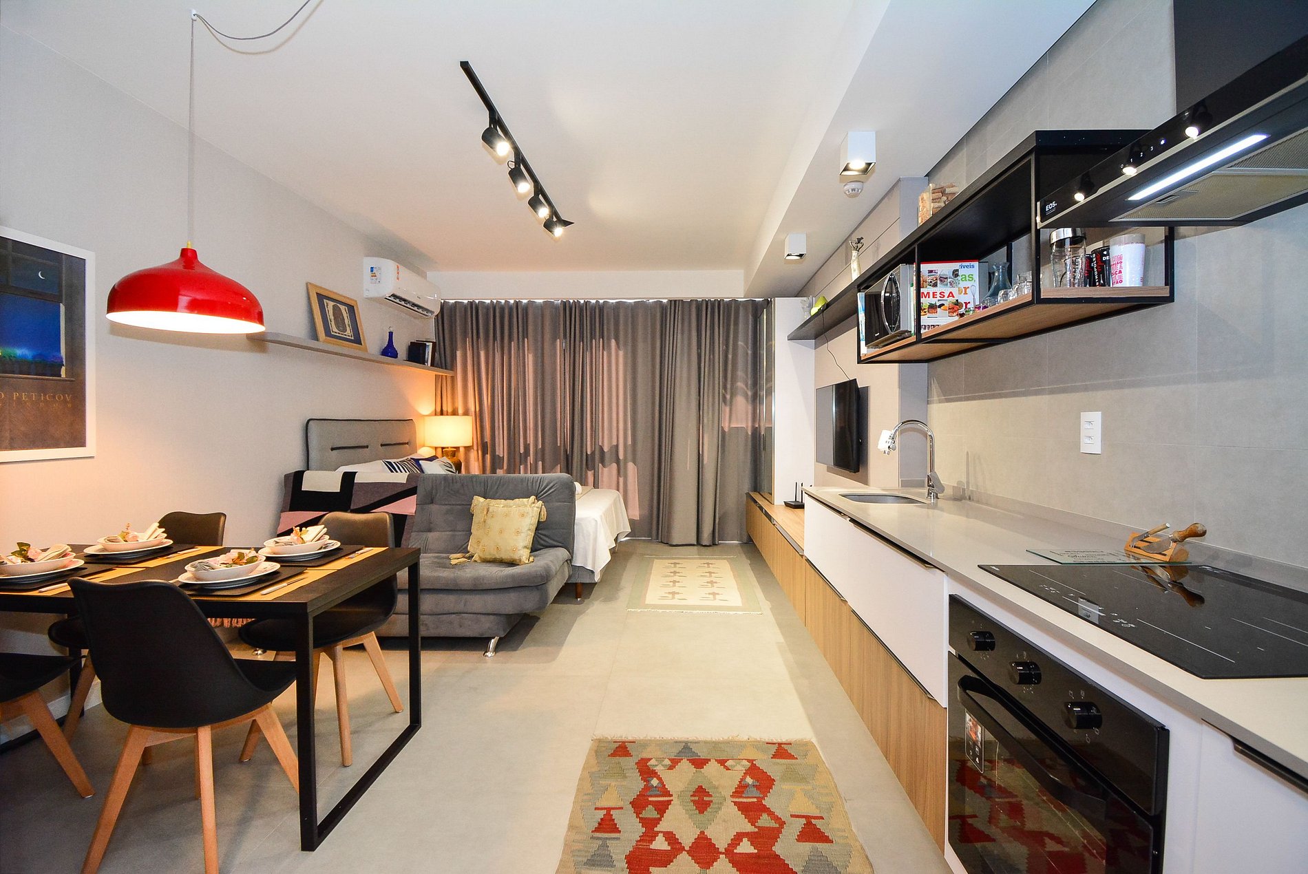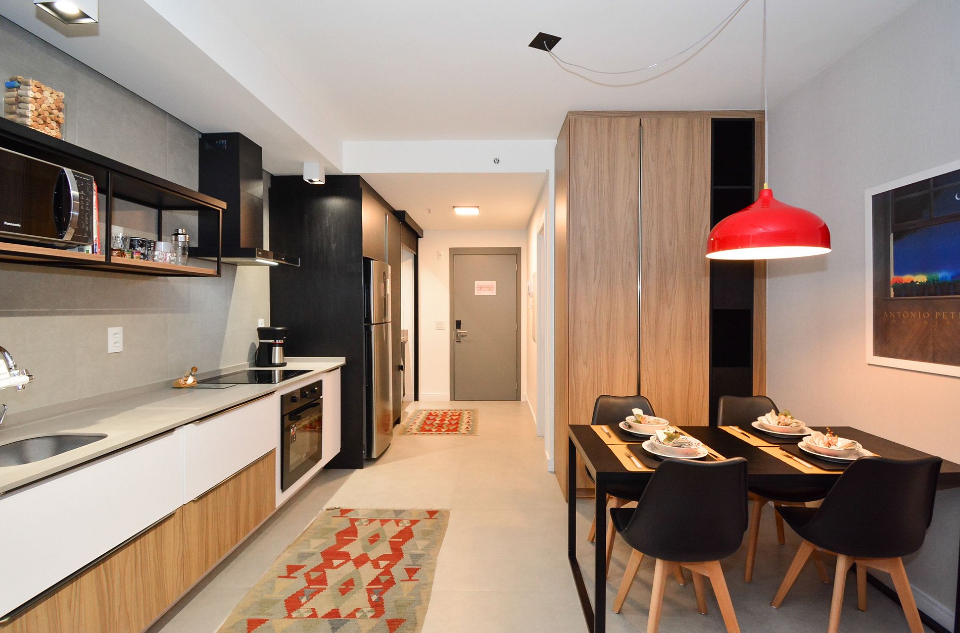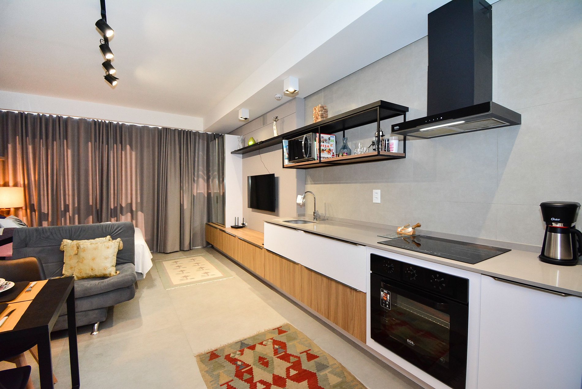• Cooktop, forno, micro-ondas, geladeira, cafeteira, panelas.