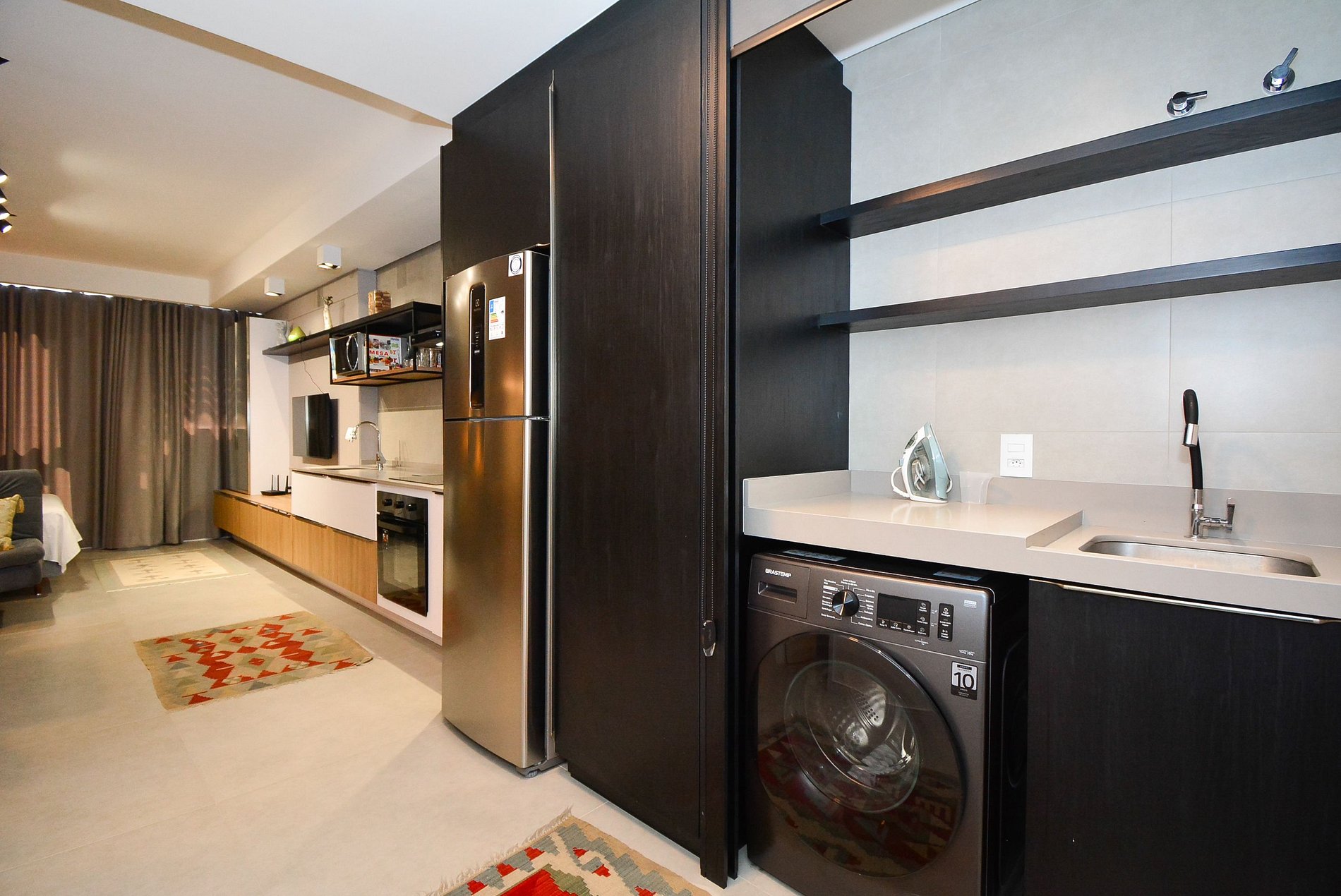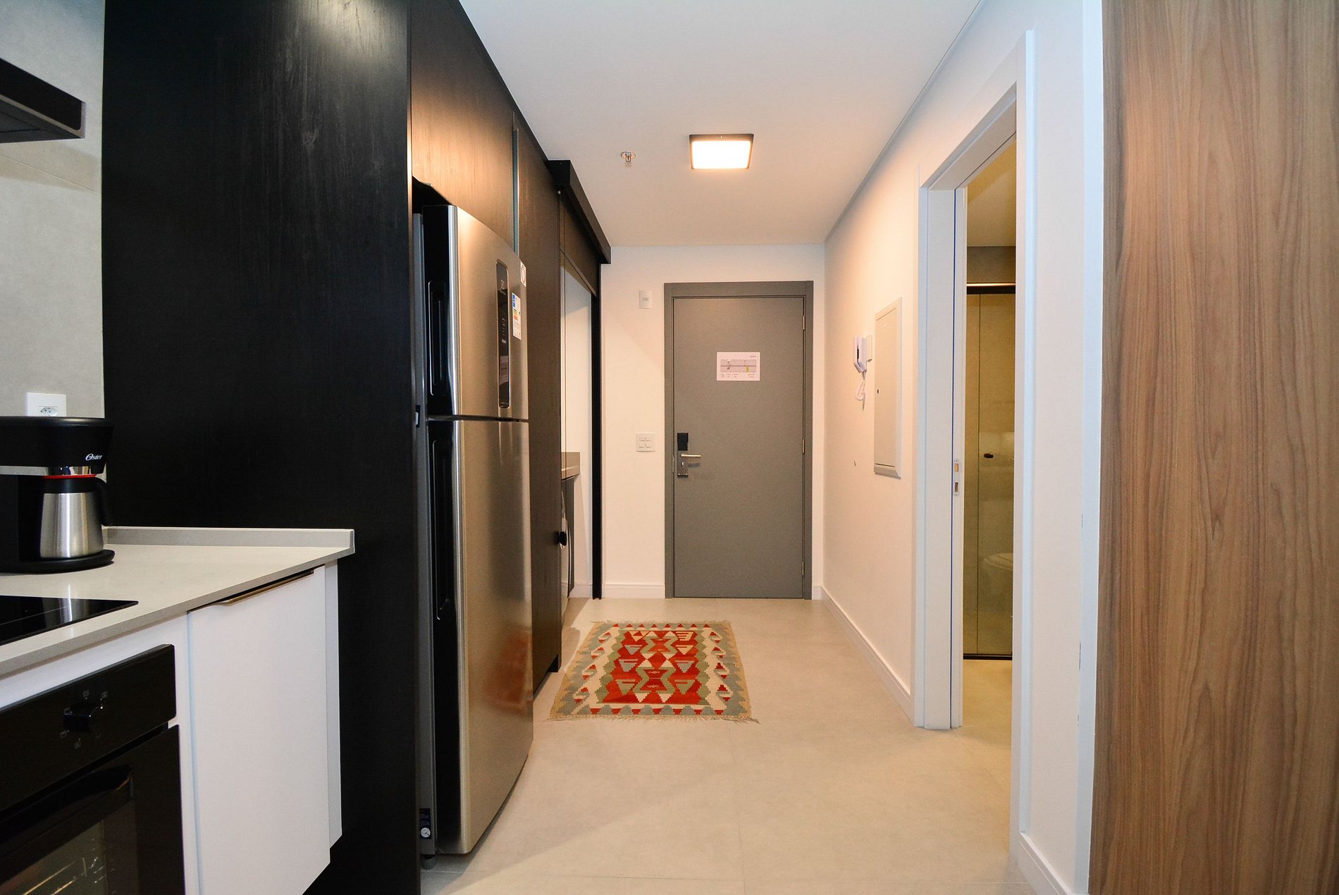 O acesso ao studio é feito por meio de fechadura eletrônica com senha personalizada, enviada antes da chegada, dispensando o uso de chaves físicas e oferecendo ainda mais praticidade.