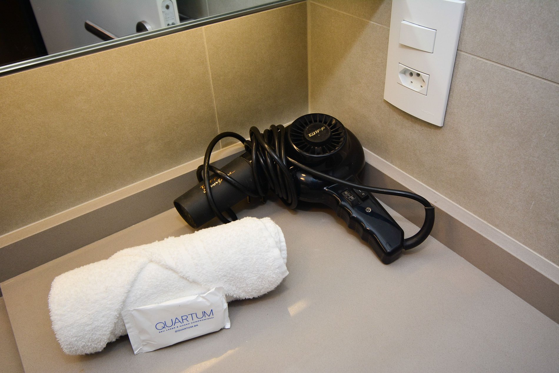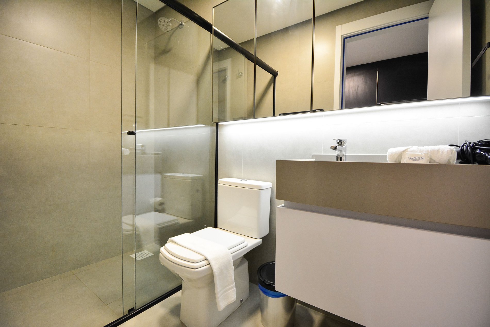 • Banheiro privativo com box de vidro, chuveiro a gás, toalhas de banho e rosto disponíveis, secador de cabelo.