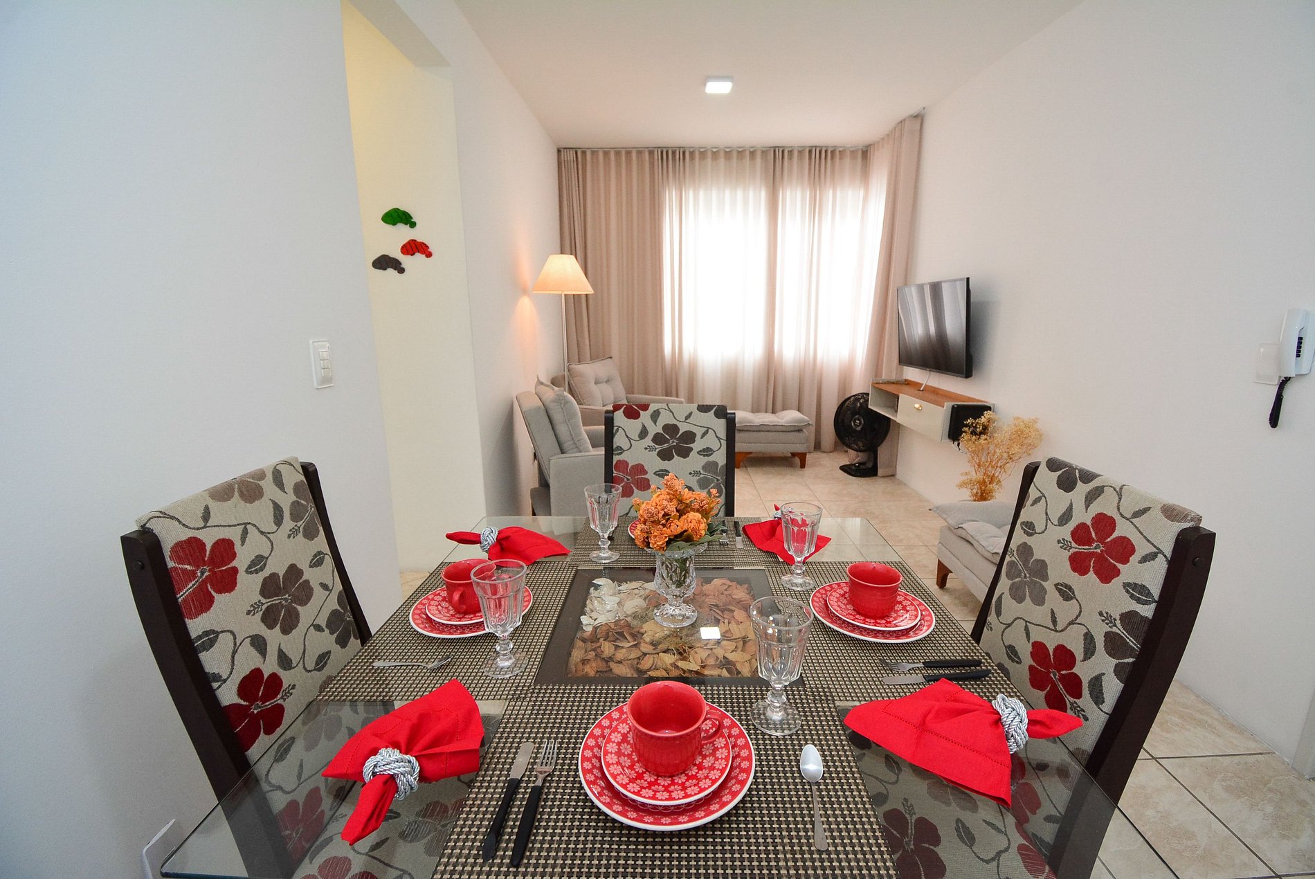 Conta com banheiro social e área social integrada, composta por sala de estar com duas poltronas e dois puffs e TV, sala de jantar com mesa para quatro lugares e um segundo espaço com mesa e cadeira para trabalho ou estudo.