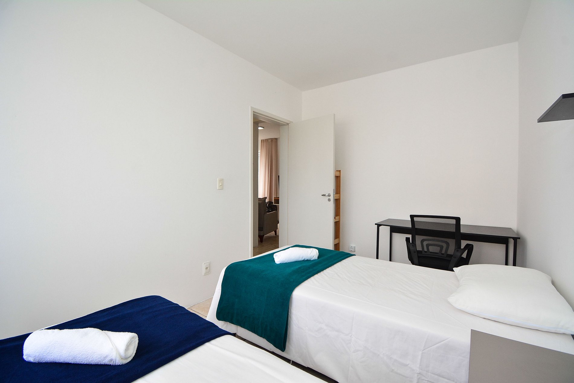 Apartamento confortável e bem distribuído, com capacidade para até 4 hóspedes. Possui dois quartos, ambos com ar-condicionado: um com cama de casal e outro com duas camas de solteiro, que podem ser unidas formando uma cama de casal, além de mesa com cadeira para home office ou estudos.