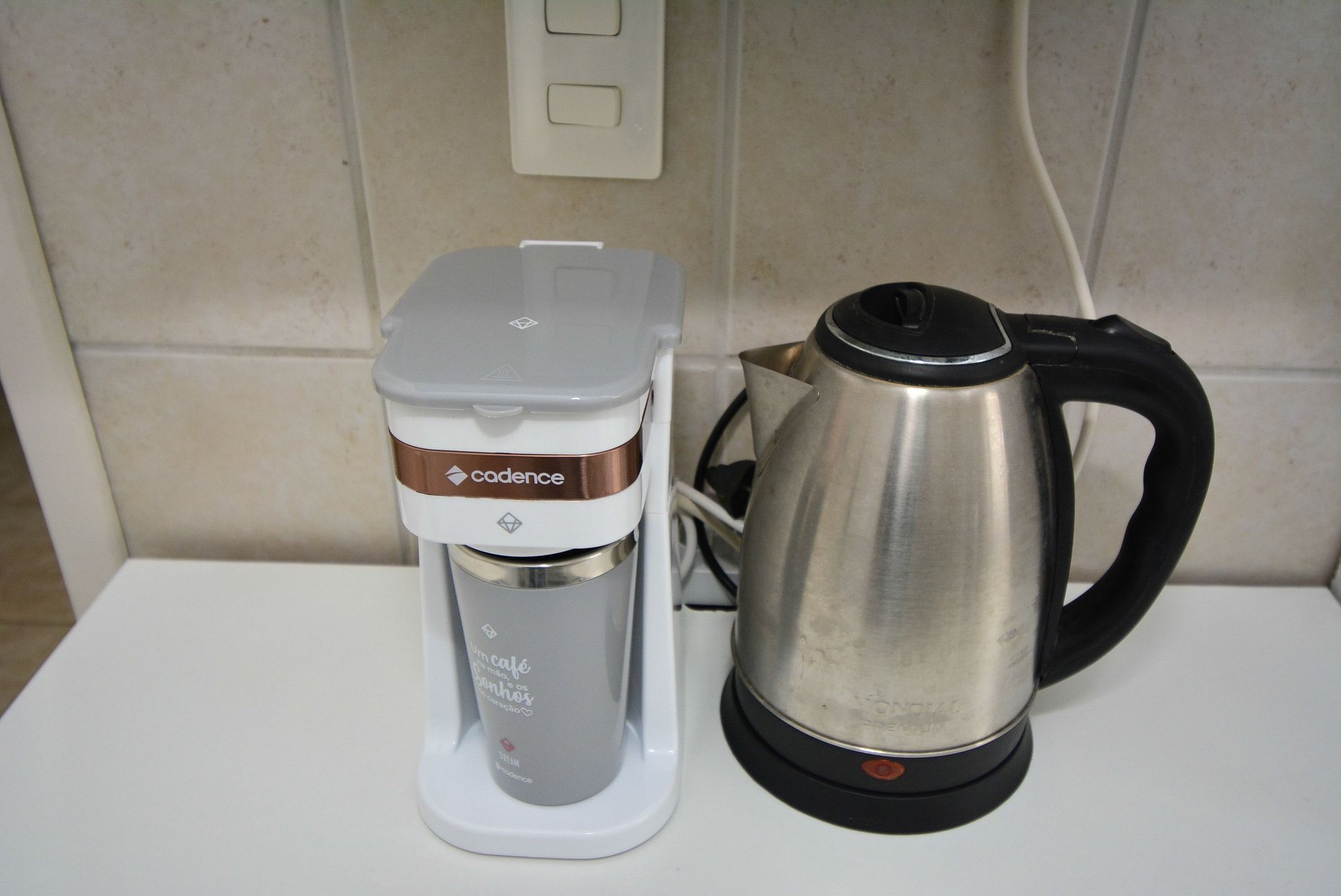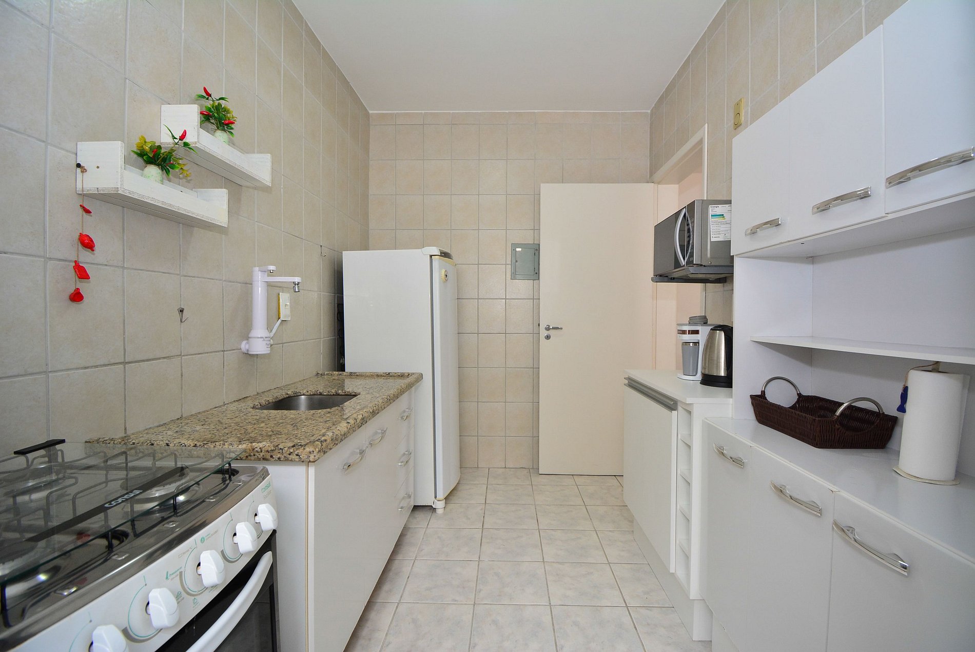 • Itens de cozinha: geladeira, fogão, forno, micro-ondas, chaleira elétrica, sanduicheira, panelas e utensílios básicos