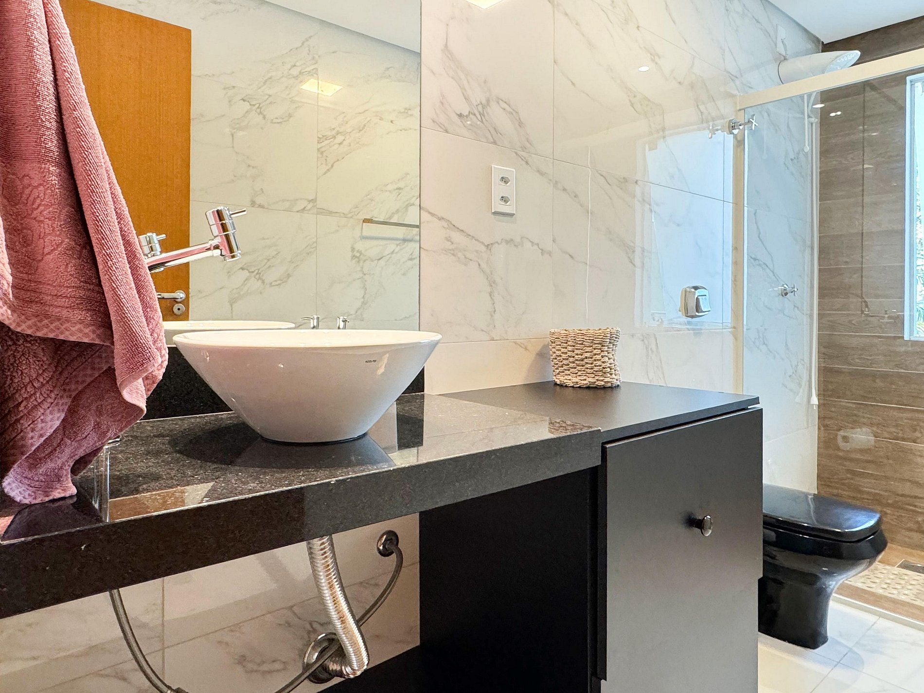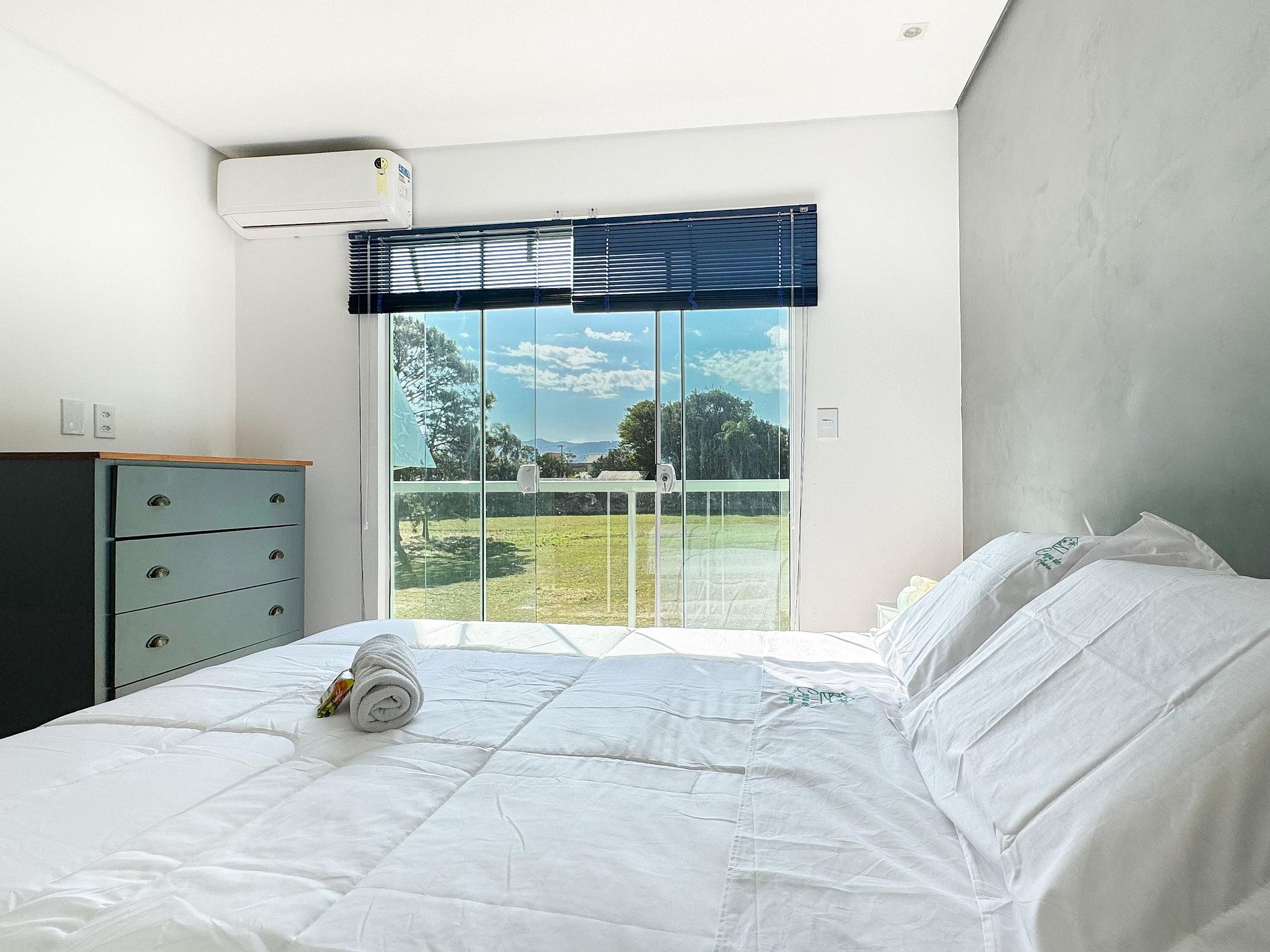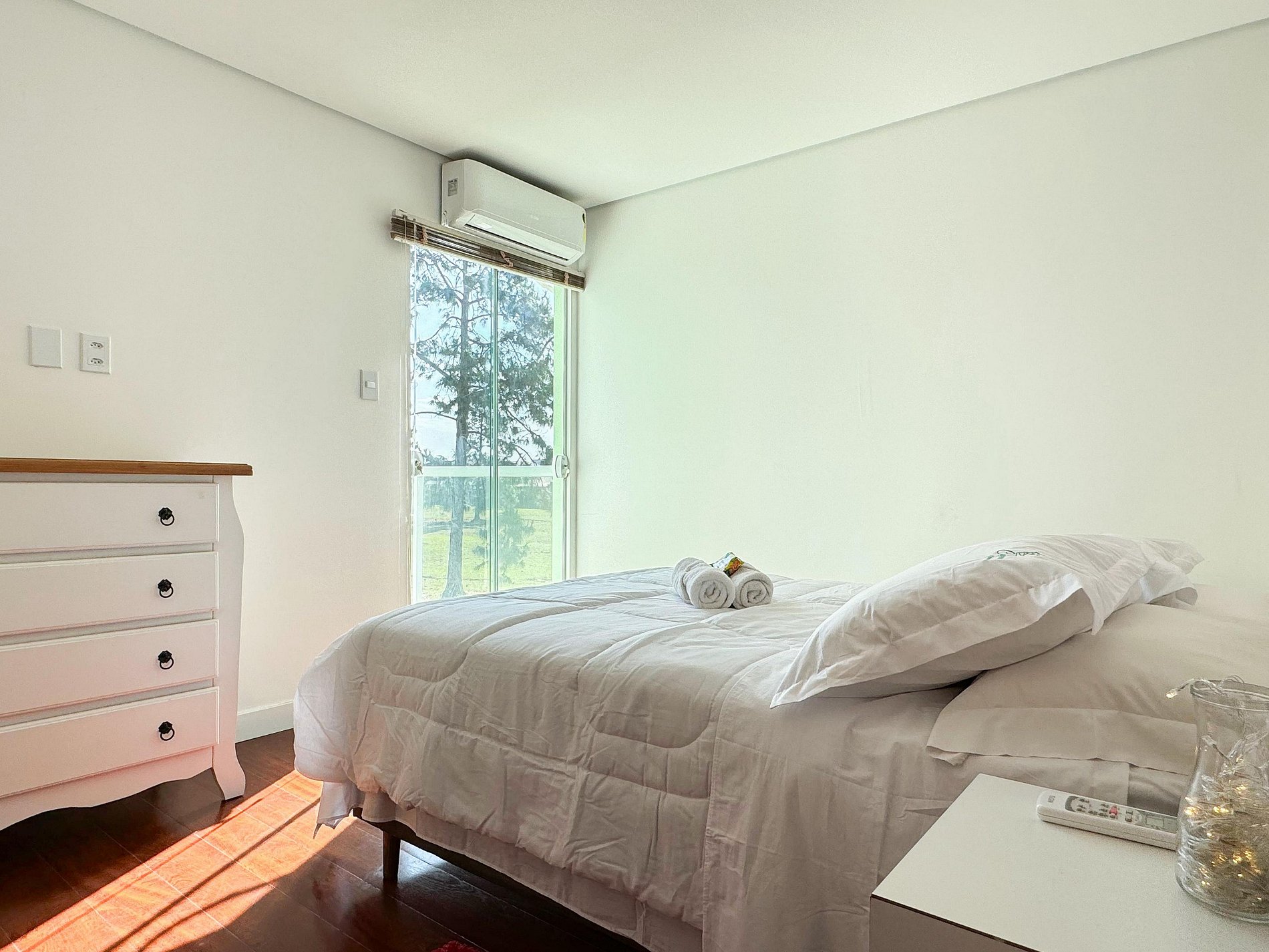 A casa possui 4 quartos, sendo uma suíte no térreo com varanda e vista para o jardim e piscina, no andar superior, uma segunda suíte com duas duchas, duas pias e uma ampla varanda também com vista para o jardim e piscina, além de dois quartos demi-suíte, onde o banheiro é compartilhado entre os dois e oferece vista para um terreno onde frequentemente se avistam cavalos, trazendo a tranquilidade do campo, o que tona o local tranquilo. Todos os quartos estão equipados com ar-condicionado, proporcionando um ambiente fresco e agradável. Para maior comodidade, fornecemos roupas de cama e banho.