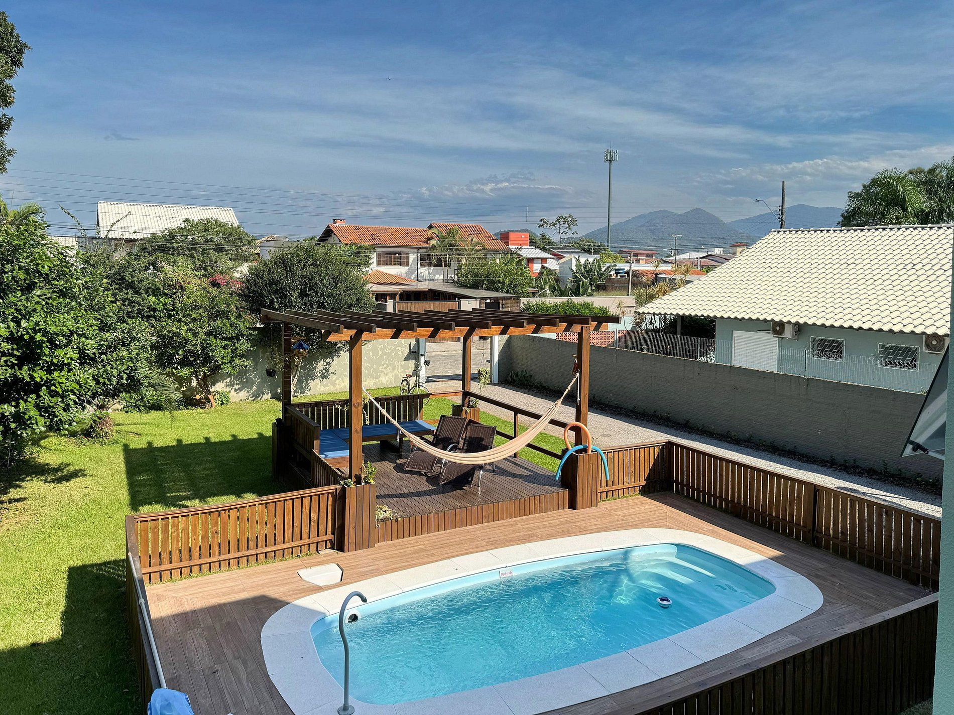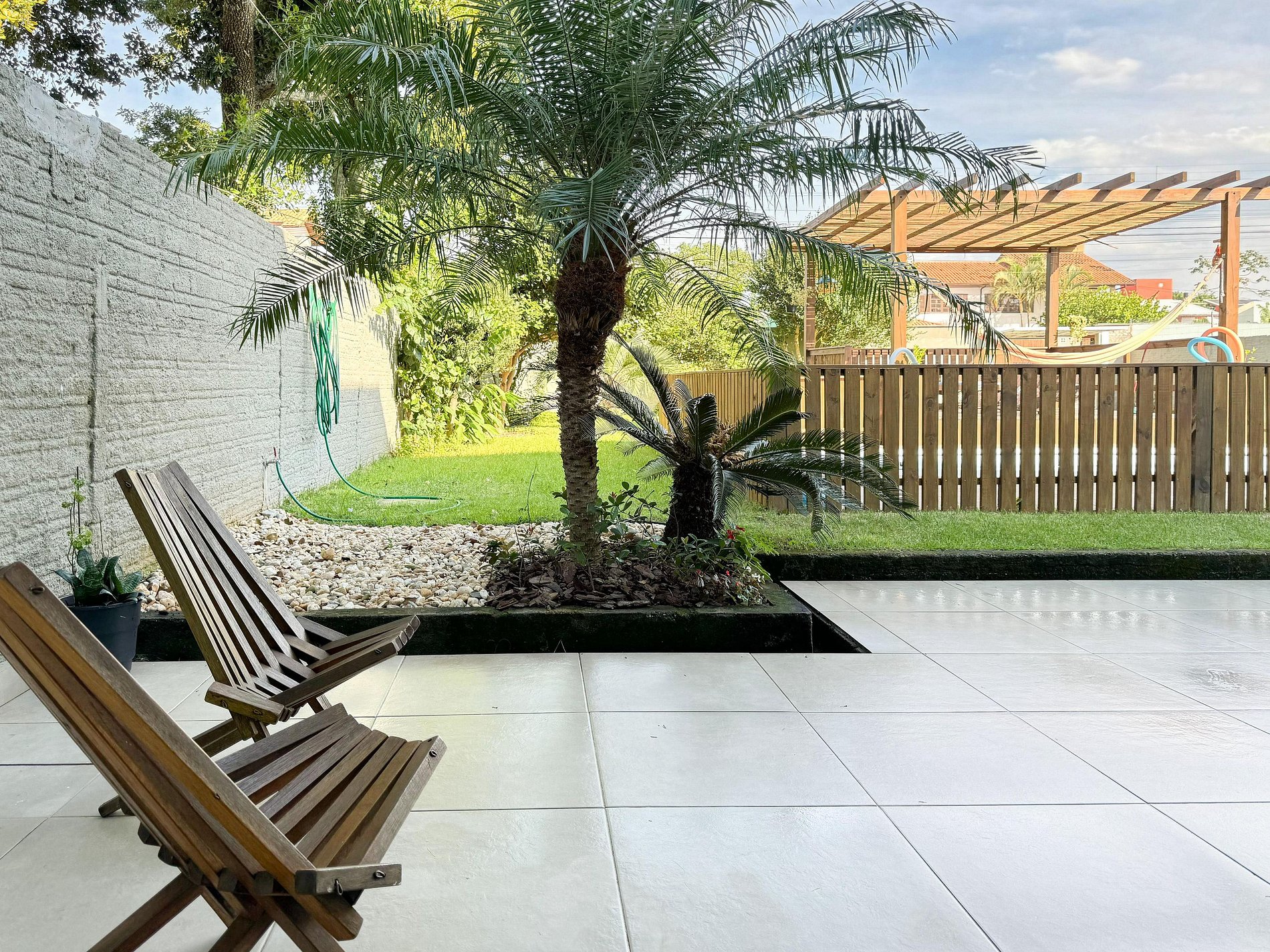 O extenso jardim é um convite ao relaxamento, com um deck onde se encontra uma piscina refrescante e um charmoso pergolado, perfeito para desfrutar de um bom livro ou um bate-papo.