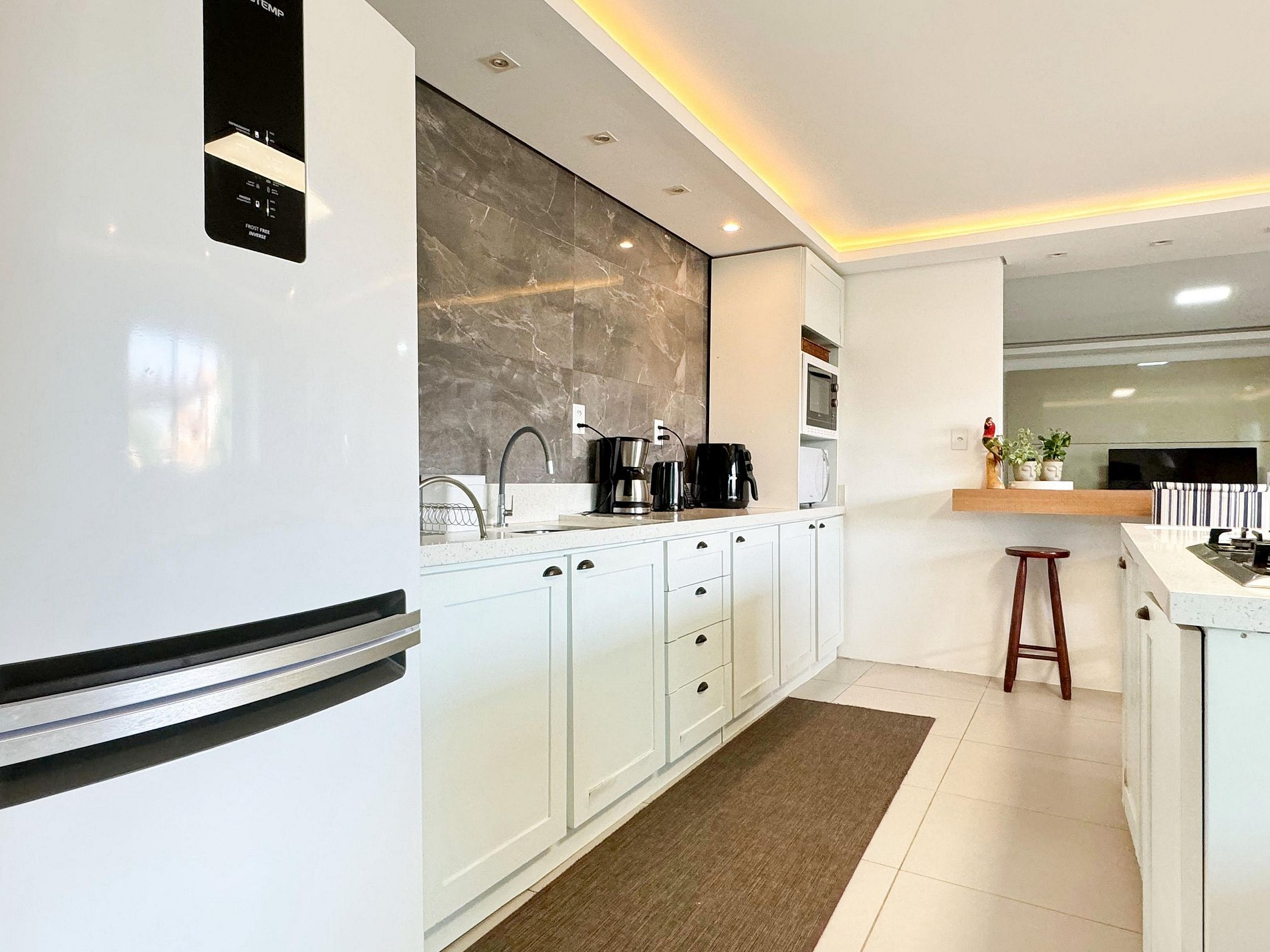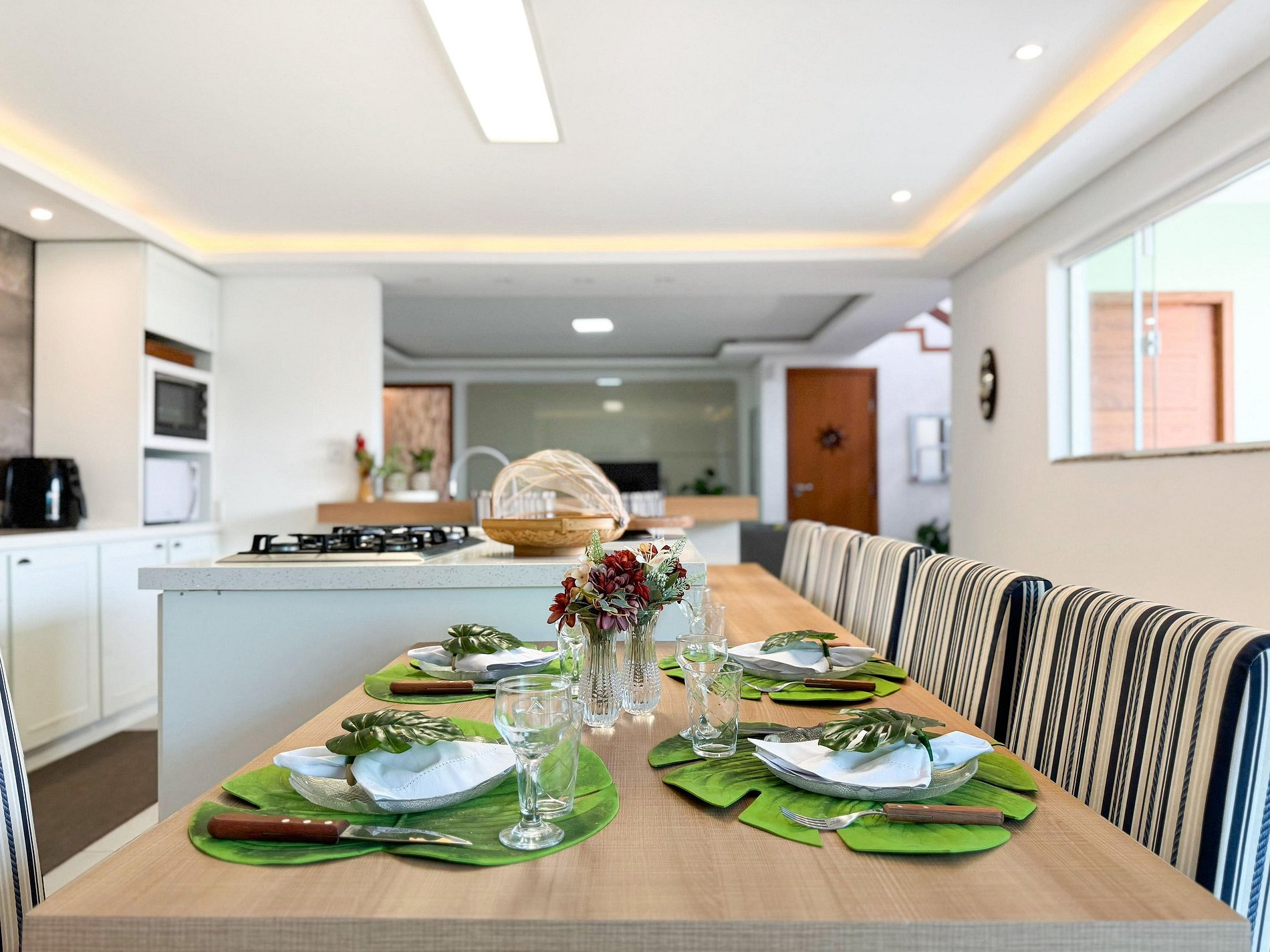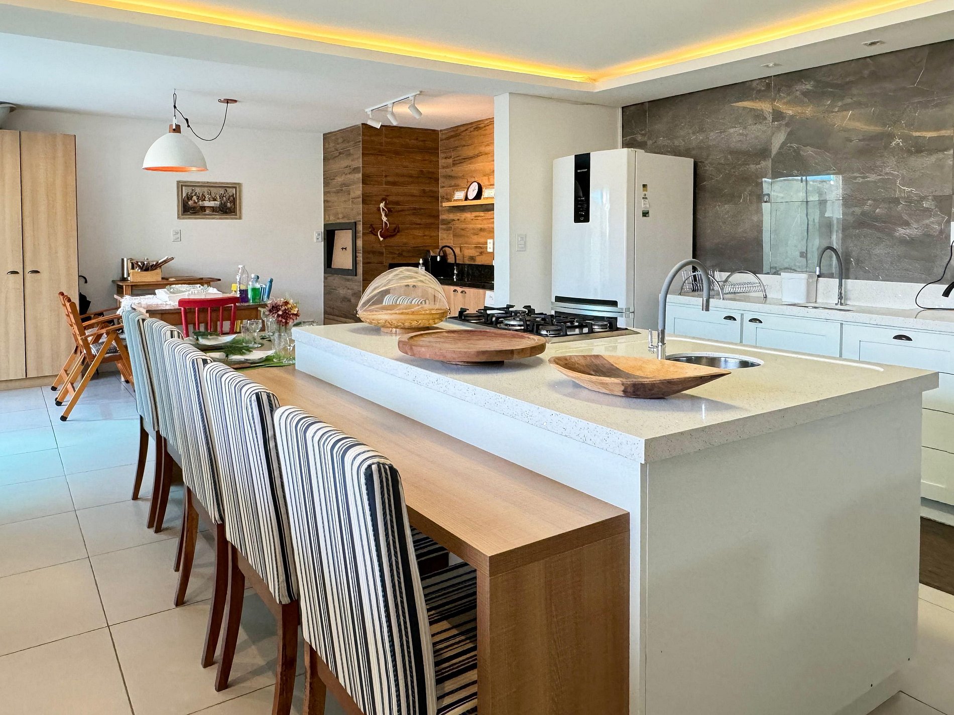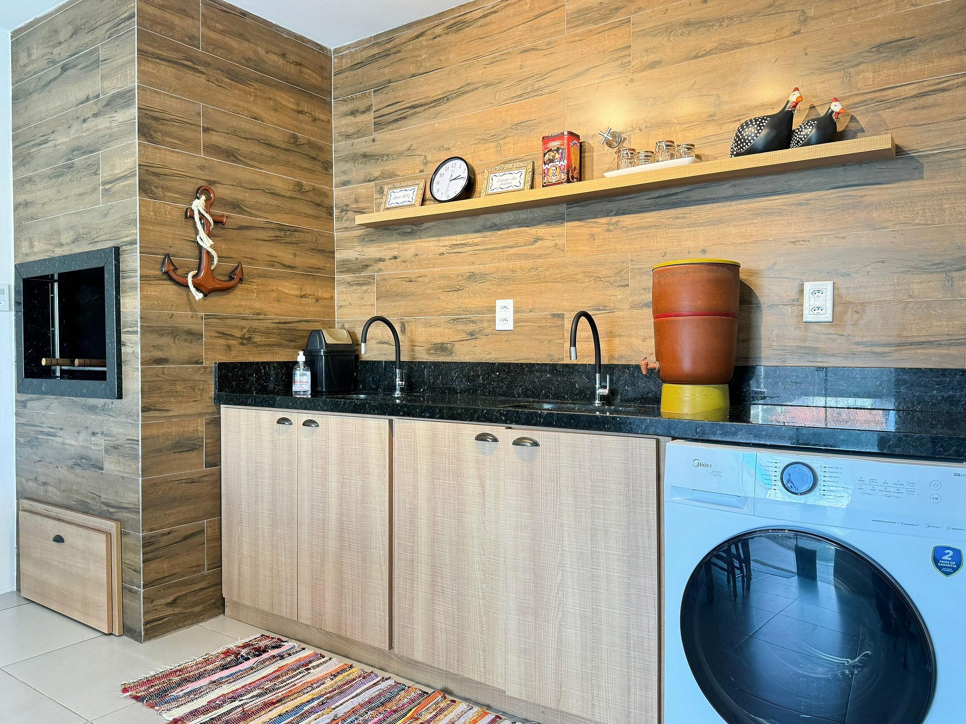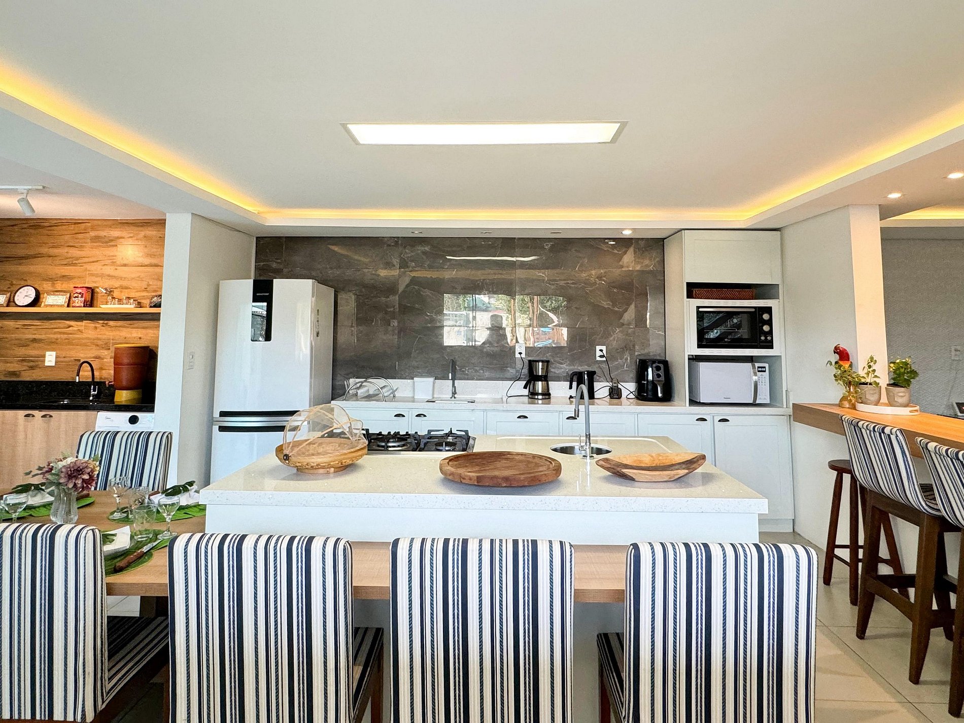 A cozinha é totalmente equipada para preparar suas refeições favoritas, e uma área gourmet com churrasqueira para agradáveis momentos de confraternização.