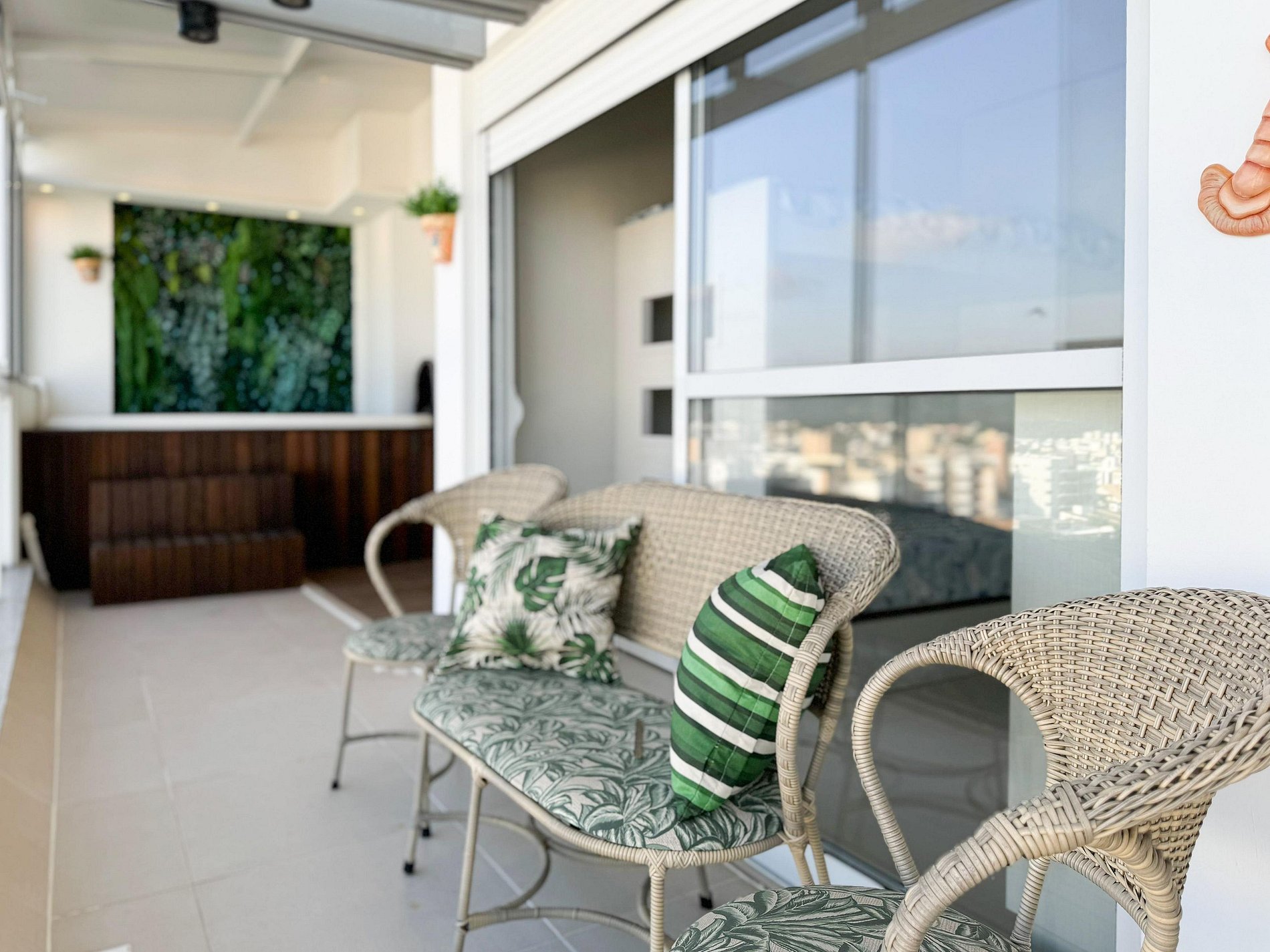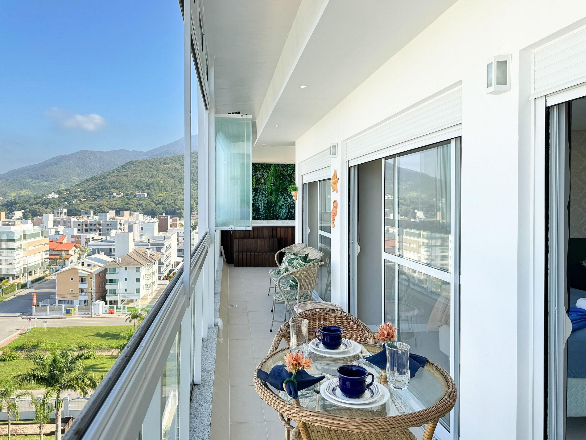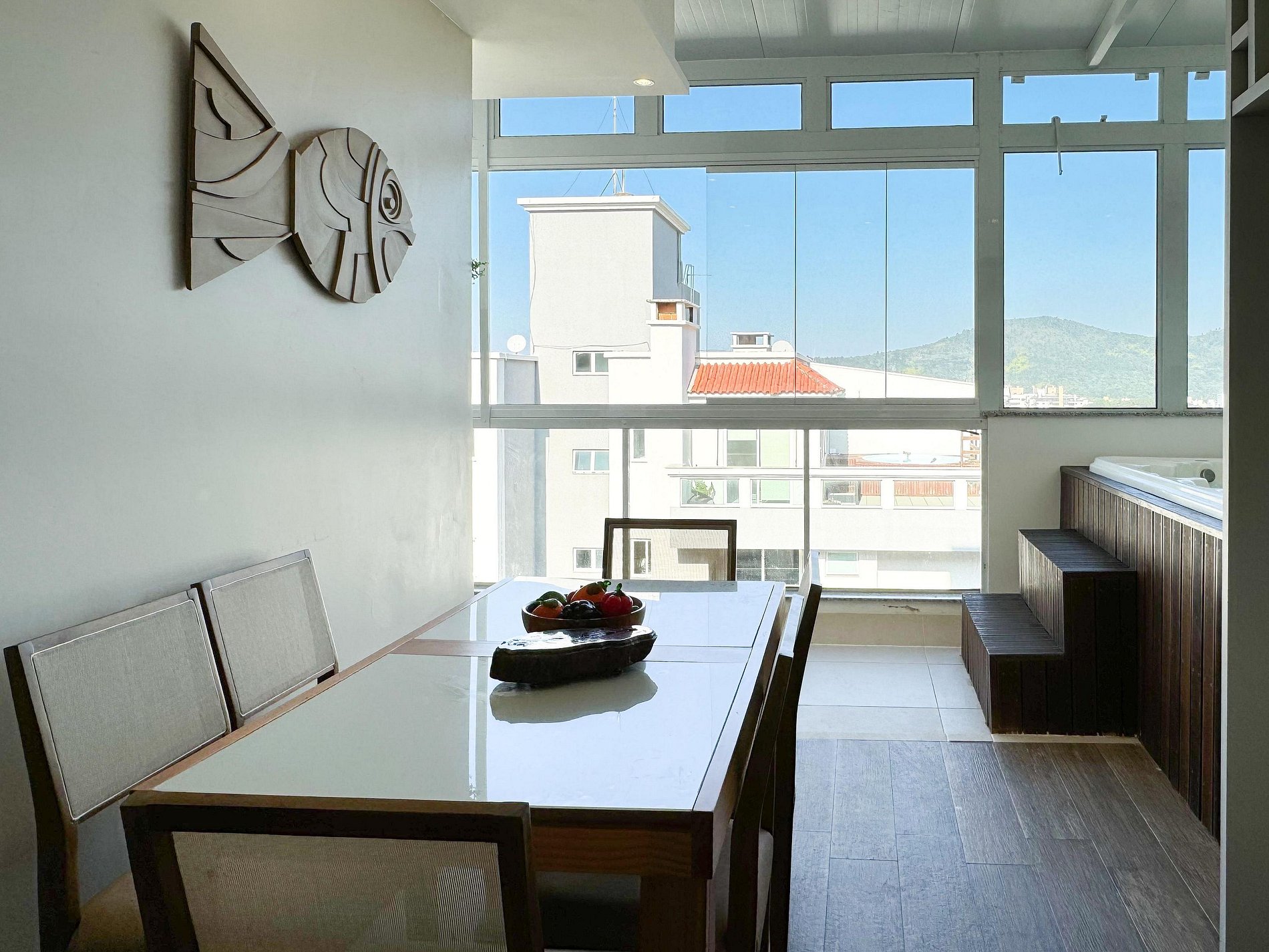 Nossa cobertura dispõe de uma jacuzzi privativa, perfeita para relaxar enquanto aprecia a vista panorâmica do oceano e um lindo nascer do sol.